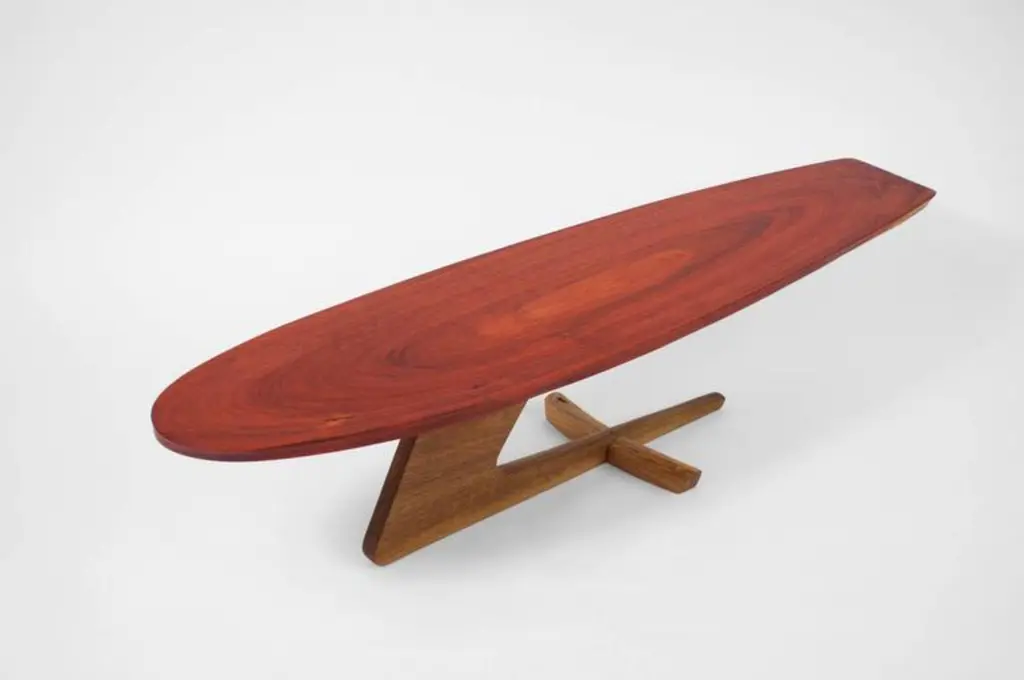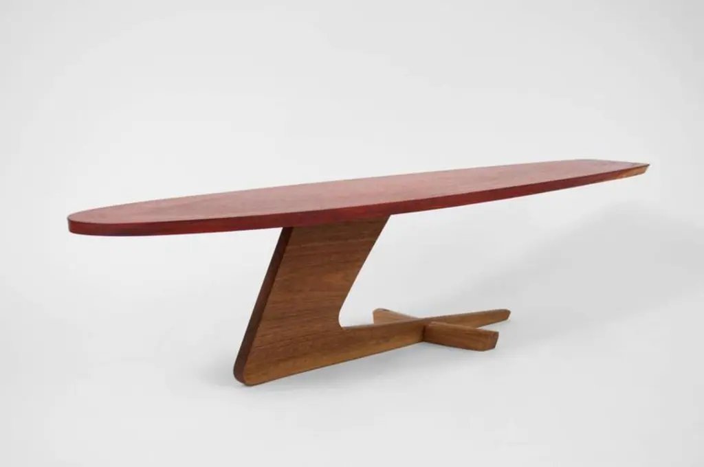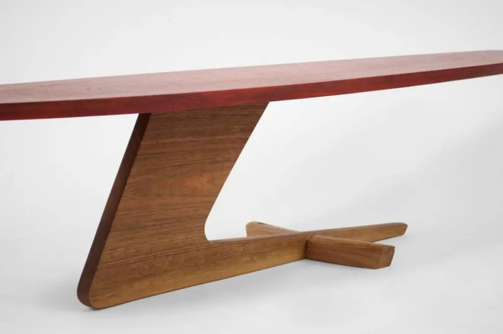 Unique signed table by Jörg PietschmannSide table, padouk, European walnut, T1325measures: H 37 x W 161 x D 42 cm tabletop 2.5 cmOval shaped segment of a padouk treeon a specially designed base.Polished oil finish.In Pietschmann’s sculptures, trees that for centuries were part of a landscape and founded in primordial forces tell stories inscribed in the memory of their fibers.The forms Jörg Pietschmann pares from ancient trees are extensive and astonish with their physical presence, a combination of elegance and primeval nature. Pietschmann’s sculptures are monuments to the trees from which they derive.Being endowed with the ruggedness of primeval matter gives them a veritable vitality: figures that appear to have grown into their sculptural form of their own accord. But Pietschmann’s tangibly present bodies have undergone a considerable degree of metamorphosis.In order to generate these unique tree specimens he examines the tree’s morphology and intrinsic inner map until the courses of its grain, of a curve, knots and cracks concur with his projections. The exploratory process is accompanied by constant modification, giving at the start of each new piece no more than an intimation of the figure that will later emerge. In their completion, Pietschmann’s sculptures once more become universal form.Jörg Pietschmann`s workshop is situated on the countryside close to Hamburg. He works with indigenous timber as oak, lime tree, beech, poplar, olive tree and maple felled by the wind or human hand, together with tropical timber found on his travels.