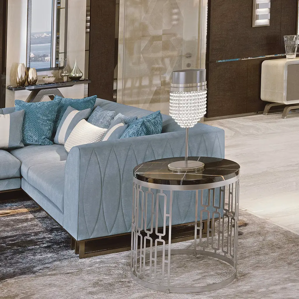 This decorative side table boasts an intricate geometric metal base, characterized by a satin palladium metal finish. A black Sahara marble top adds a refined touch, bringing a warm, natural feel to the home with its combination of rich tones. The Unique Urban Chic Side Table is guaranteed to instantly elevate any interior space.