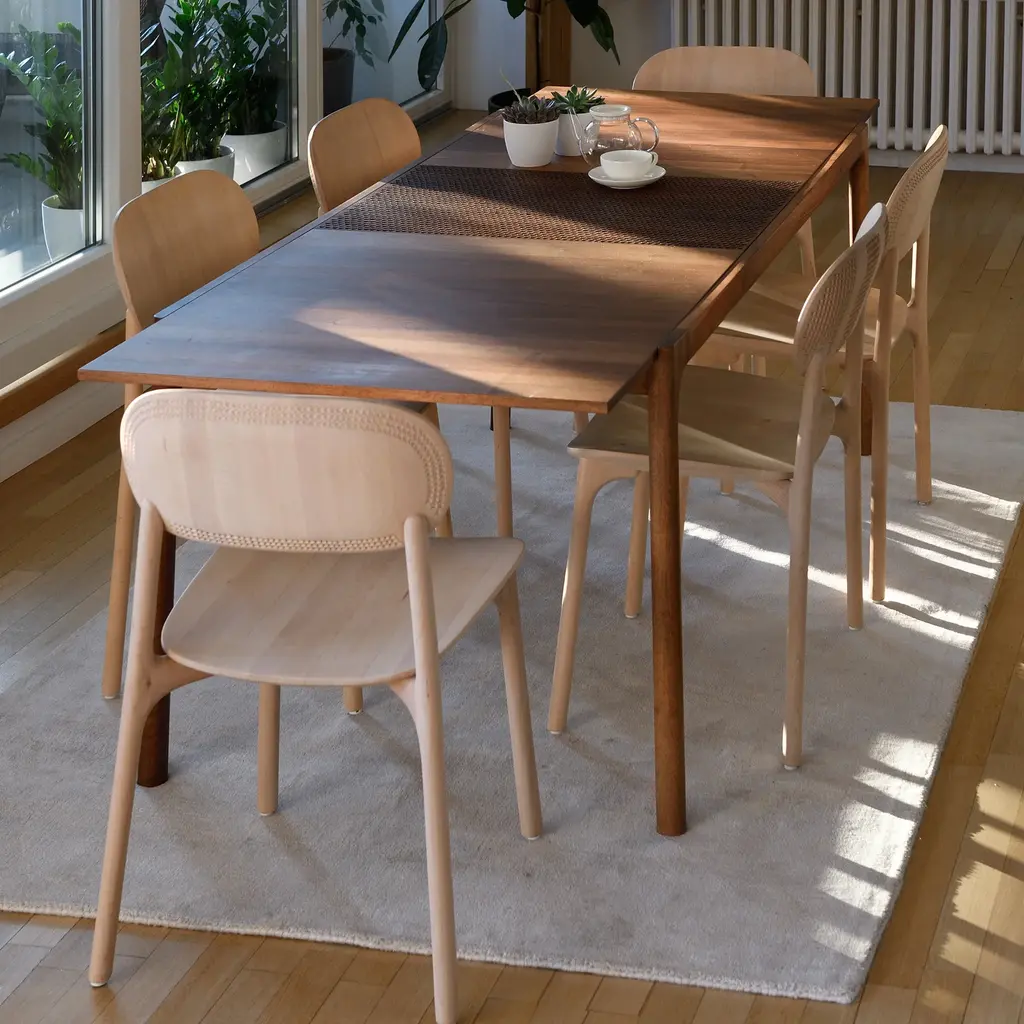 Along with Unna’s graceful lines, Zanat adds an extendable version of designer Monica Förster’s dining table with extension leafs in a lace-like pattern. Fitting into the middle of the tabletop, the hand-carved insets catch the play of light and provide a tactile counterpoint. Completely realized in sustainably sourced solid wood, the table offers versions with 1 or 2 extension leafs to match the color of the table (or contrast in black and white maple), stored underneath the tabletop and easily deployed with the handmade extension mechanism.