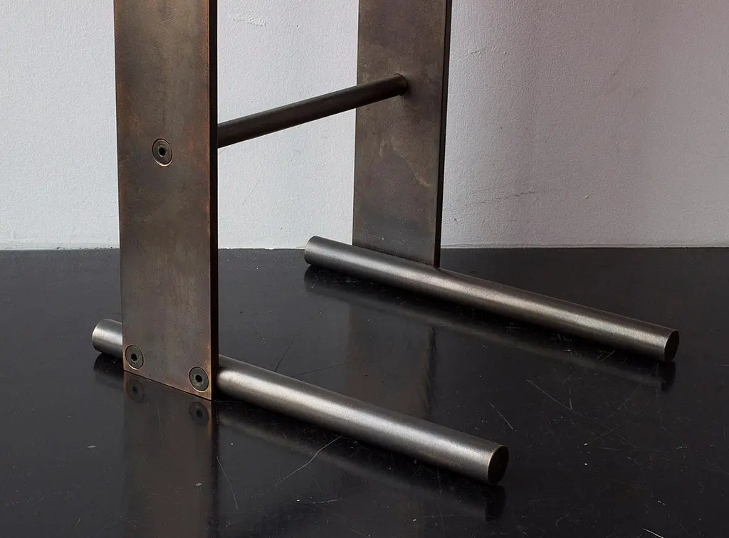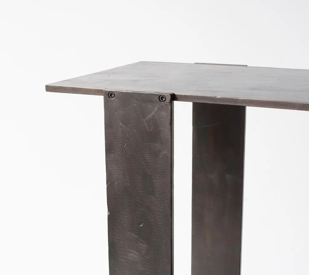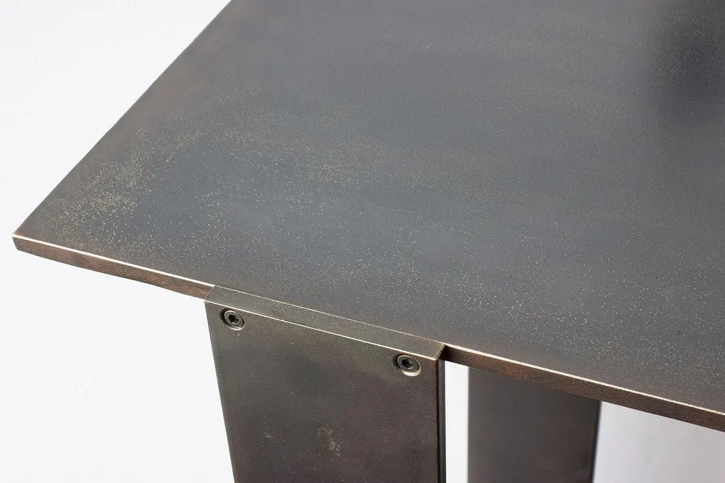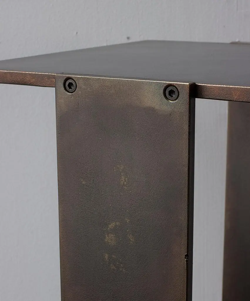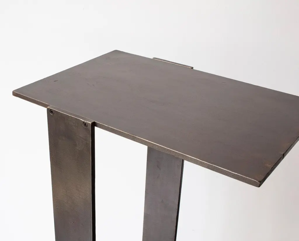 Solid machined matte blackened brass with recessed hex-head fasteners. "Matte Blackened Brass" is a heavily textured, roughened finish with tool markings and edge-wearing to invoke the patina of an antique machine. Please compare the example photos carefully before ordering. All material finishes are living finishes: they will change and patina for the better with time and use. Petite sized to pull up next to a sofa or reading chair; works well as a drink tray or book Stand.Every product is individually hand assembled; slight variations in color, size and shape are to be expected. Overall size 20” H x 12” D x 8-1/2” W.Matte blackened brass components are waxed and can be buffed with a soft dry cloth. Never clean with any liquid products or detergents.Each piece is made to order; returns are not accepted. Each piece is individually hand-made to order and slotted in frequent production batches; exact lead time is determined once order is placed.Please confirm brass finish when placing order; price shown for Matte Blackened brass.