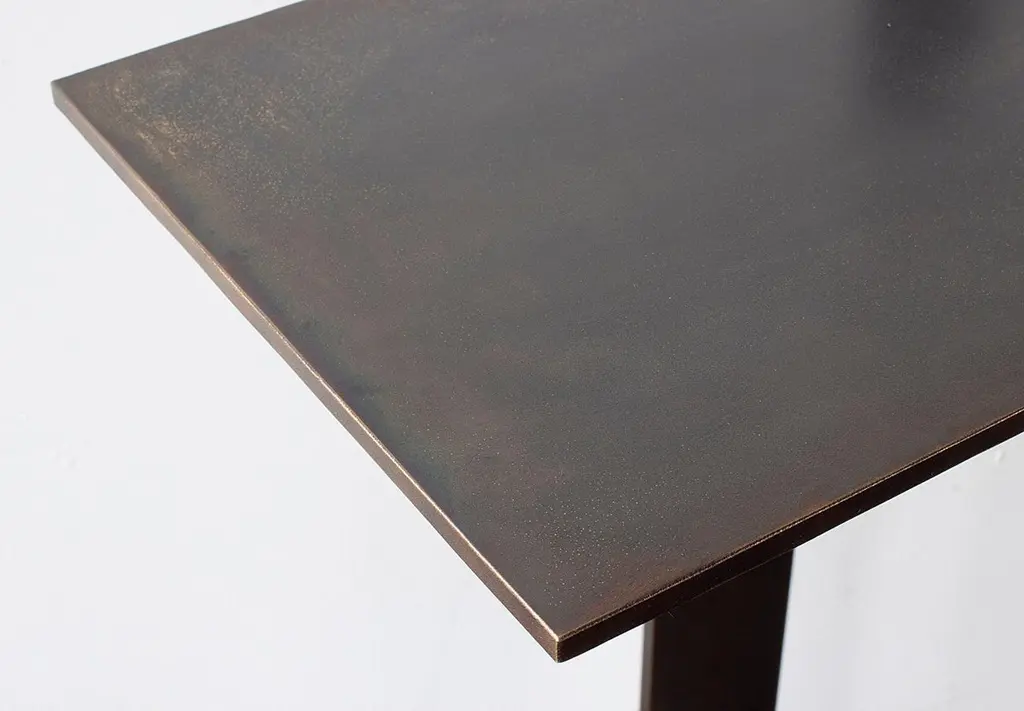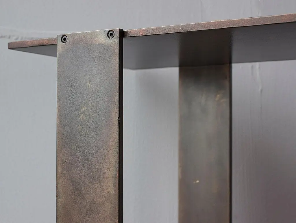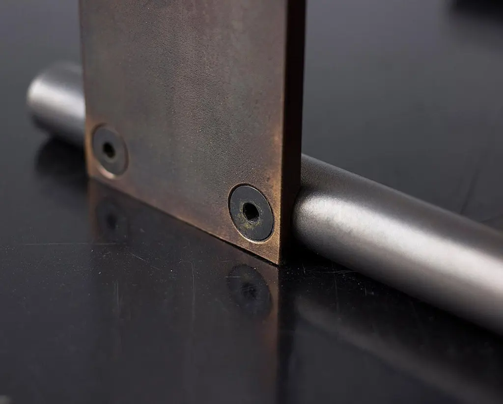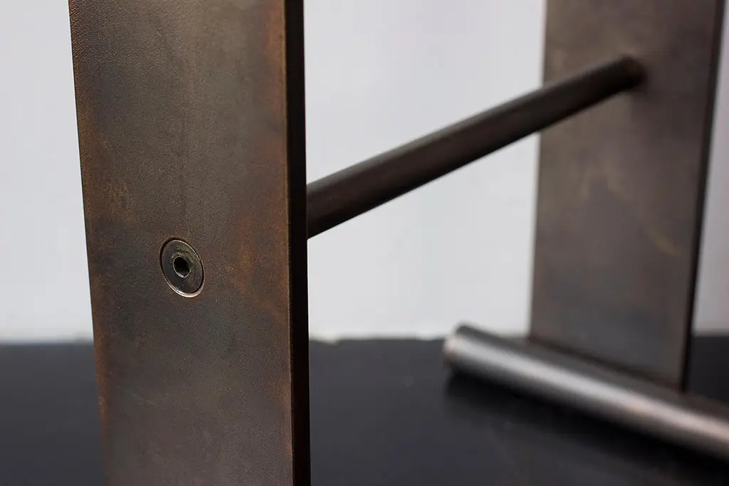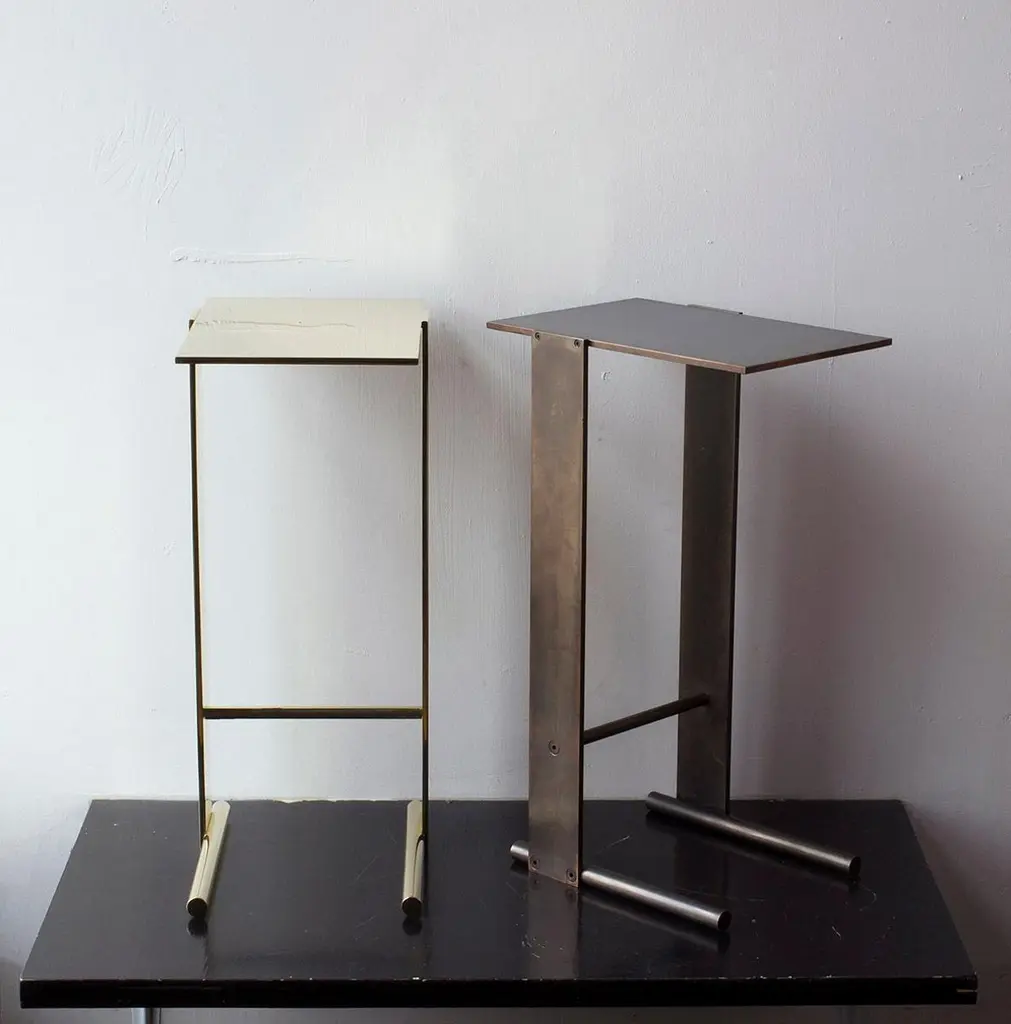 Solid machined matte blackened brass with recessed hex-head fasteners. "Matte Blackened Brass" is a heavily textured, roughened finish with tool markings and edge-wearing to invoke the patina of an antique machine. Please compare the example photos carefully before ordering. All material finishes are living finishes: they will change and patina for the better with time and use. Petite sized to pull up next to a sofa or reading chair; works well as a drink tray or book Stand.Every product is individually hand assembled; slight variations in color, size and shape are to be expected. Overall size 20” H x 12” D x 8-1/2” W.Matte blackened brass components are waxed and can be buffed with a soft dry cloth. Never clean with any liquid products or detergents.Each piece is made to order; returns are not accepted. Each piece is individually hand-made to order and slotted in frequent production batches; exact lead time is determined once order is placed.Please confirm brass finish when placing order; price shown for Matte Blackened brass.