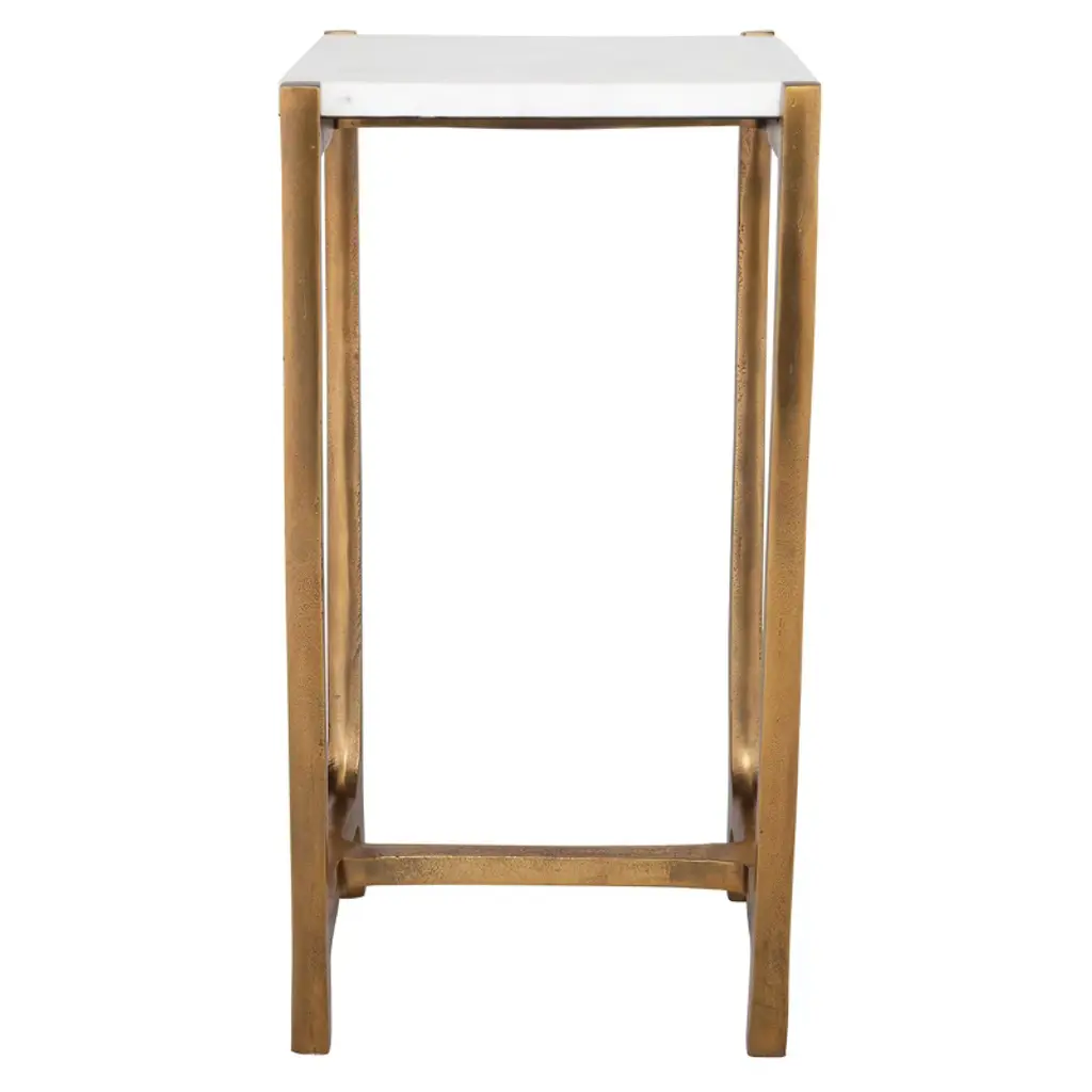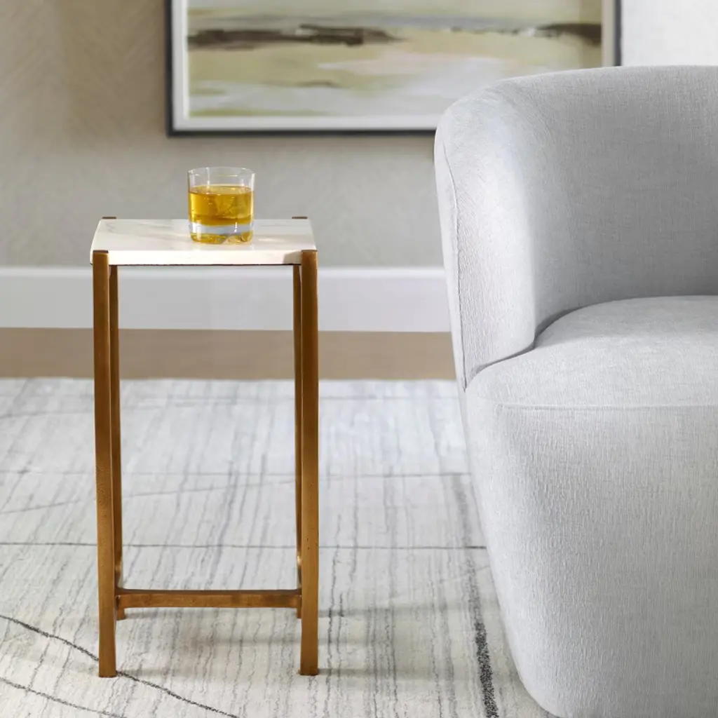 With Understated Sophistication, The Affinity Accent Table Complements With Ease. Featuring A Shapely Cast Aluminum Base In Antique Gold That Encapsulates A Natural White Marble Top. True To The Nature Of Natural Materials, Each Piece Will Have Unique Marbling And Veining Throughout. The Uttermost 24995 Affinity White Marble Accent Table is a stylish and functional piece designed to enhance various interior settings. This accent table features a natural white marble top, each with unique marbling and veining, supported by a shapely cast aluminum base in an antique gold finish. Key Features: Design: The table showcases an understated sophistication with its natural white marble top and antique gold-finished aluminum base, making it a versatile addition to both traditional and contemporary interiors. Materials: Top: Natural white marble, offering a timeless and elegant surface. Base: Shapely cast aluminum with an antique gold finish, providing stability and a touch of metallic warmth. This accent table's combination of natural materials and refined design makes it suitable for living rooms, bedrooms, or offices, serving both functional and decorative purposes.
