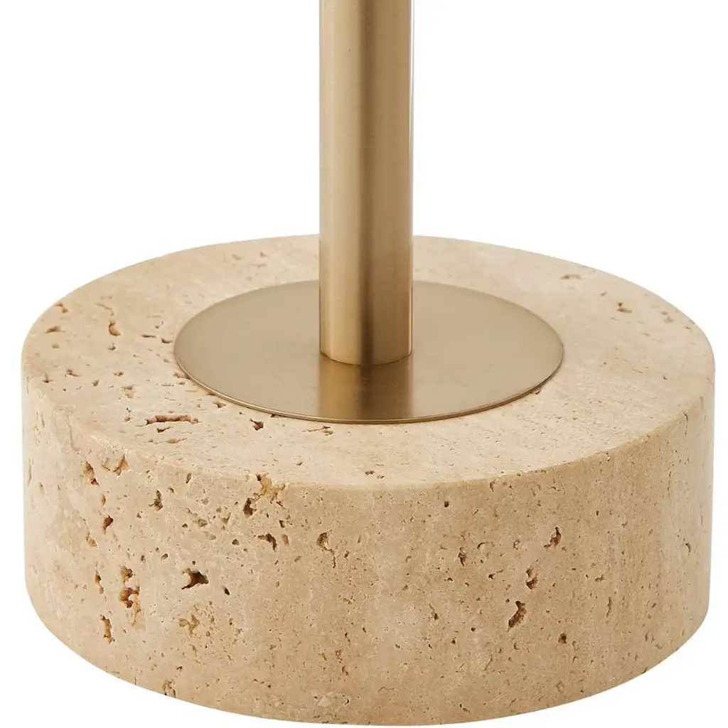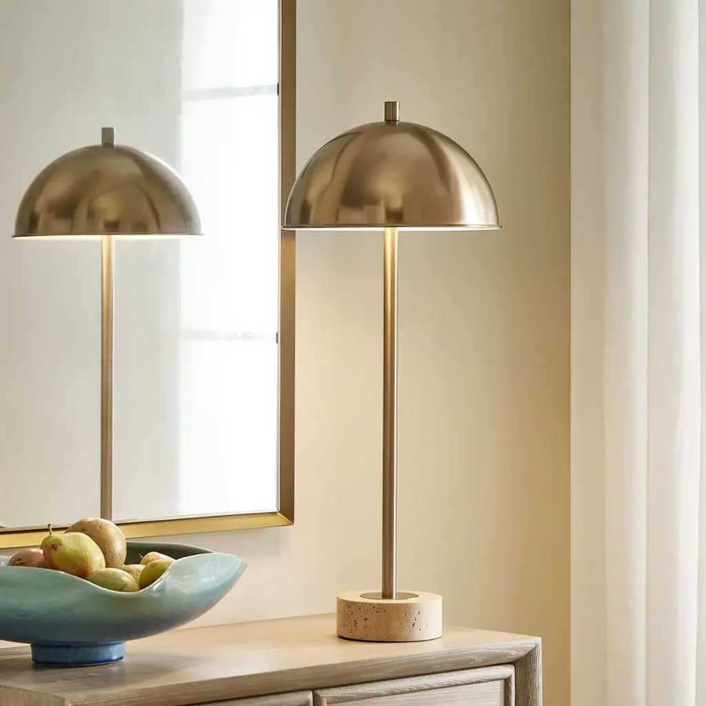 Bring refined elegance to your space with the Uttermost Dunham Brass Buffet Lamp, a sophisticated lighting accent that blends modern artistry with natural elements. Standing at 28.25 inches high and 11.75 inches wide and deep, this buffet lamp features a dome-shaped iron shade in a rich brass-plated finish that casts a warm, ambient glow. The solid travertine base introduces earthy texture, perfectly balancing the industrial charm of the gold-toned metal. Ideal for dining buffets, entryway consoles, or bedside tables, the Dunham lamp complements transitional, modern classic, and upscale rustic interiors. Its clean silhouette, quality craftsmanship, and designer appeal make it a striking decorative statement in any room. Key Benefits Elegant Height & Structure: At 28.25" tall, it's the perfect height to add layered lighting to buffets, consoles, or nightstands. Warm Decorative Glow: The brass dome shade casts a soft, ambient light, enhancing room warmth and elegance. Natural Texture Accent: Crafted with a travertine base, it brings natural stone character into modern interiors. Versatile Styling: Suits transitional, contemporary, and classic spaces, from dining areas to formal foyers. Durable Craftsmanship: Built from iron and stone, it’s engineered for long-lasting visual and structural integrity. Statement Finish: The rich brass-gold finish adds a luxurious touch without overwhelming your decor.