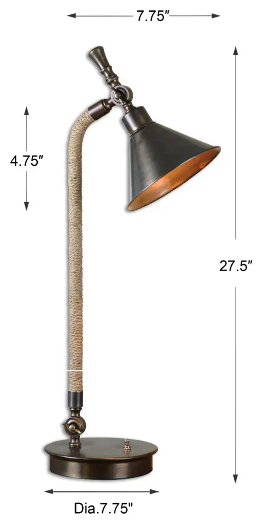 Shine a new light on your carefully curated decor with the Duvall Task Lamp. This lamp features a metal base finished in a plated oxidized bronze and accented with a wrapped tea-stained rope around the neck. The base arm and shade pivot up and down. When placed on a side table or desk, the Duvall lamp keeps your space out of the shadows. This lamp will fit right in with your traditional decor.Voltage: 110# of Lights: 1Shade Size: Height: 4.75, Top: 0W x 0D, Bottom: 7.25W x 7.25DWattage: 40WBulb Quantity: 1Bulb Type: TYPE ASocket Type: ON-OFFUttermost''s Lamps combine premium quality materials with unique high-style design. With the advanced product engineering and packaging reinforcement, Uttermost maintains some of the lowest damage rates in the industry. Each product is designed, manufactured and packaged with shipping in mind. Bob and Belle Cooper founded The Uttermost Company in 1975, and it is still 100% owned by the Cooper family. The Uttermost mission is simple and timeless: to make great home accessories at reasonable prices. Inspired by award-winning designers, custom finishes, innovative product engineering and advanced packaging reinforcement, Uttermost continues to deliver on this mission.For over 30 years, Uttermost has enjoyed steady growth with over 200 employees working in its Rocky Mount, Virginia factories totaling 600,000 square feet. It also has a factory in China and a state-of-the-art West Coast distribution center for increased capacity and faster shipping to West Coast retailers and customers. Uttermost is proud to support many of the world''s most prestigious home-furnishing customers with its products and services. Uttermost believes its success is largely based on its commitment to three key principles: proving superior customer service, maximizing product value through great design and sharp pricing, and treating its employees, sales representatives and designers as partners in business.Bulb Type: TYPE A ON-OFFNumber of Bulbs: 1Bulbs Included: noUL Listed: yesBulb Wattage: 40WHardwire or Plug: plug