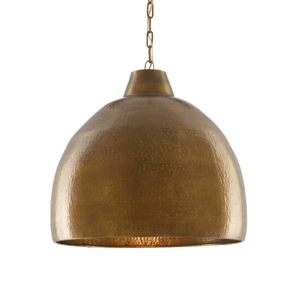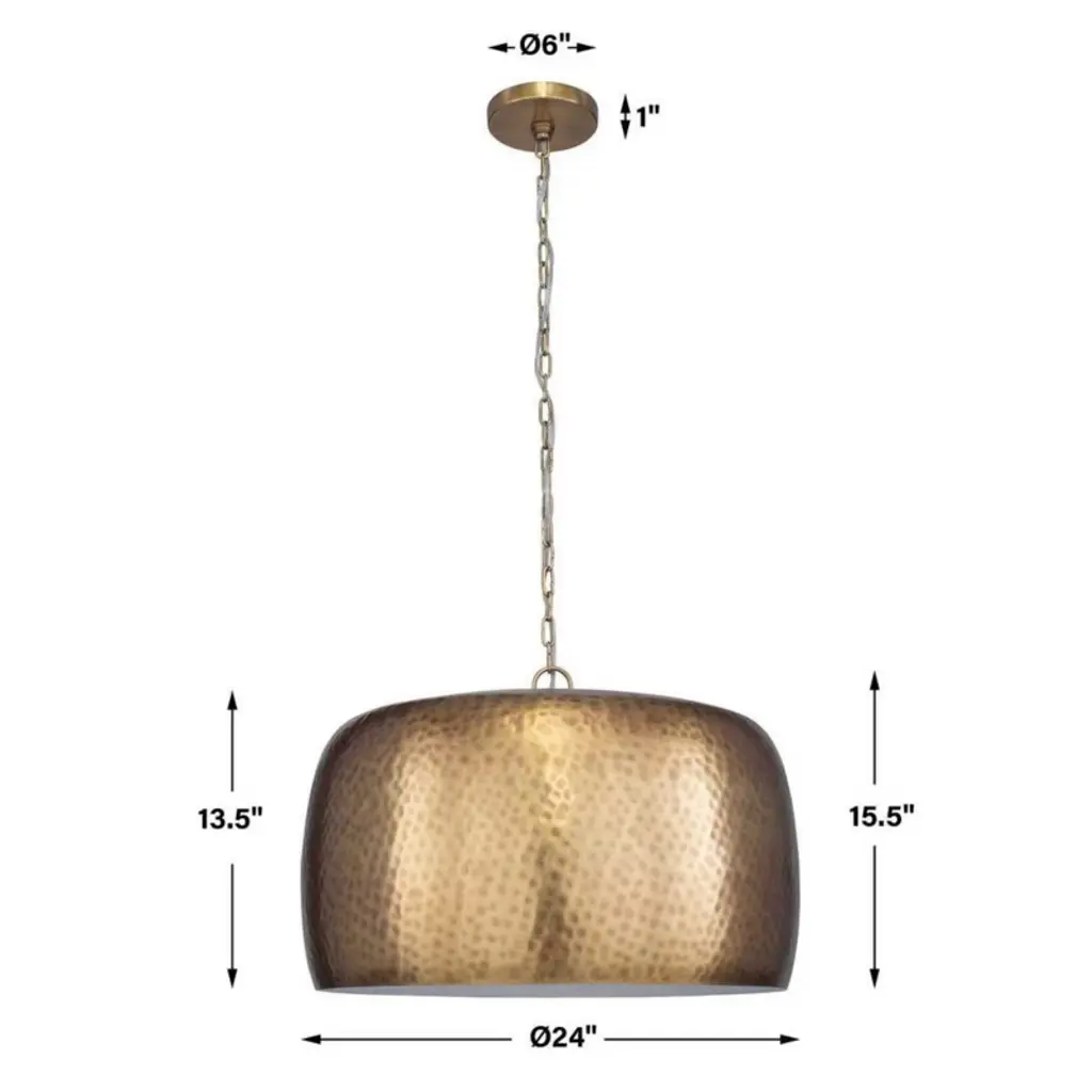 Lemont 1-Light Pendant-Unique Antique Brass with Adjustable Chain A modern twist on a classic form, the Lemont 1-Light Pendant features a hand-hammered dome in rich Antique Brass. The softly squared edge and artisanal detailing create a warm, organic texture, with each piece showing subtle variations in size and pattern due to the handcrafted process (ranging approx. 23¼" to 24" in diameter). An ideal focal point over a kitchen island, dining area, or entry, this pendant includes 15 feet of wire and 5 feet of chain for flexible, customizable hanging. Key Features: Hand-Hammered Brass Dome: Unique patterns ensure no two pendants are exactly alike. Warm Antique Finish: Offers timeless appeal and pairs beautifully with classic or modern interiors. Customizable Height: Supplied with 15' wire and 5' chain for adjustable installation. Compatible with Edison Bulb: 1 socket (E26), supports up to 60W (bulb not included). Dimensions: 15.5"H x 24" W x 24" D A handcrafted statement light with timeless warmth and artisanal charm.