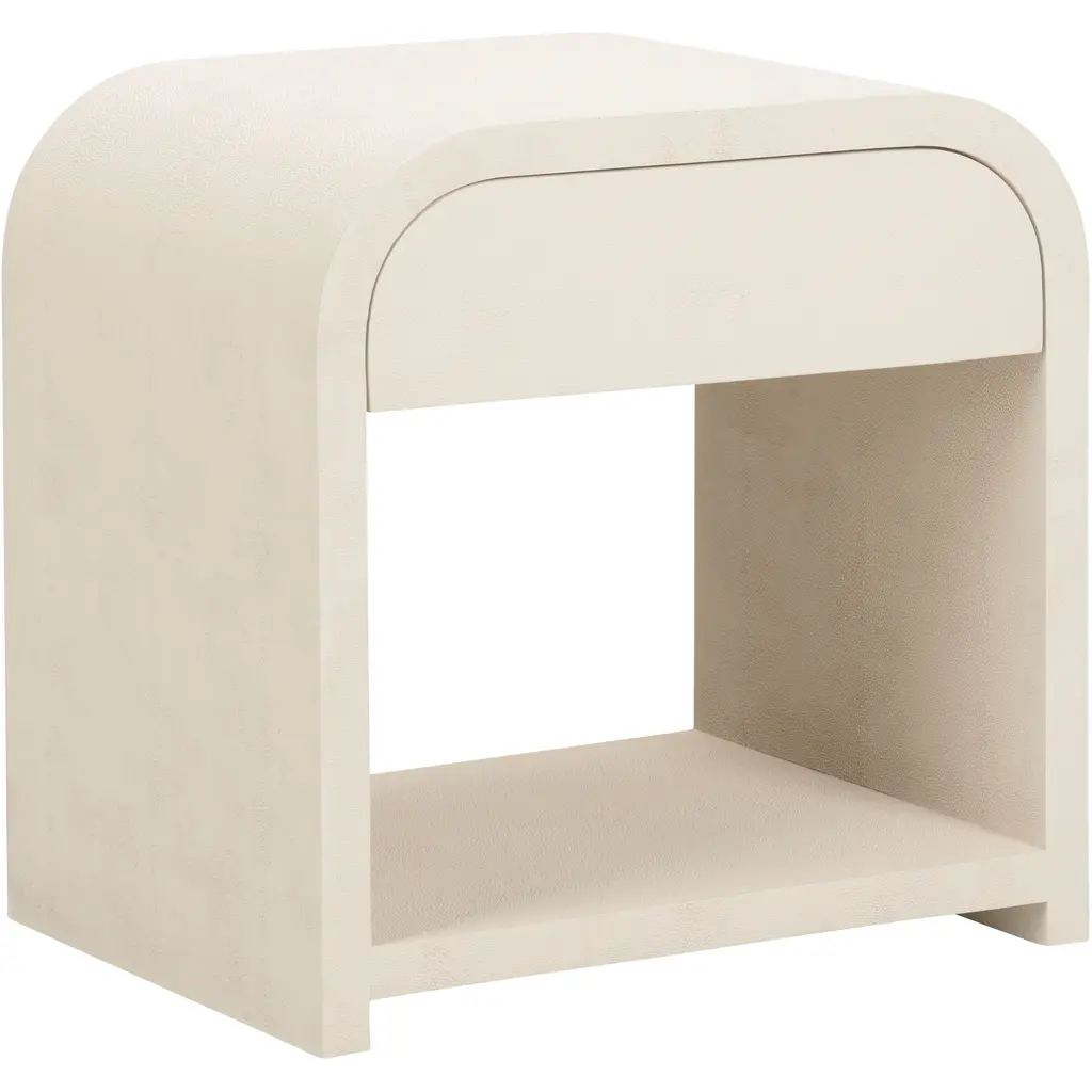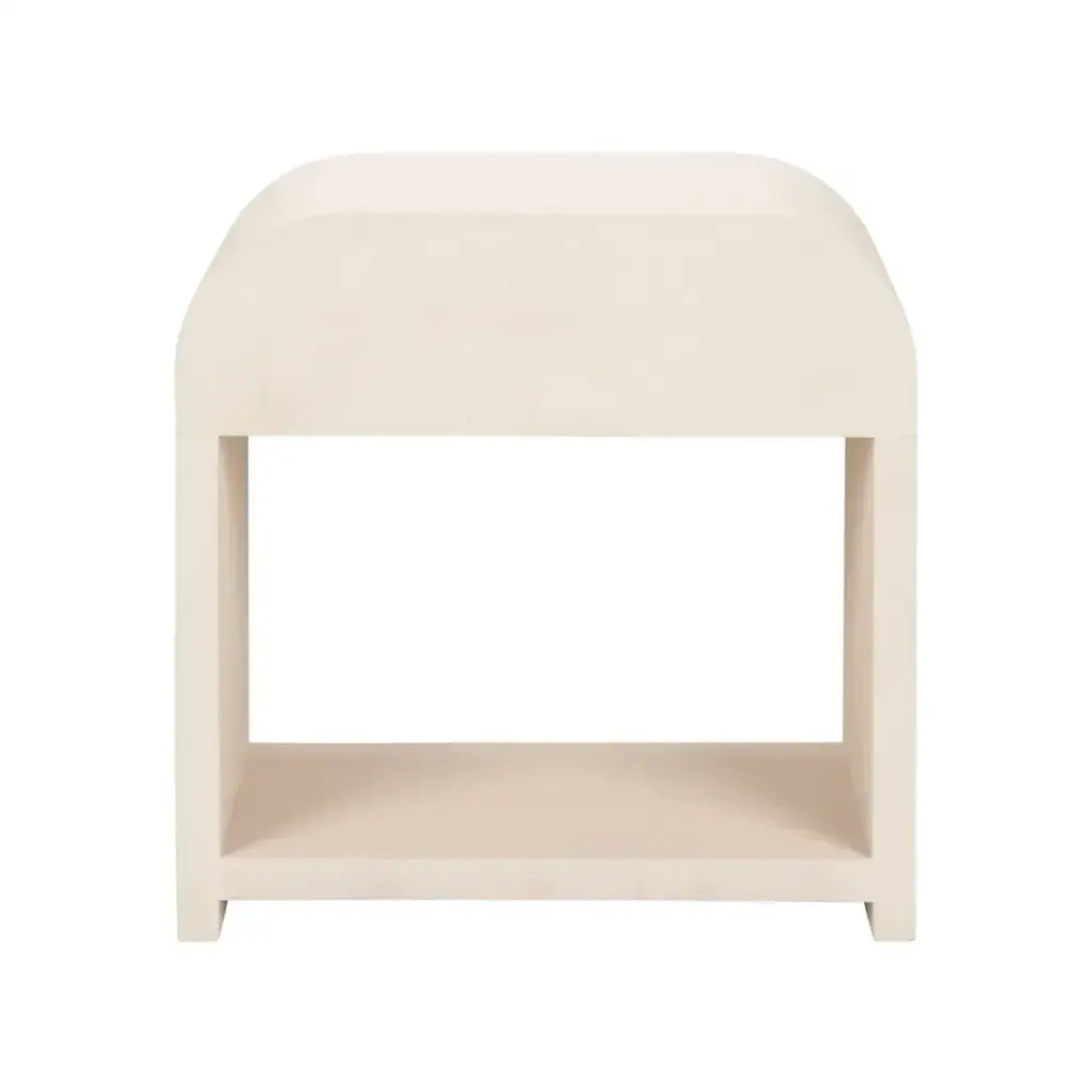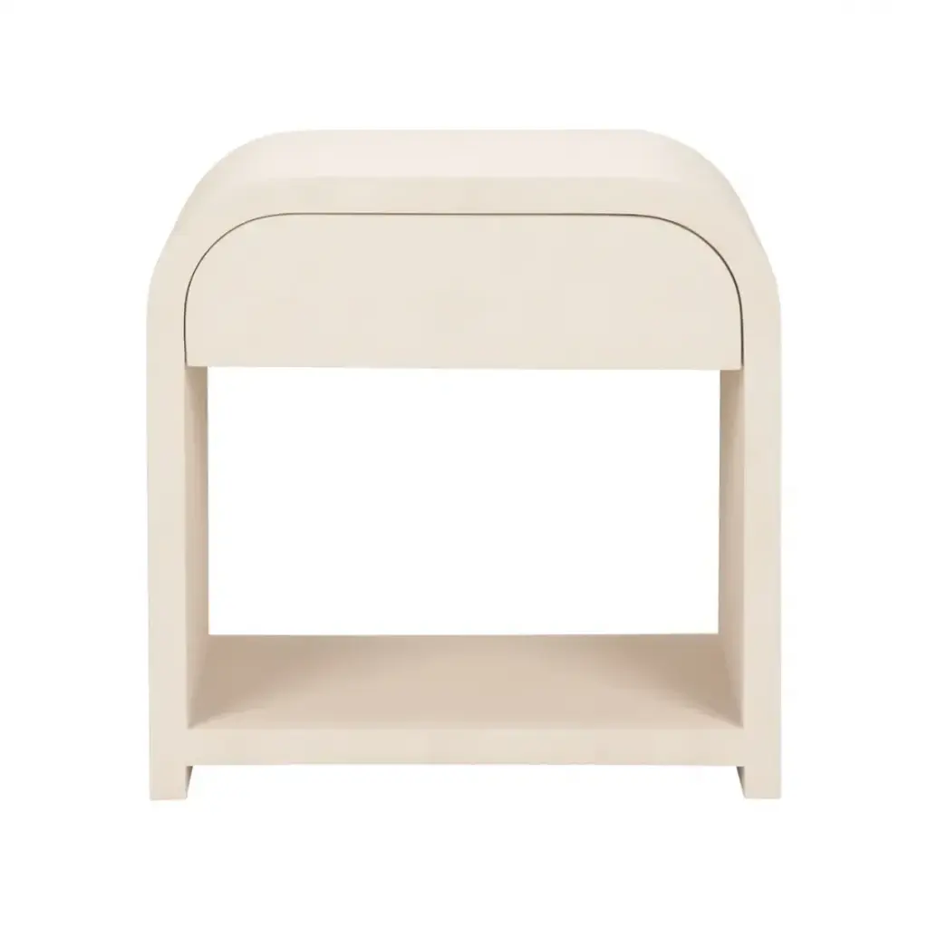 Whether used as a bedside companion, a stylish accent in the living room, or a functional piece in a cozy reading nook, our the Vail Side Table in cream faux shagreen adds a touch of sophistication to any room. Designed by Elizabeth Wicker.