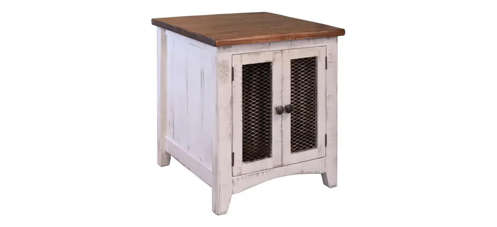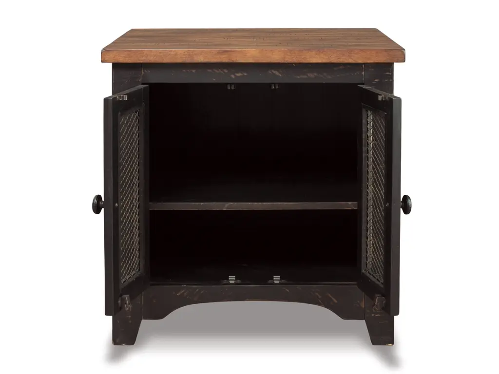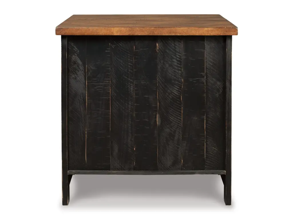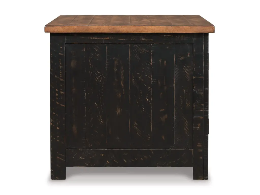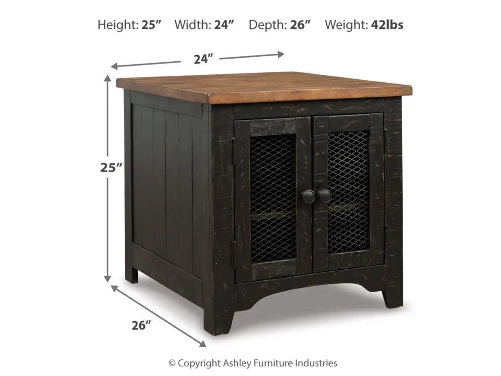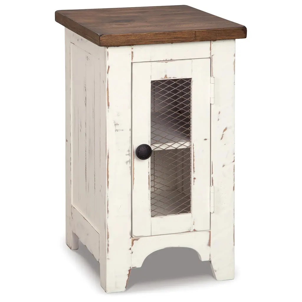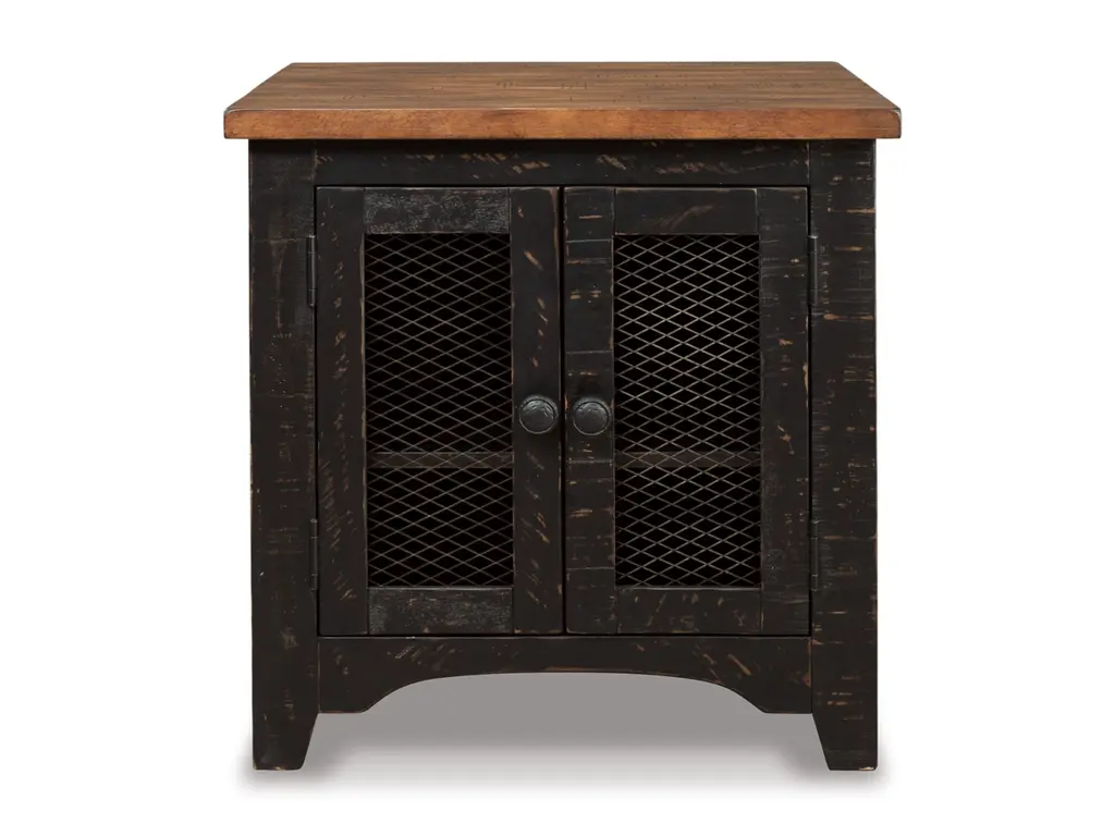 To those with an eye for the best in rustic farmhouse living, the two-tone Valebeck end table doubles up on charm. Designer touches include plank-effect styling, distress marks and wire mesh door fronts for added character.