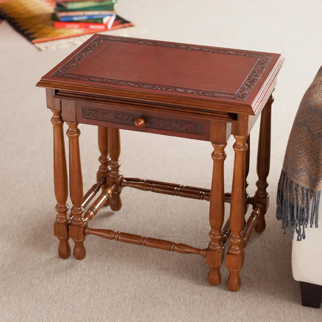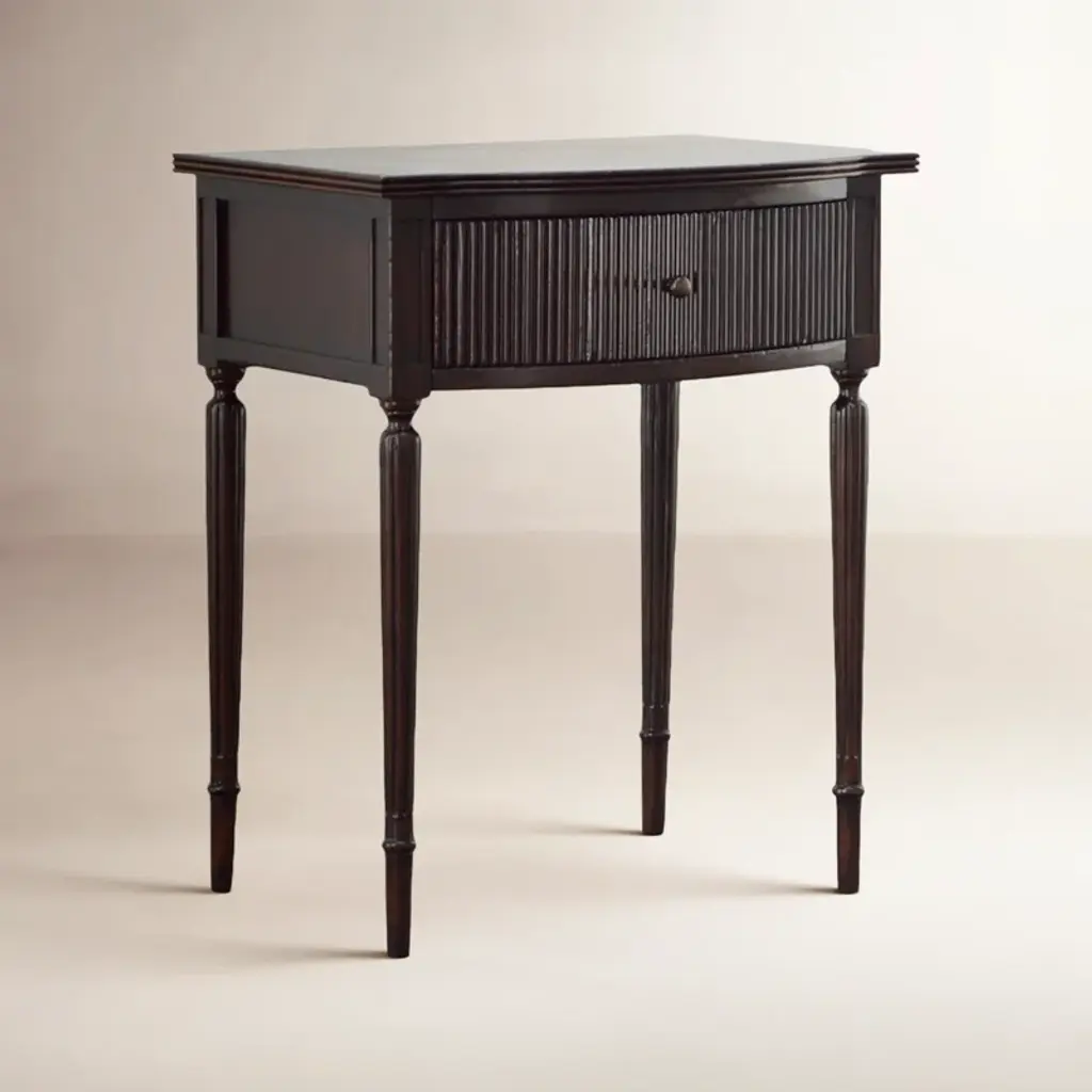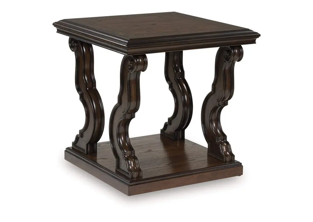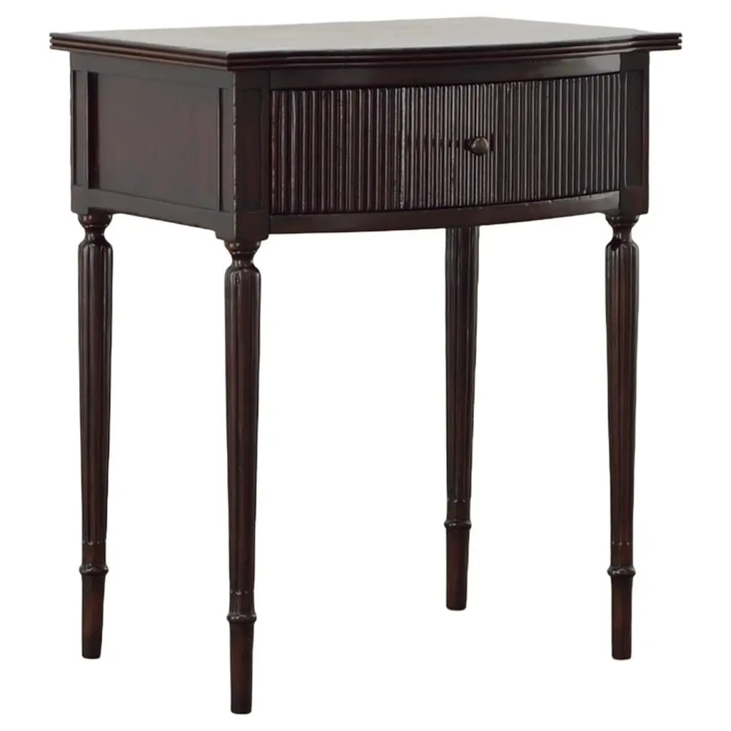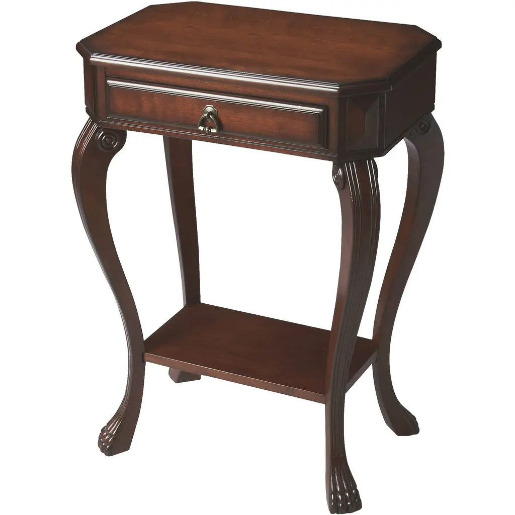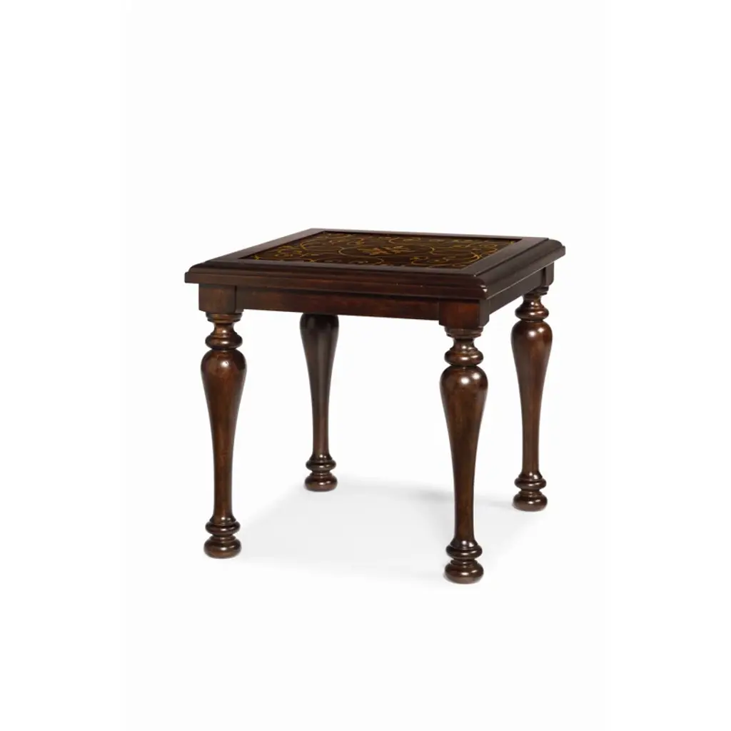 Bernhardt Occasional offers a range of upscale designs for luxe living spaces. Exuding traditional charm, the Valencia end table joins trumpet legs with an embossed metal inset top. The intricate scrolled pattern is bordered by cherry veneers with a rich and luxurious tone. Turned legs with bun feet achieve an elegant antique look perfect for traditional and transitional styles.