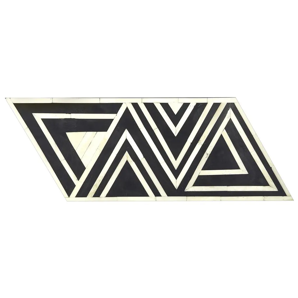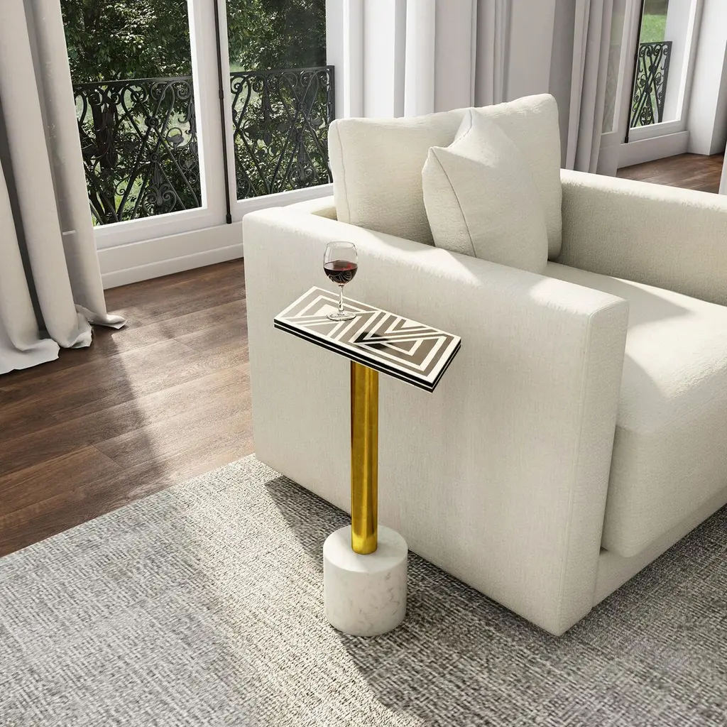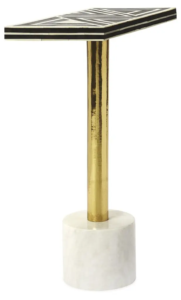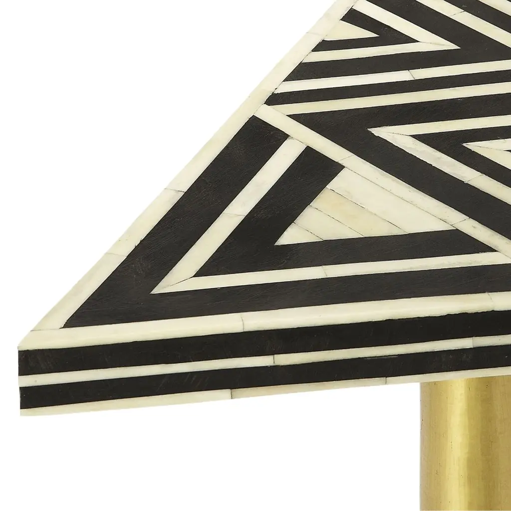 This standout side table recalls centuries-old tradition and craftsmanship. Perched on a marble pedestal, its square surface is inlaid with hand-cut tiles of bone arranged in a geometric pattern. Variations in bone inlay are to be expected, and create unique character in each handcrafted masterpiece.