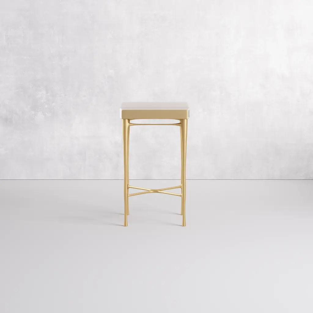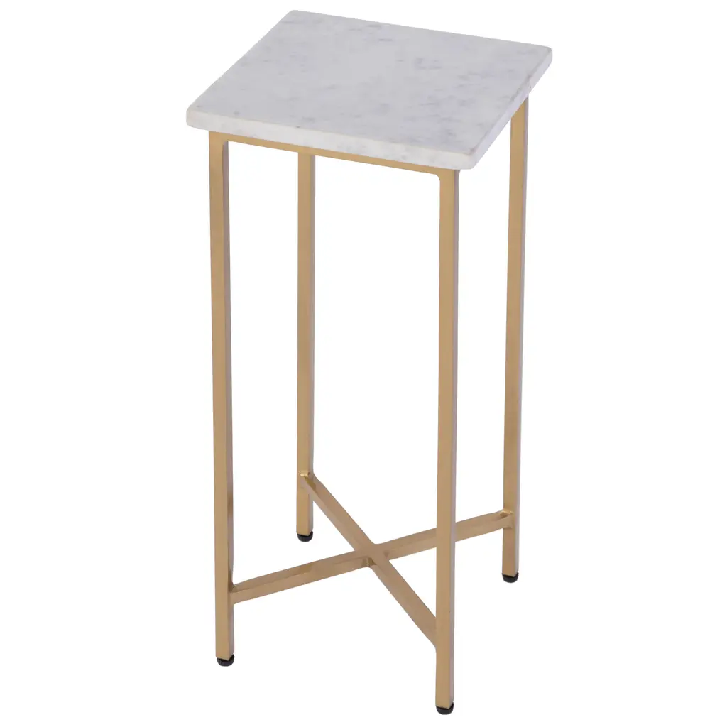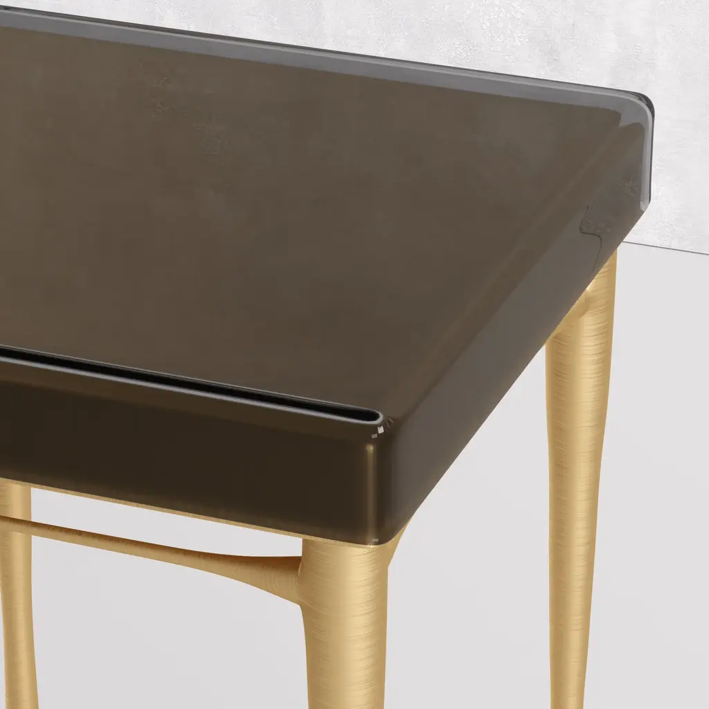 With an icy glass top and bronze legs, our Varenna side table blends traditional materials with a modern structure. The warmth of the bronze finish will create a cozy feel in your interior. Place our Varenna side table in your living room, bedroom, hallway, or entryway. The possibilities for this eye-catching accent piece are endless. Dimensions: 13.25''W x 13.25''D x 23.0''H Tear Sheet