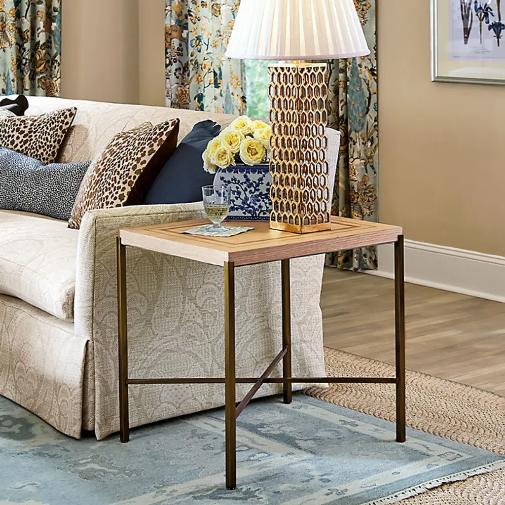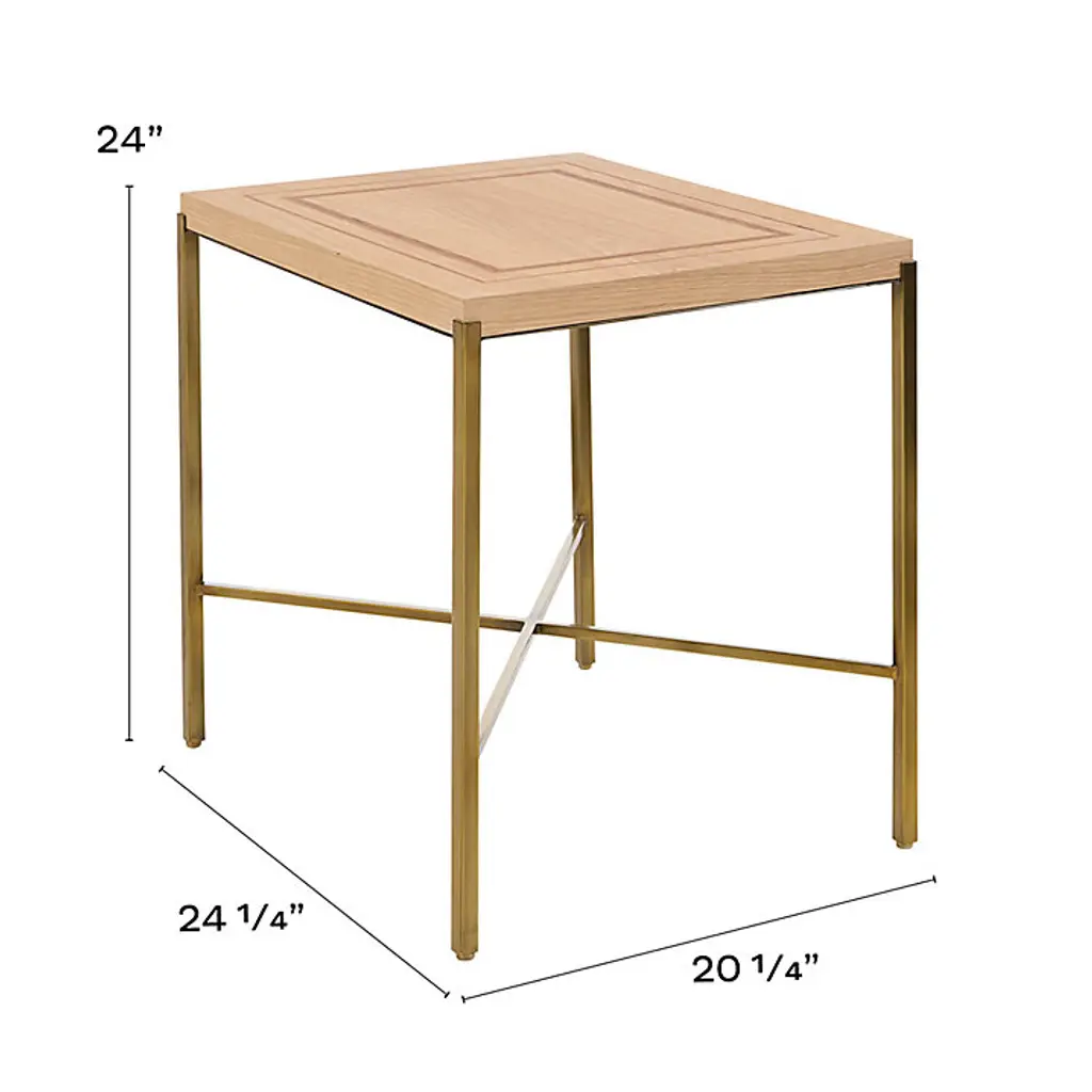 A beautiful blending of sleek, contemporary lines and fine wood craftsmanship. Our Vaughn Side Table is artisan made of natural teak inlaid by hand with alternating bands of walnut and oak to create the parquetry-inspired geometric border. The base is sculpted of stainless steel with slender, tapered legs and "X" stretcher finished in warm antique brass. The top rests within the frame for a refined, elevated look. Vaughn Side Table features:
