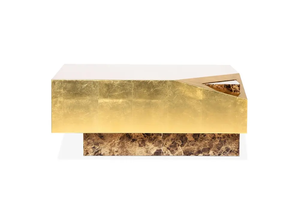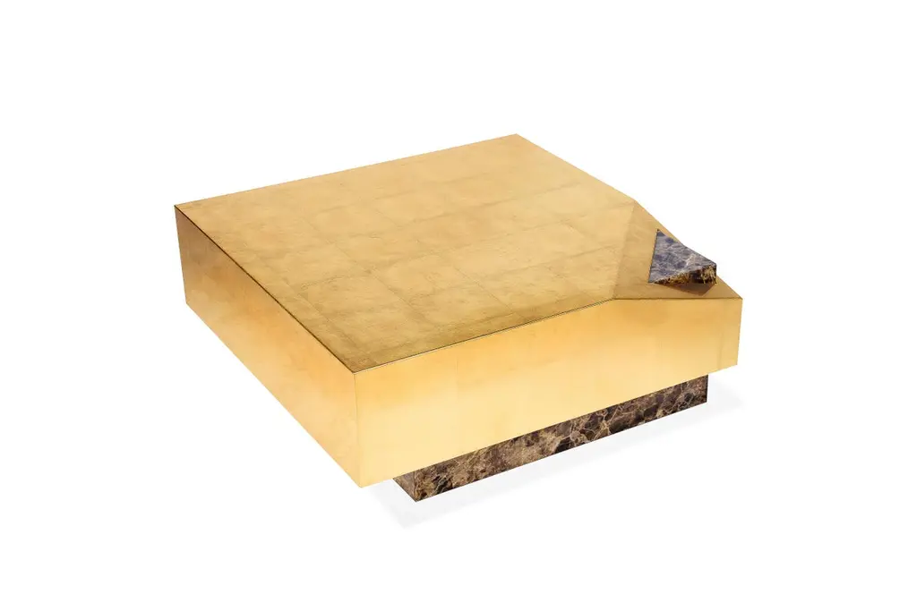 Vaz center table by Royal Stranger.Dimensions: 80 x 80 x 32 cm.Materials: Emperador Marble with polished finish with gold leaf top with glossy finish.Inspired by the merchant marine and the Portuguese Discoveries, the Vaz center table is born from a solid structure in gold leaf overlapping the second volume in Emperador marble and revealing an element that breaks the opacity effect of the piece. This piece carries us to a powerful, noble, and masculine ambiance.Royal stranger is an exclusive furniture brand determined to bring you the best unique pieces of art and design.Fusing design, art and the best craftsmanship, they strive to deliver the best state of the handmade art furniture. The design team works every day to create meaningful products that represent values such as passion, function, aesthetics and know-how. Values that are meant to represent Royal stranger’s DNA. This dedication is present at all stages of production and the combination of craftsmanship and innovative design contributes toour final purpose: to produce certified high-quality products, made with passion and expertise and using royal materials such as gold leaf, rich woods and high quality lacquers.It was in 2013, as an architects, that Sofia Santos & Rui Santos started to push the boundaries of innovation in several retail design concepts for some of the best stores in Portugal. This will has always been present in their work, and that’s how the brand was born.