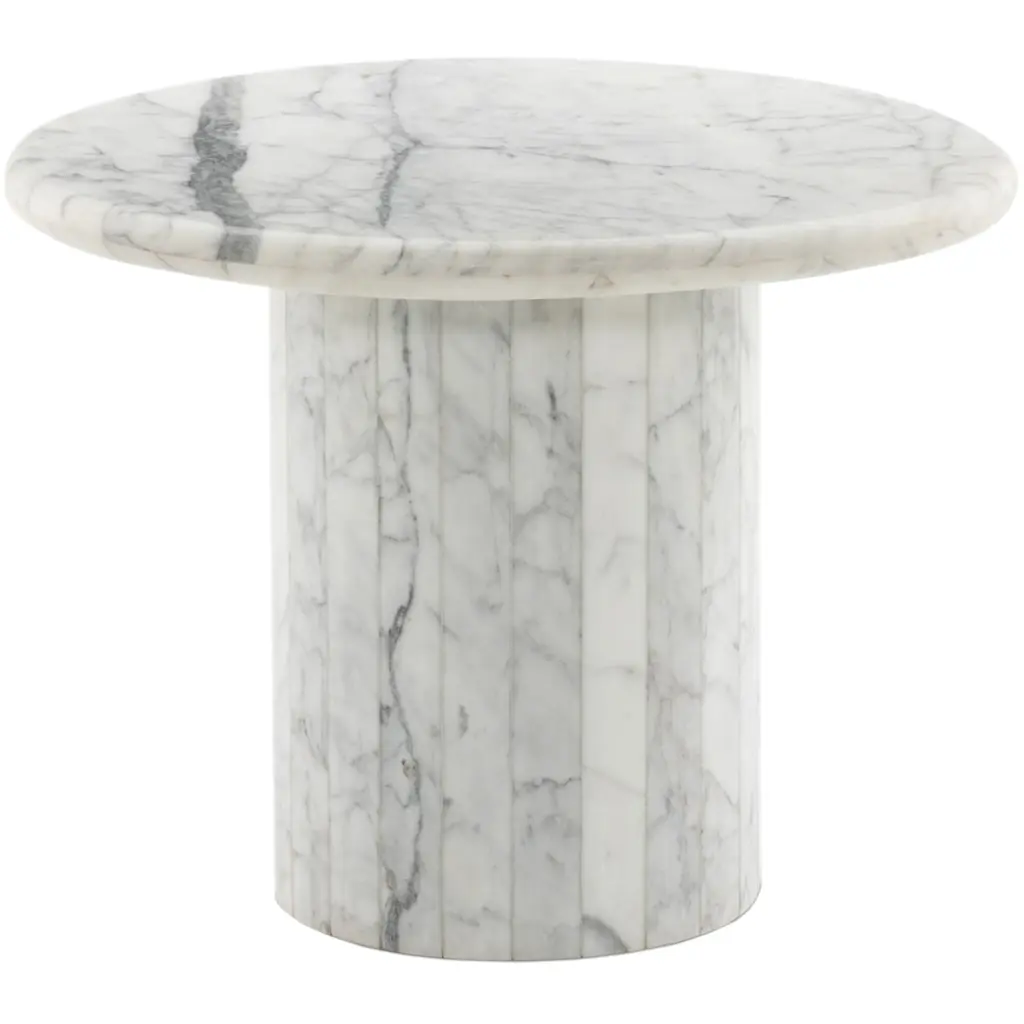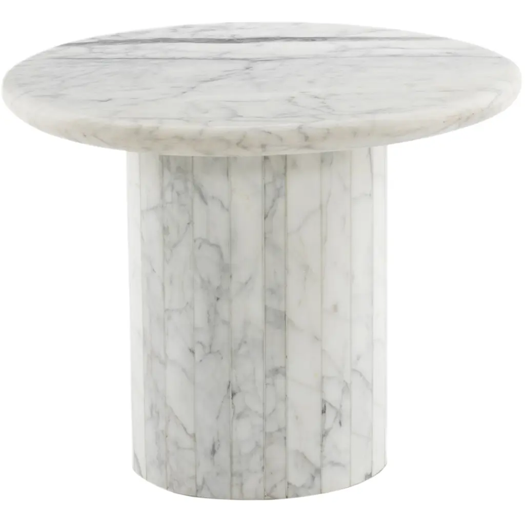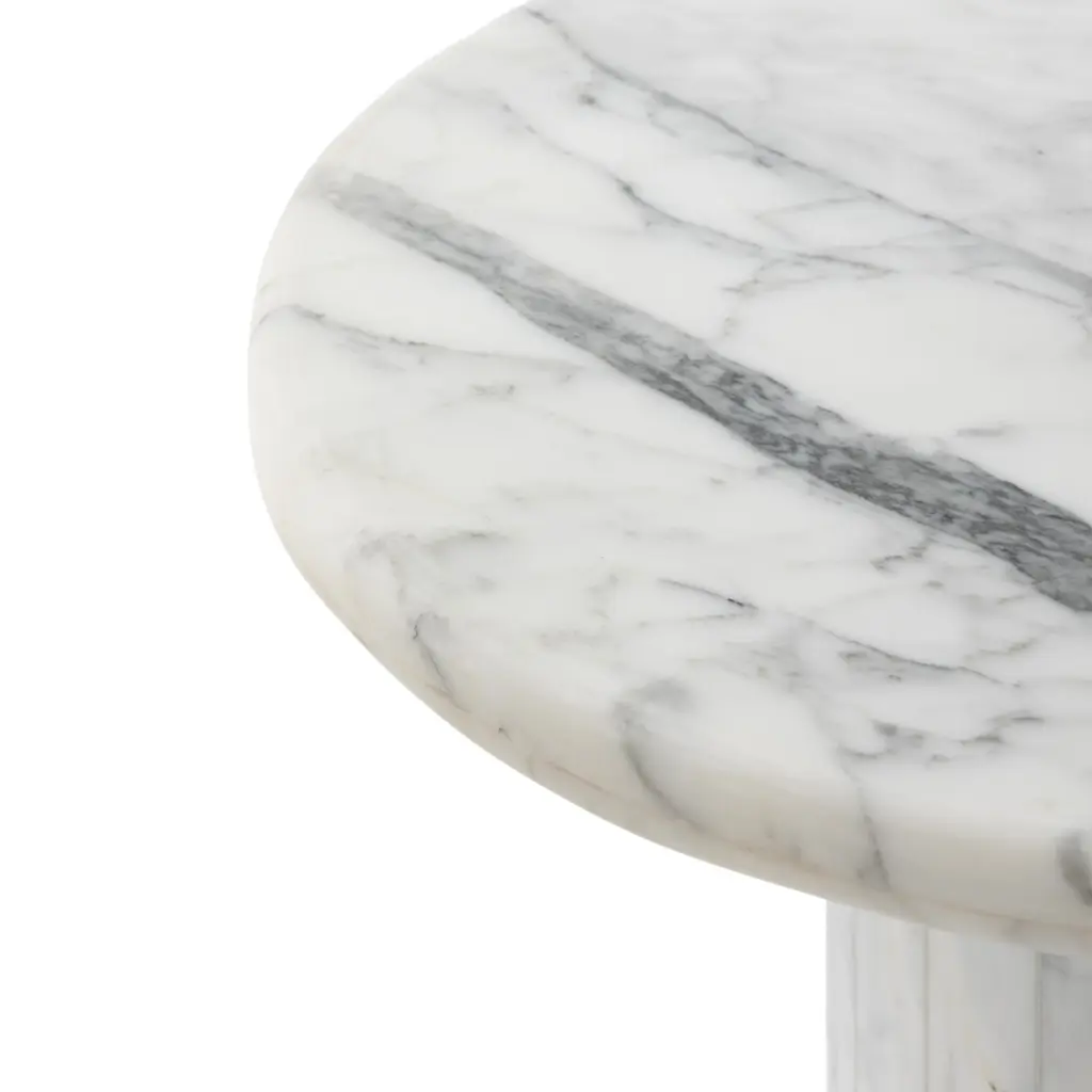Elevate the look of your living space with the Velien End Table. This exquisite piece features a rounded top crafted from Calacatta marble, offering a sophisticated and timeless appeal. The pedestal base provides a polished and solid foundation, enhancing its elegant design. The natural veining of the marble adds a dynamic sense of movement, making each table uniquely beautiful. Perfect for adding a touch of luxury to any room, the Velien End Table is a stunning addition to your home decor.