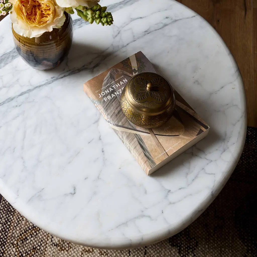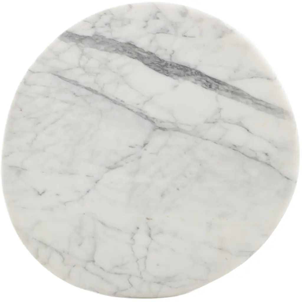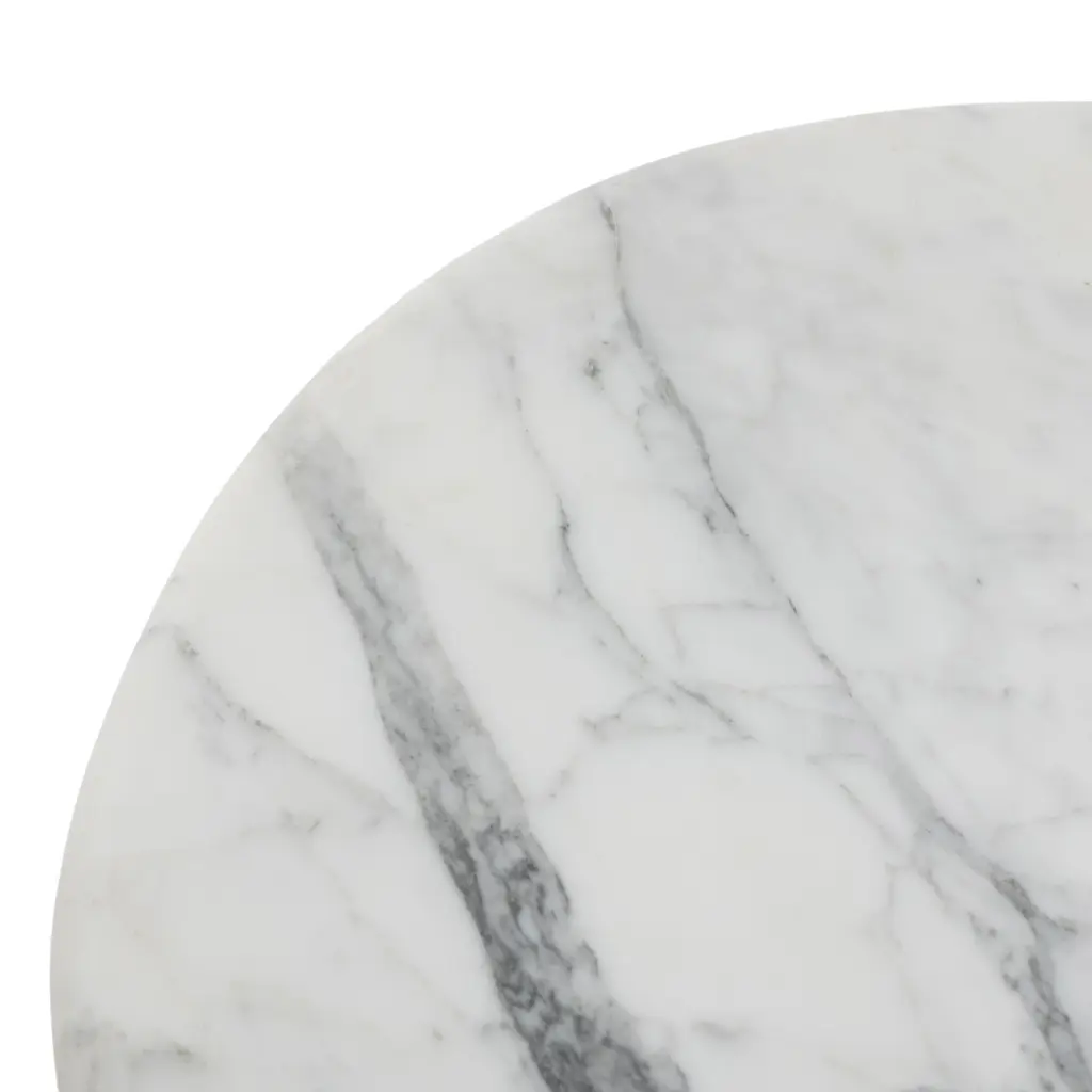 Elevate the look of your living space with the Velien End Table. This exquisite piece features a rounded top crafted from Calacatta marble, offering a sophisticated and timeless appeal. The pedestal base provides a polished and solid foundation, enhancing its elegant design. The natural veining of the marble adds a dynamic sense of movement, making each table uniquely beautiful. Perfect for adding a touch of luxury to any room, the Velien End Table is a stunning addition to your home decor.