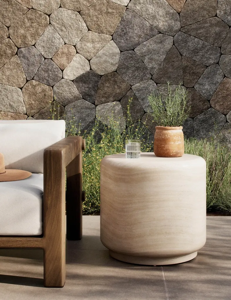 Four Hands brings their exceptional craftsmanship to a timeless collection rooted in Amber Lewis' perennial California style. An artisan finish and rounded shape create a juxtaposition of hard and soft for this modern indoor / outdoor side table. A recessed base adds interest to its smooth silhouette, while its versatile size make this end table a stunning addition in any setting.