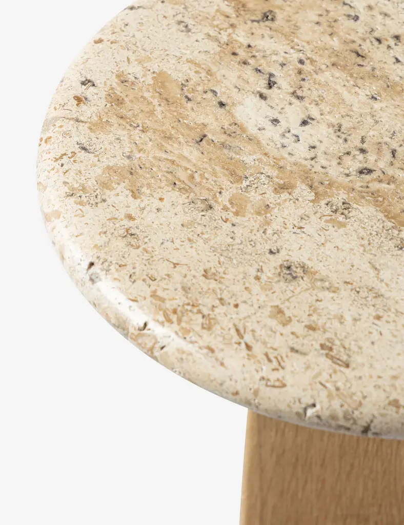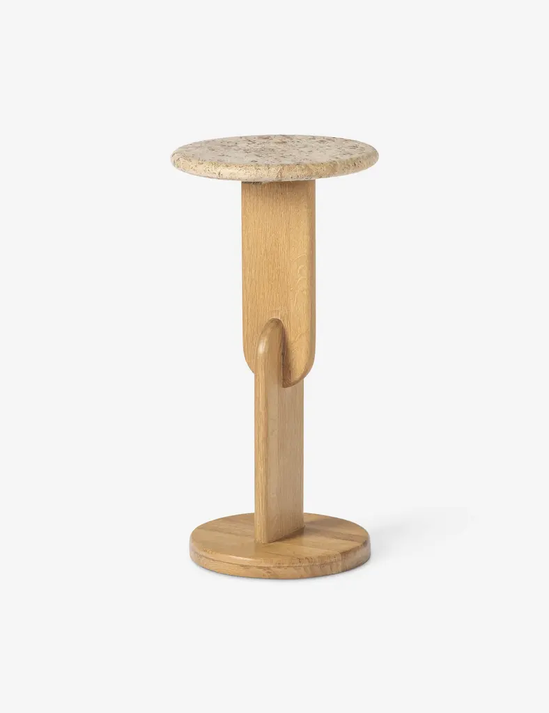The Venetia side table brings an artful poise to timeless materials. Interlocking wood pieces create a sturdy yet slender base to support a round stone top. Style this small end table to perch drinks next to your favorite seat.