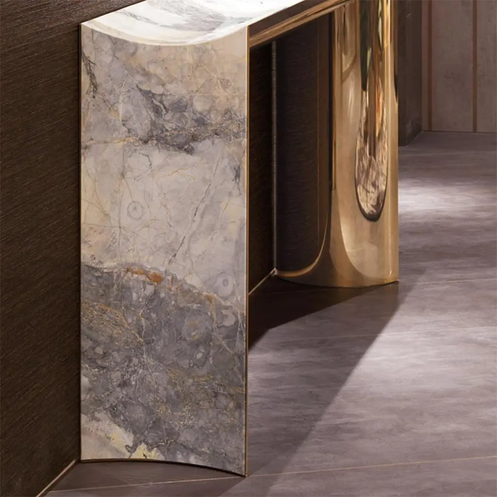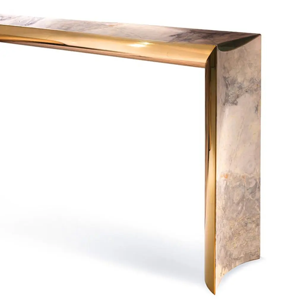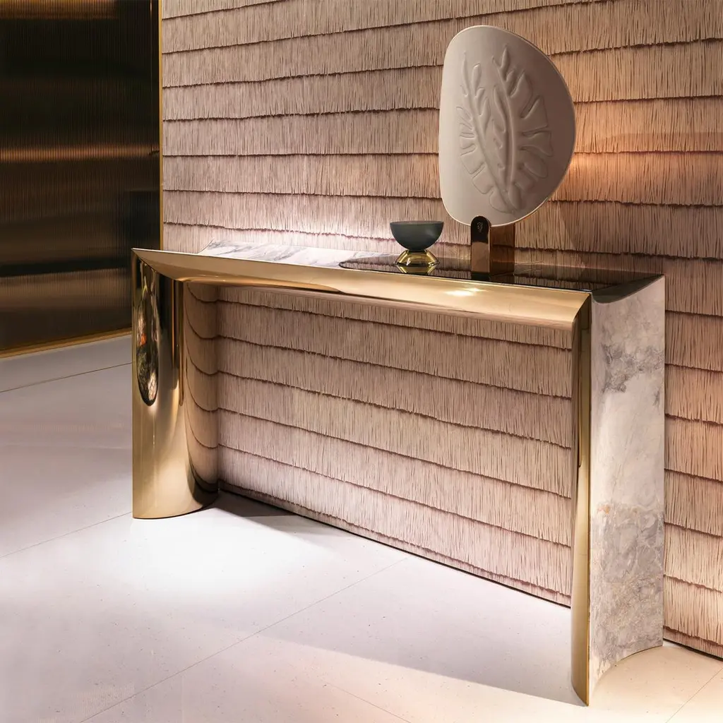 Console table Veneziana with stainless polished steel structure in gold finish with concave sides shaped in solid polished light grey marble.With smoked glass half shaped top included.