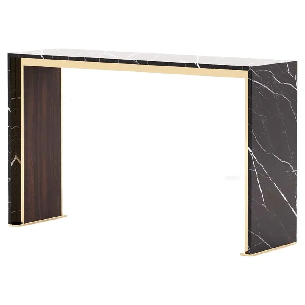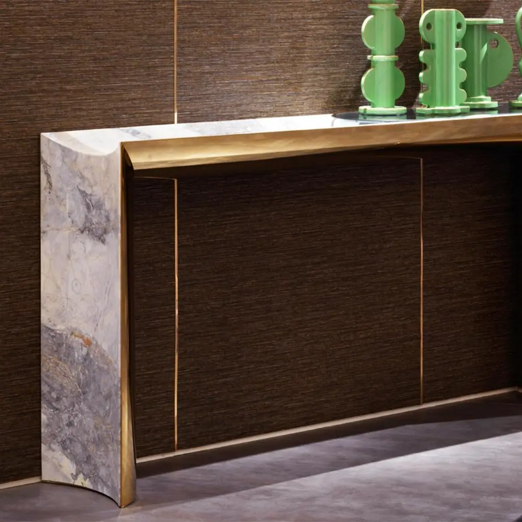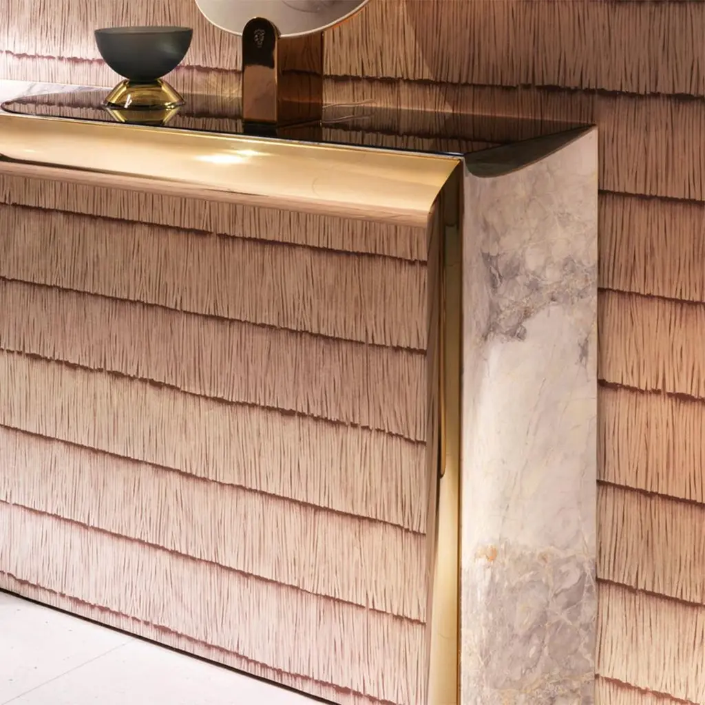 Console table Veneziana with stainless polished steel structure in gold finish with concave sides shaped in solid polished light grey marble.With smoked glass half shaped top included.