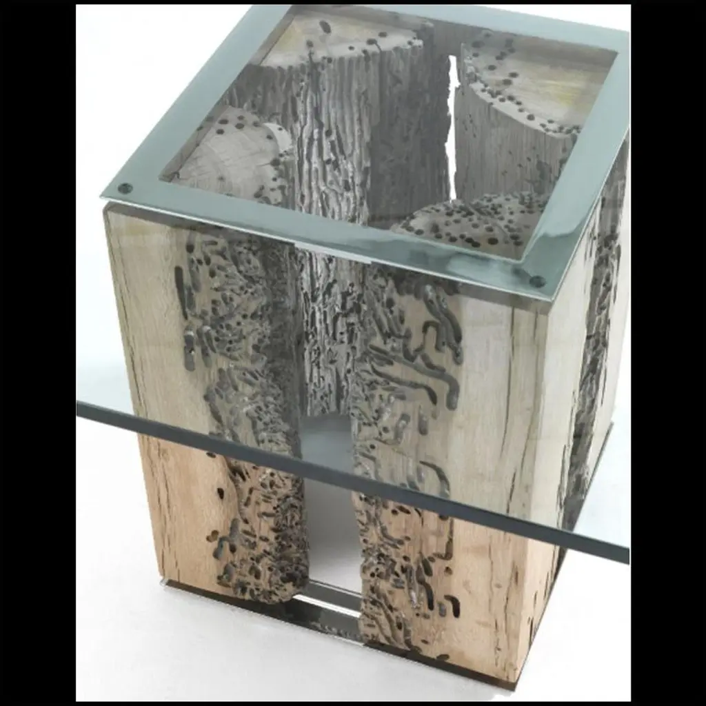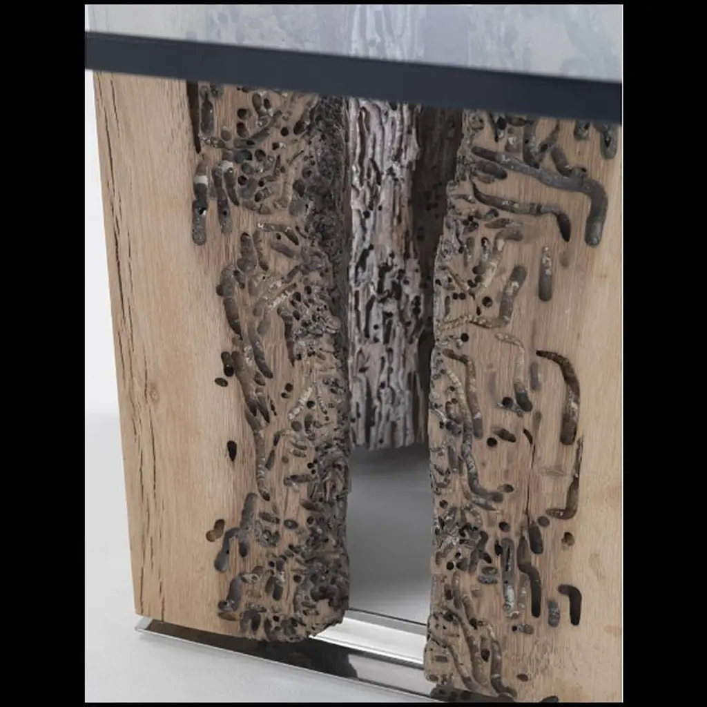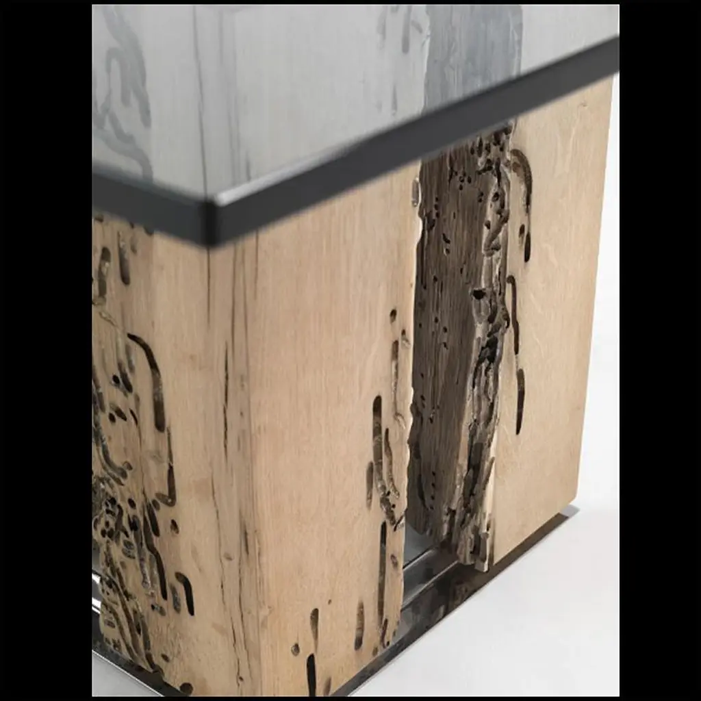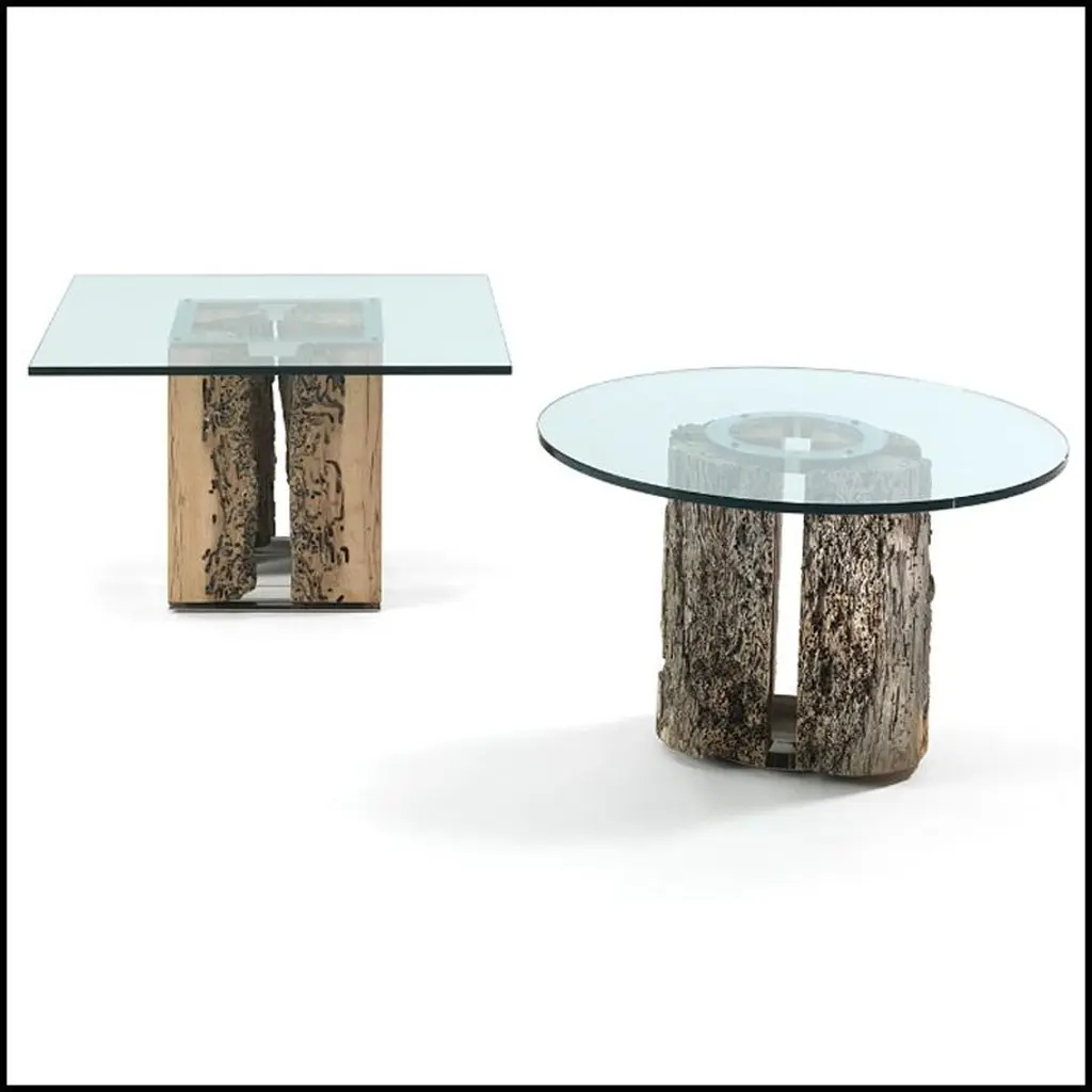 They were underwater and now they are under glass.The side table VENISE is made with 4 real pieces of oak poles implanted in venice channels, fixed on stel base.Square clear glass top.Available in Round side table, on request.