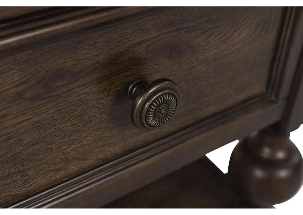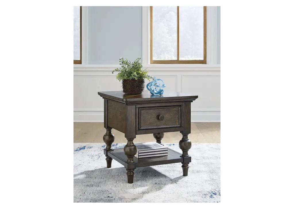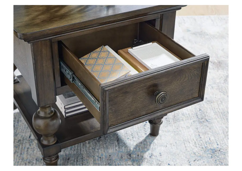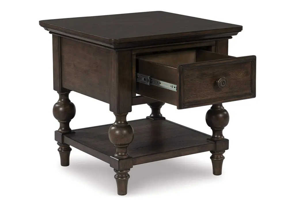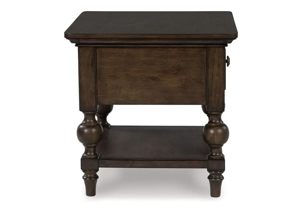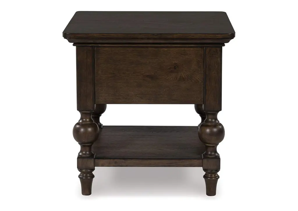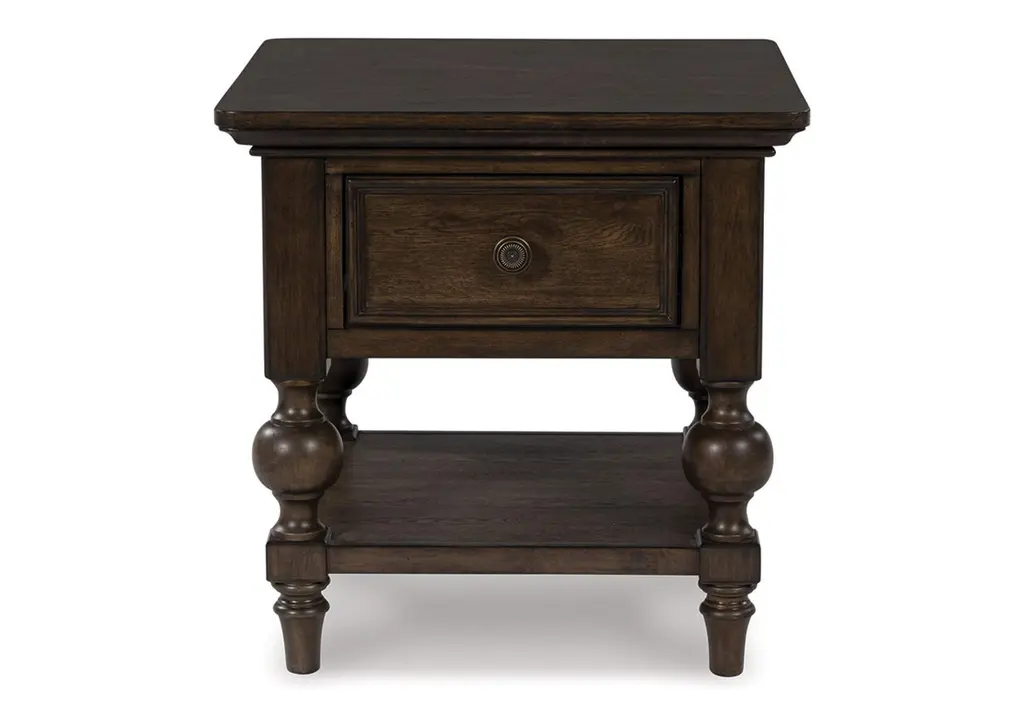For those who appreciate a time-honored aesthetic with understated elegance, the Veramond end table brings home a timeless look. Its rich brown walnut finish merges seamlessly with a profiled top and traditional baluster turned legs for a richly classic appeal. And did we mention there's a lower shelf to display your whatnots? Weight 72.000 lbs. (32.4kgs.)