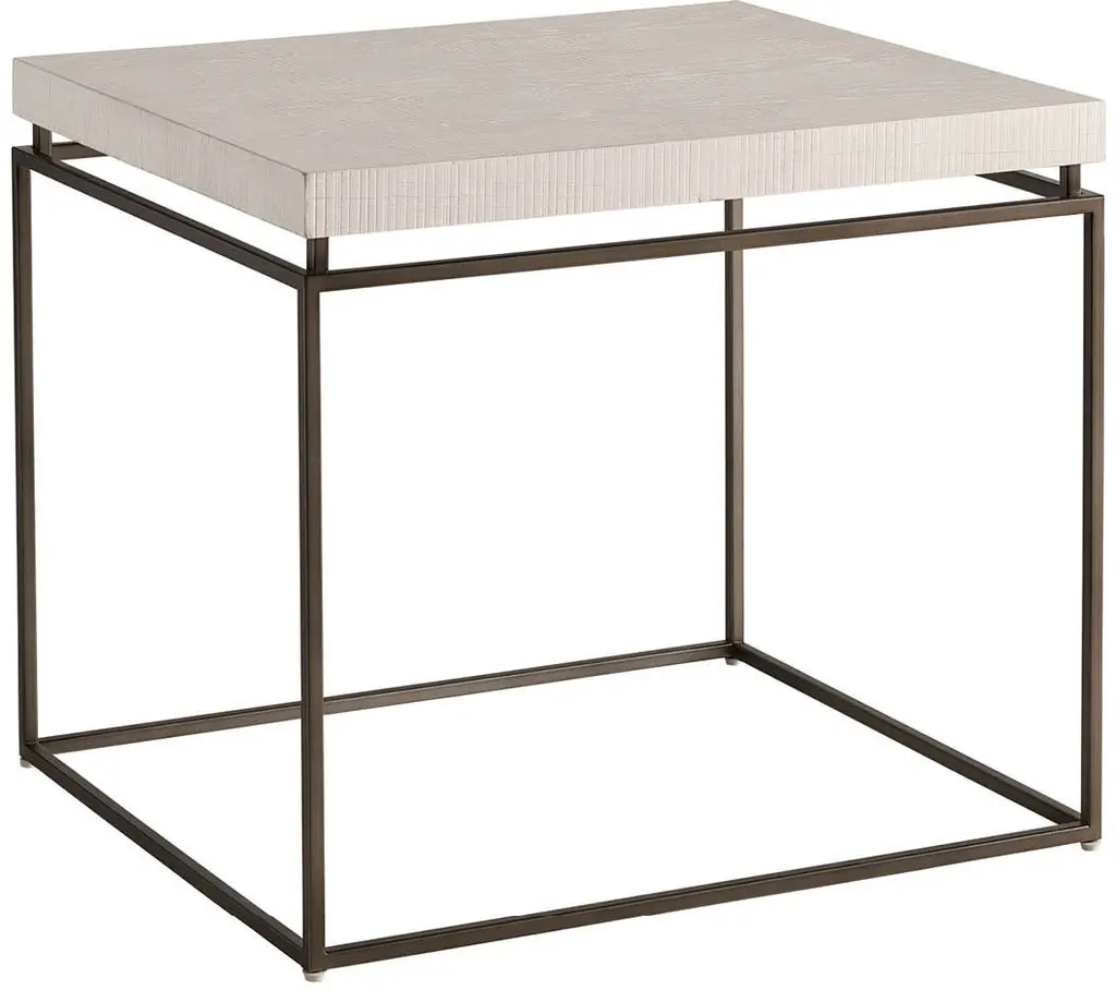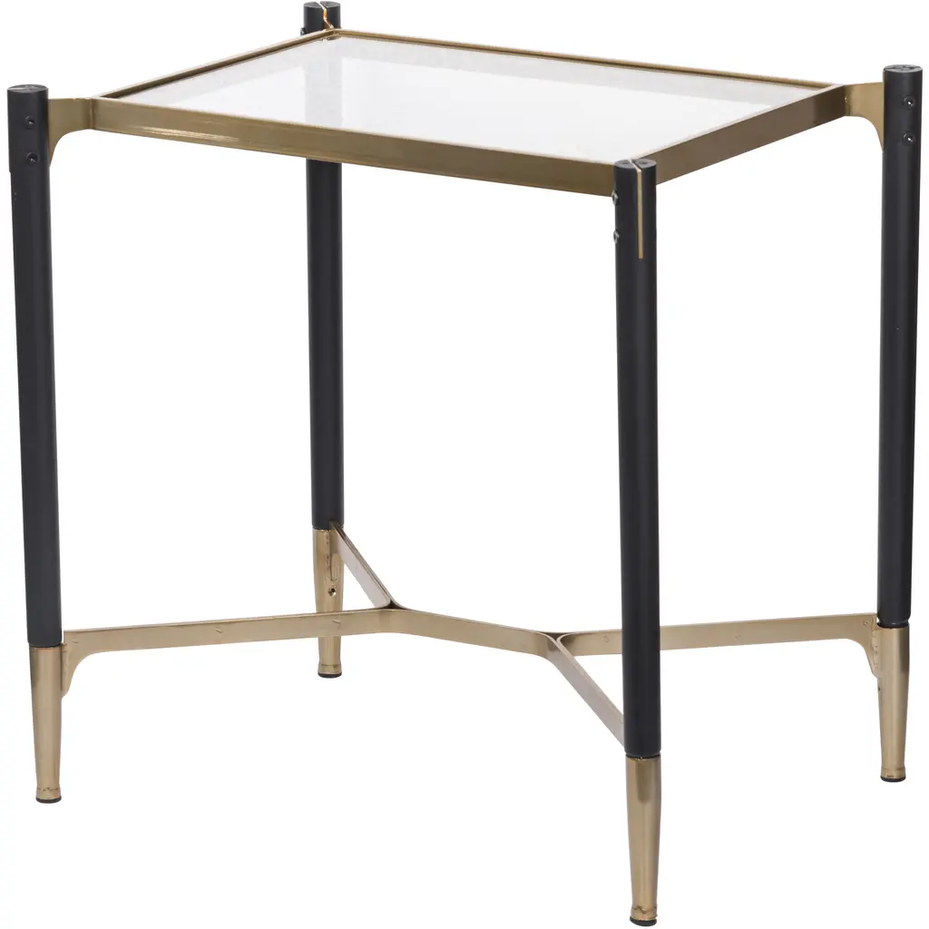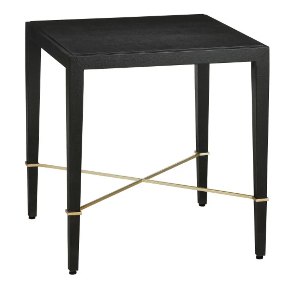 The Verona Black Linen End Table is darkly handsome covered in black lacquered linen that gives the overall surfaces of the table a subtle texture. The zig-zagging stretchers on this minimalist piece, in a champagne finish, bring the black accent table its flair. Design details that make it special are the slight indention surrounding the edge of its top and the way the legs tapper slightly as they move toward the floor.