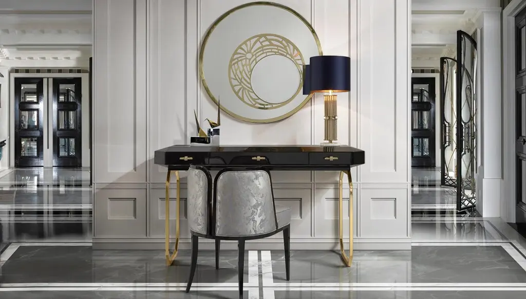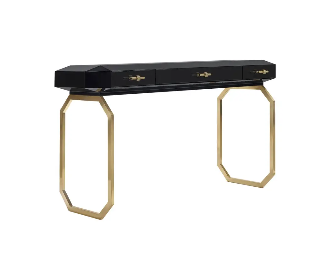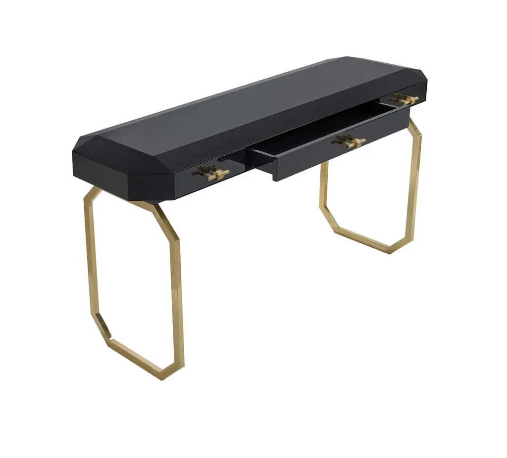 Vertigo Console Table by Memoir EssenceDimensions: D 50 x W 150 x H 90 cm.Materials: Brushed brass and lacquer.Vertigo console presents a combination of a strong and geometric pattern with elegant materials. This console is capable to bring a sophisticated and strong look to your living room or entryway.Memoir Essence Interiors has been writing its memoirs day by day, inspired in every detail lived through a feminine world, this world brings the most delicate imaginary. Jewelry, fashion, architecture, music, art and materials are Memoir’s inspirations to materialize a collection of design pieces of furniture, upholstery, lighting and accessories.The use of noble materials like marble, brass, veneers, gold and silver leaf, Swarovski crystals as other decorative and fine materials, combined with handwork techniques as casted brass, hand-whickered fabric ribbons, gold leaf appliance, marble cutted and puzzled pieces, provide the needed essence to tell memoirs through the designed pieces and the interiors they fulfill.This collection mostly handmade and focused on details and material nobility is made in Portugal, bringing handwork techniques that are part of Portuguese history, applied in a current and differentiated way, delivering timeless pieces to your special projects. Acquire Memoir is the opportunity to travel through the feminine essence over design and experience a unique “memoir” of timelessness and exclusivity.Writing is first chapter in 2016, after a journey of inspirational research, forecasting and design, Memoir made its first appearance at Maison et Objet, Paris.Since then Memoir is “writing” memories adding new materials, designs, techniques and appearances around the world, as in Paris, London or UAE.Memoir will continue this journey, always motivated by the inspiration possibilities in the many delicate details found in feminine world.Tell your memoires with this collection and be a memorialist yourself…