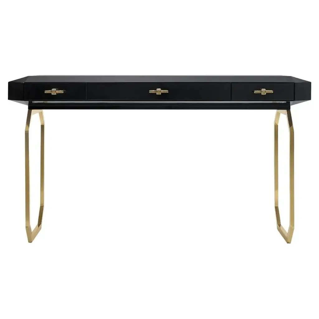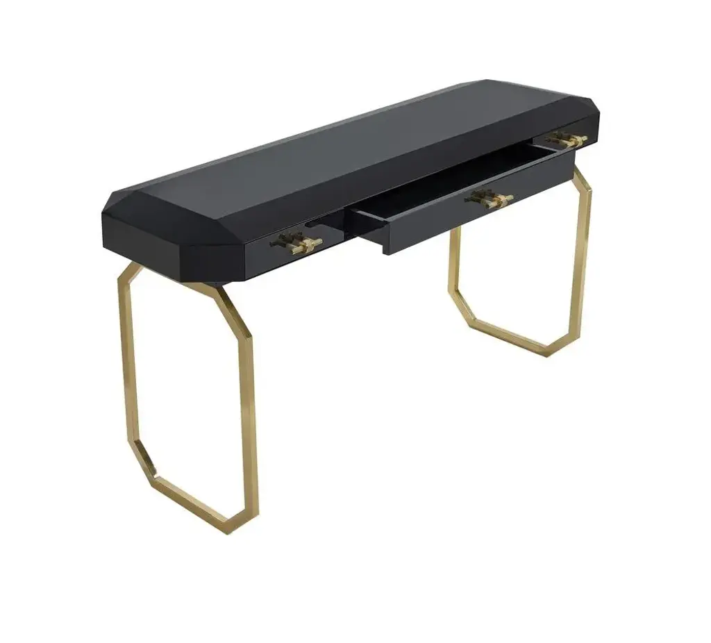 Vertigo Console Table by Memoir Essence Dimensions: D 50 x W 150 x H 90 cm. Materials: Brushed brass and lacquer. Vertigo console presents a combination of a strong and geometric pattern with elegant materials. This console is capable to bring a sophisticated and strong look to your living room or entryway. Memoir Essence Interiors has been writing its memoirs day by day, inspired in every detail lived through a feminine world, this world brings the most delicate imaginary. Jewelry, fashion, architecture, music, art and materials are Memoir’s inspirations to materialize a collection of design pieces of furniture, upholstery, lighting and accessories. The use of noble materials like marble, brass, veneers, gold and silver leaf, Swarovski crystals as other decorative and fine materials, combined with handwork techniques as casted brass, hand-whickered fabric ribbons, gold leaf appliance, marble cutted and puzzled pieces, provide the needed essence to tell memoirs through the designed pieces and the interiors they fulfill.