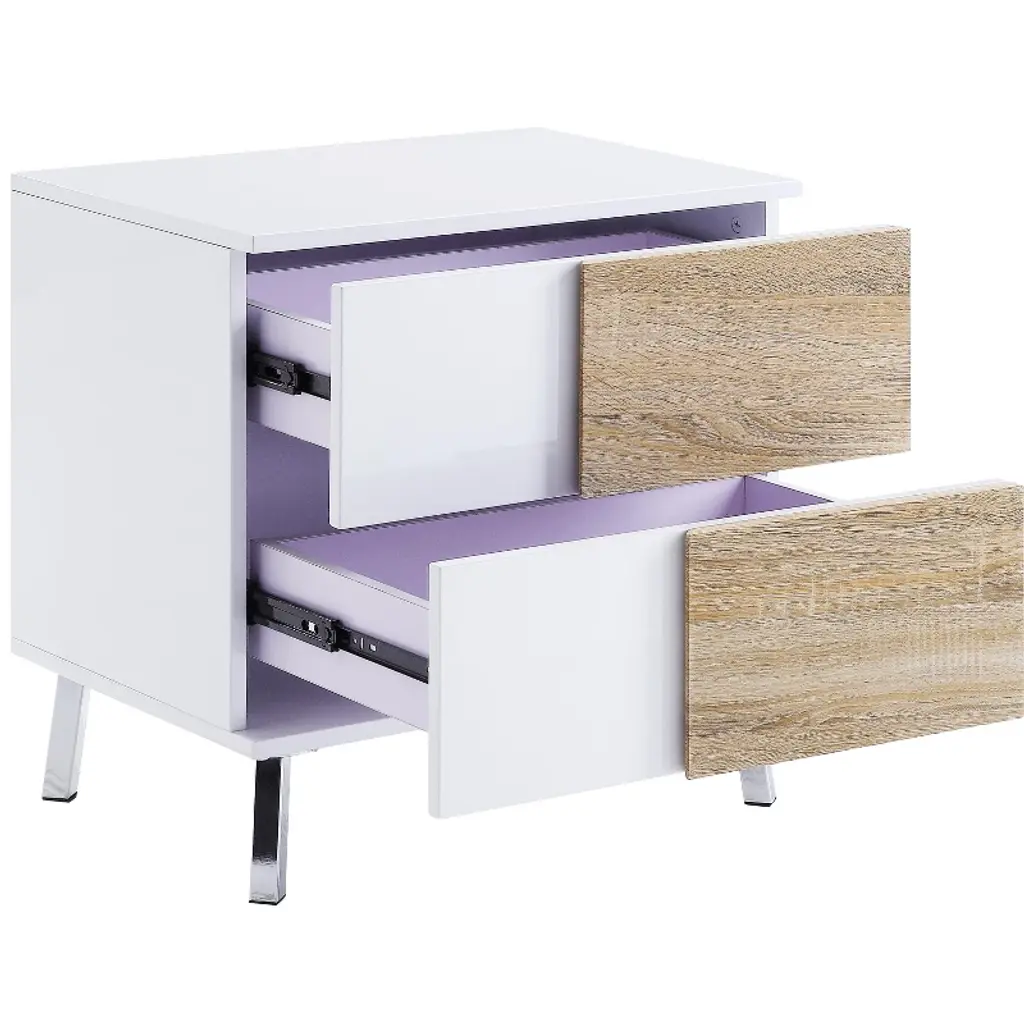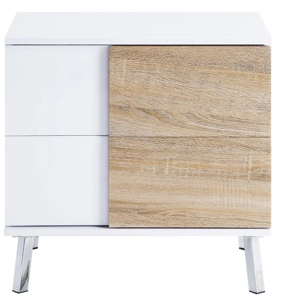 This modern collection features a sleek coffee table and end table, both finished in a striking white high gloss that adds a polished, contemporary look to any living space.The coffee table offers exceptional functionality with four drawers and a convenient pull-out table, providing ample storage space for everyday items.Its high gloss case-frame is paired with contrasting natural-finish drawer fronts, while the side metal glide drawers allow for smooth, full-extension operation.The rectangular end table complements the set with two storage drawers and similar high gloss construction, chrome-finished flared legs, and contrasting drawer fronts. Both tables are made from durable MDF, ensuring longevity and a stylish appearance for any room.