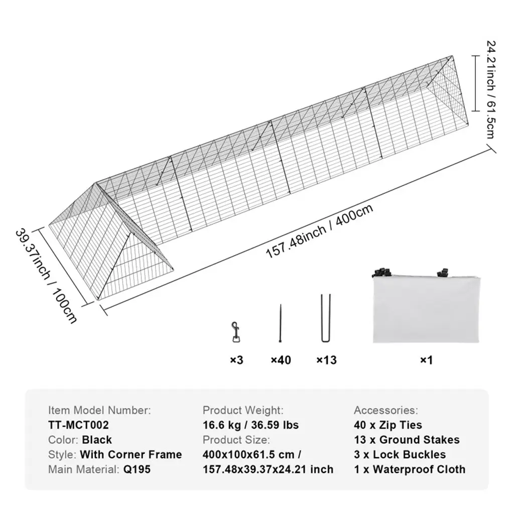Feature: Portable & Large Activity Area: Still worrying about your chicken ruining your vegetable garden? VEVOR chicken tunnel enclosure will protect them from your garden, and they can freely run back and forth. Providing a wide activity area measuring 39.37" wide and 24.2" tall, the VEVOR chicken tunnel offers poultry greater freedom. With a free-range lifestyle ensuring healthy growth, ample space allows them to enjoy a more natural environment. Durable & Stable Material: Constructed with Q195 high-quality steel with spray rust-proof coating, ensuring increased durability. The thick wire and reinforced metal frame ensure stability, preventing shaking and effectively protecting against intrusion from dogs, coyotes, hawks, and foxes, ensuring the flock's safety. Easy to Setup, or DIY Installation:: Designed for convenient installation and mobility, equipped with locks, ground stakes, and zip ties for quick assembly. The foldable chicken tunnels for yard save space and facilitate easy adjustment of the chicken activity area, enhancing farming flexibility. Protective & Waterproof Cover Included: Our portable chicken run comes with a silver waterproof cloth, effectively isolating rainwater and UV rays while maintaining ventilation, ensuring premium protection for poultry in all weather conditions, unaffected by harsh climates. Multi-shape Corner Frame: An innovative corner frame allows for a free combination of tunnels according to site requirements. Adaptable to diverse farming site, whether in compact urban spaces or spacious rural gardens, the VEVOR mobile chicken coop easily meets various needs. Package Content: 40 x Zip Ties 13 x Ground Stakes 3 x Lock Buckles 1 x Waterproof Cloth