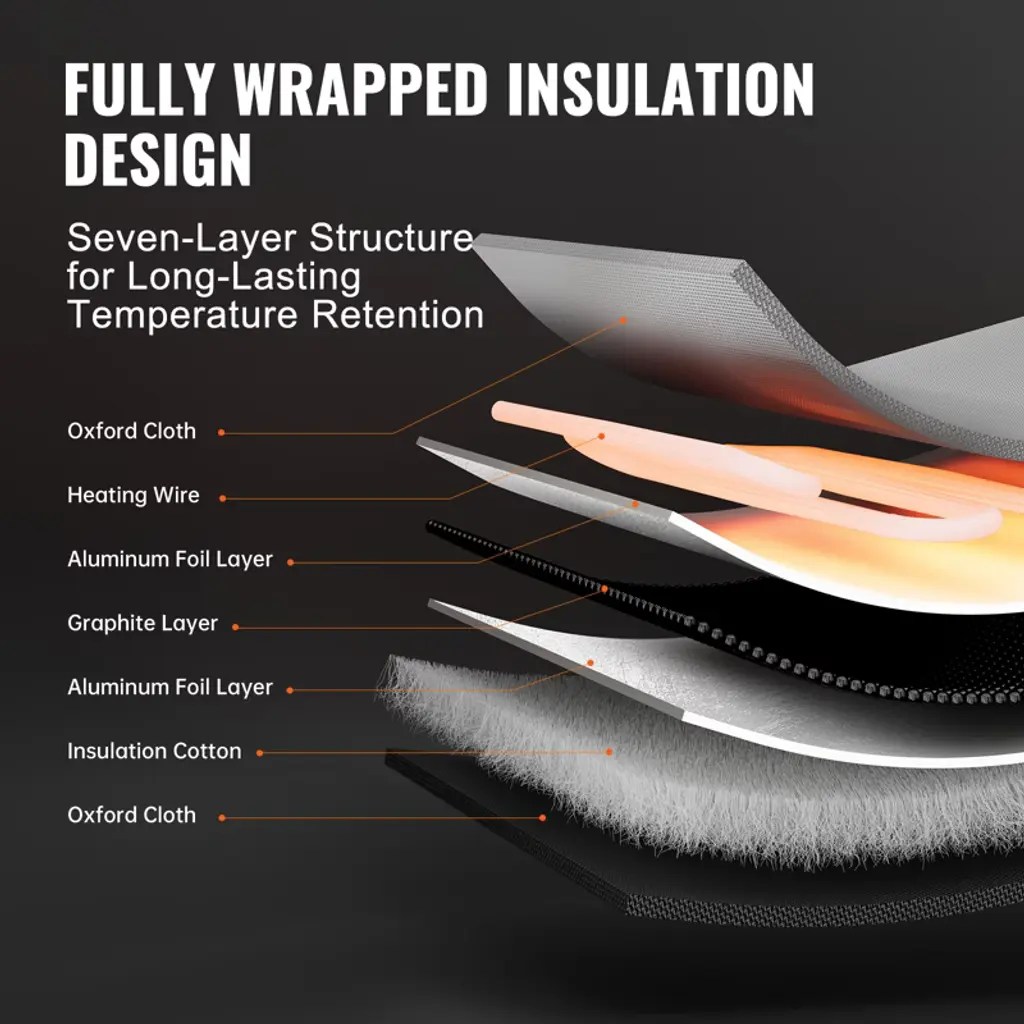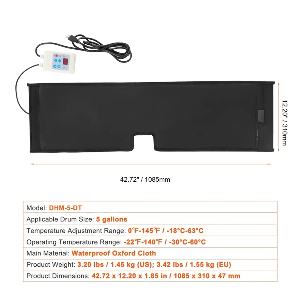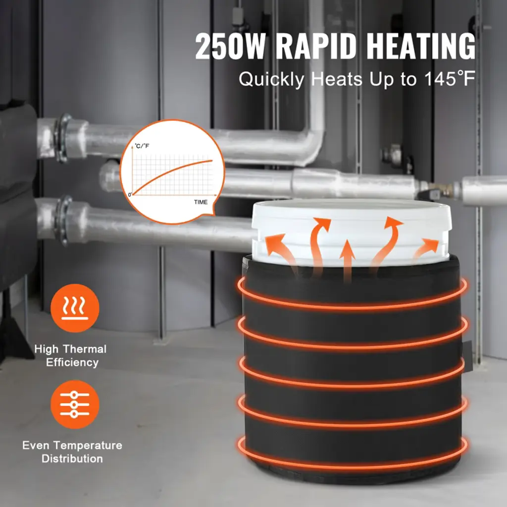 Feature: Fast Heating: VEVOR Drum Heating Belt, 250W high power & advanced heating system, ensures safe and rapid heating. The heating blanket adheres well to the heating surface, achieving high thermal efficiency with uniform, stable, and gentle heat distribution to maintain constant temperature inside the drum or container. Insulated Full Wrap Design: Includes a five-layer structure of PVC + aluminum foil + reflective film + fiberglass cotton + Oxford cloth. Each layer is made of high-strength materials, providing a closed and evenly heated environment that promotes insulation and energy efficiency. Adjustable Temperature: Equipped with a temperature controller, adjustable from 0-145°F (-17.78°C-62.78°C). It heats up to the highest temperature quickly, and the thick insulation layer enhances thermal insulation. Additionally, it switches between Fahrenheit and Celsius, allowing you to set the temperature unit according to your preference. Easy Installation: Tool-free installation, quick assembly, disassembly, and reusability. Simple and convenient operation allows for installation in minutes, even for beginners. Note: It stops heating when reaching the set temperature and resumes heating automatically when the temperature drops below the set point. Wide Application: Suitable for 5-gallon drums, effectively maintaining the temperature of contents during cold winters. Widely used in light industry, food processing, manufacturing, outdoor construction, and other fields, providing a convenient user experience and serving as an excellent energy-saving assistant in winter. Package Content: Drum Heater x 1 User Manual x 1