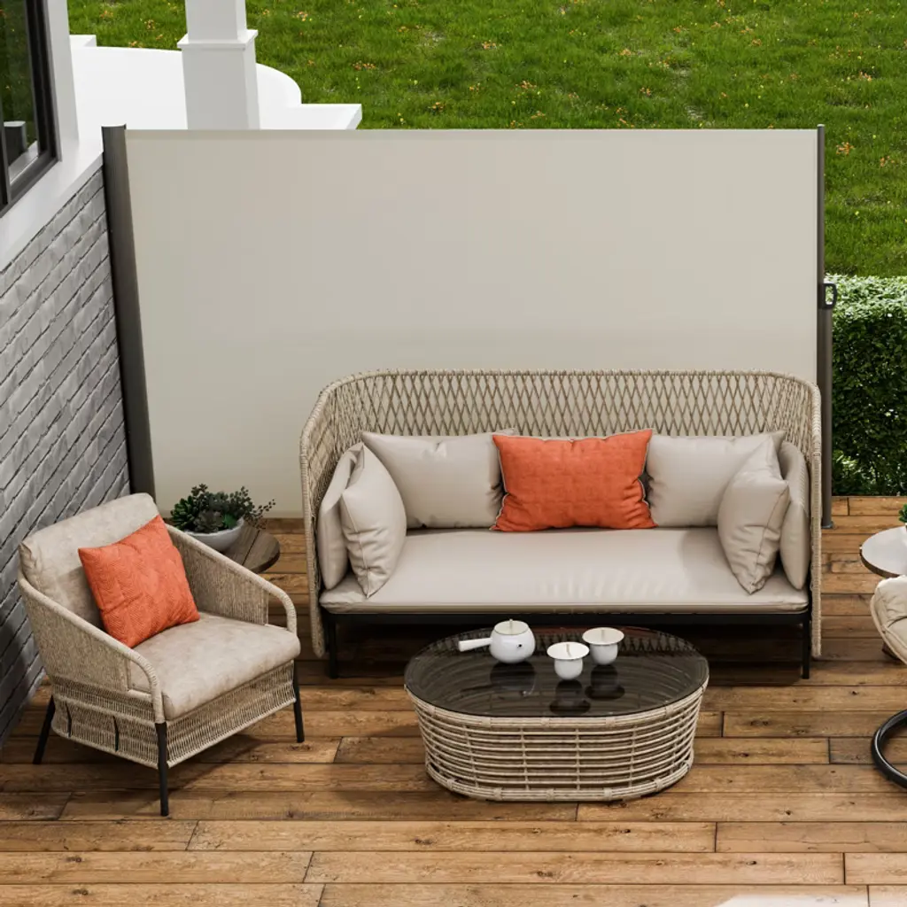 Feature: High-Quality Material: Our retractable side awning is made from 280g/m² high-density polyester fabric with a PU coating, providing excellent waterproof performance and tensile strength. It effectively blocks wind and rain, resists UV rays (UV30+), extends its lifespan, and ensures stable shelter for outdoor activities. Sturdy and Durable Structure: Innovative design includes a 2° tilt on the support poles for added height and to prevent fabric sagging. The frame poles are made from high-strength aluminum alloy material with a powder coating, ensuring a stylish appearance and corrosion resistance but also providing high strength and stability. Easy Installation: Designed for user convenience, our retractable patio screen is easy to install and comes with complete installation accessories. No need for professional tools or skills. Effortless Operation: The retractable handle features a spring for smooth operation. Simply pull or push to adjust the side awning's extension and retraction. The upgraded spring handle is designed to prevent pinching, ensuring a better user experience. Practical Design: The 5.91x9.84ft/180x300cm outdoor privacy screen provides ample shading area, making it perfect for outdoor balconies, courtyards, or commercial spaces. It offers privacy and protection from wind and low-angle sunlight. Its modern minimalist design matches various outdoor environments and decor styles. Package Content: 1 x Retractable Side Awning 2 x U-shaped Aluminum Wall Brackets 4 x External Hex Expansion Screws 4 x Cross Self-Tapping Screws 4 x Expansion Pipes 1 x Internal Hex Wrench