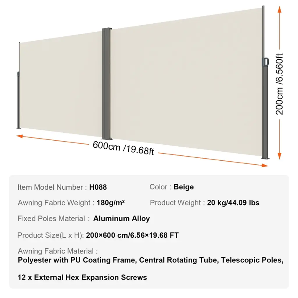 Feature: High-Quality Material: Our retractable side awning is made from 180g/m² high-density polyester fabric with a PU coating, providing excellent waterproof performance and tensile strength. It effectively blocks wind and rain, resists UV rays (UV30+), extends its lifespan, and ensures stable shelter for outdoor activities. Sturdy and Durable Structure: Innovative design includes a 2° tilt on the support poles for added height and to prevent fabric sagging. The frame poles are made from high-strength iron material with a powder coating, ensuring a stylish appearance and corrosion resistance but also providing high strength and stability. Easy Installation: Designed for user convenience, our retractable patio screen is easy to install and comes with complete installation accessories. No need for professional tools or skills. Effortless Operation: The retractable handle features a spring for smooth operation. Simply pull or push to adjust the side awning's extension and retraction. The upgraded spring handle is designed to prevent pinching, ensuring a better user experience. Practical Design: The 6.56x19.68ft/200x600cm outdoor privacy screen provides ample shading area, making it perfect for outdoor balconies, courtyards, or commercial spaces. It offers privacy and protection from wind and low-angle sunlight. Its modern minimalist design matches various outdoor environments and decor styles. Package Content: 1 x Retractable Side Awning 12 x External Hex Expansion Screws
