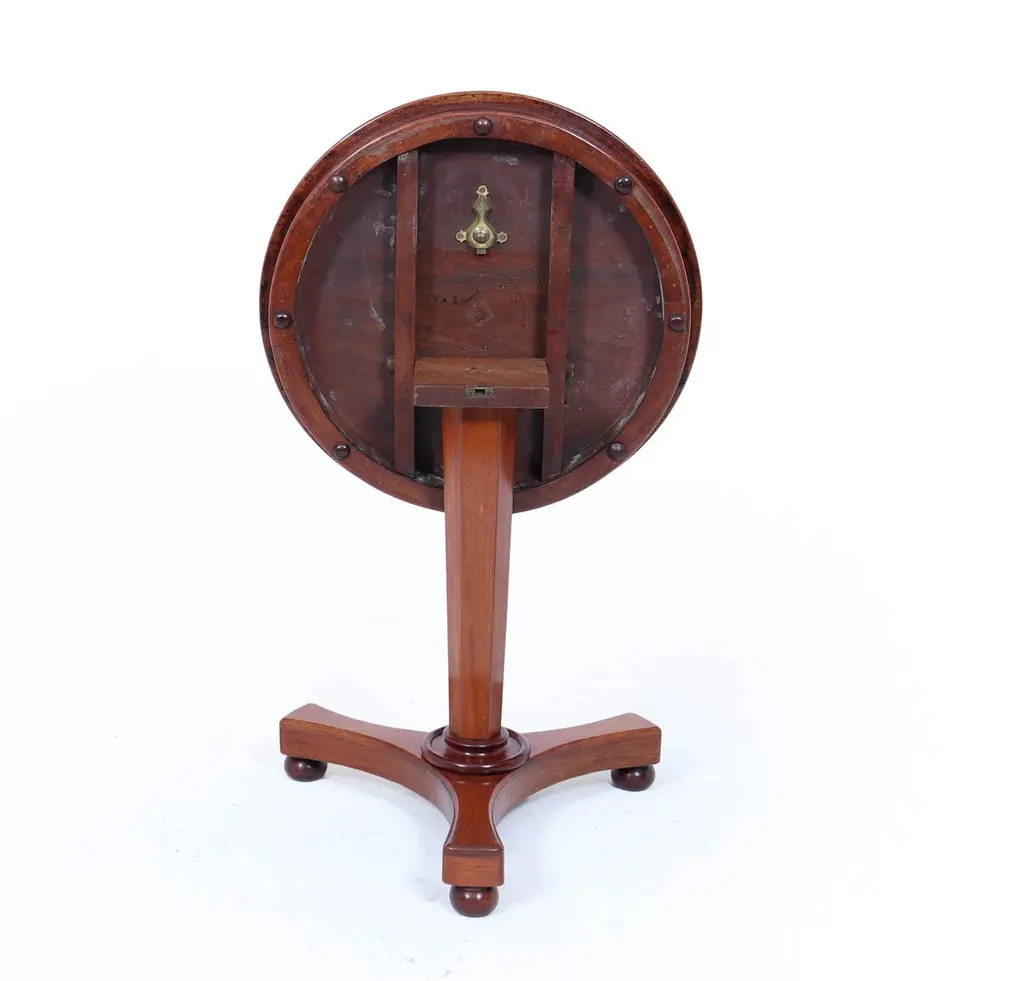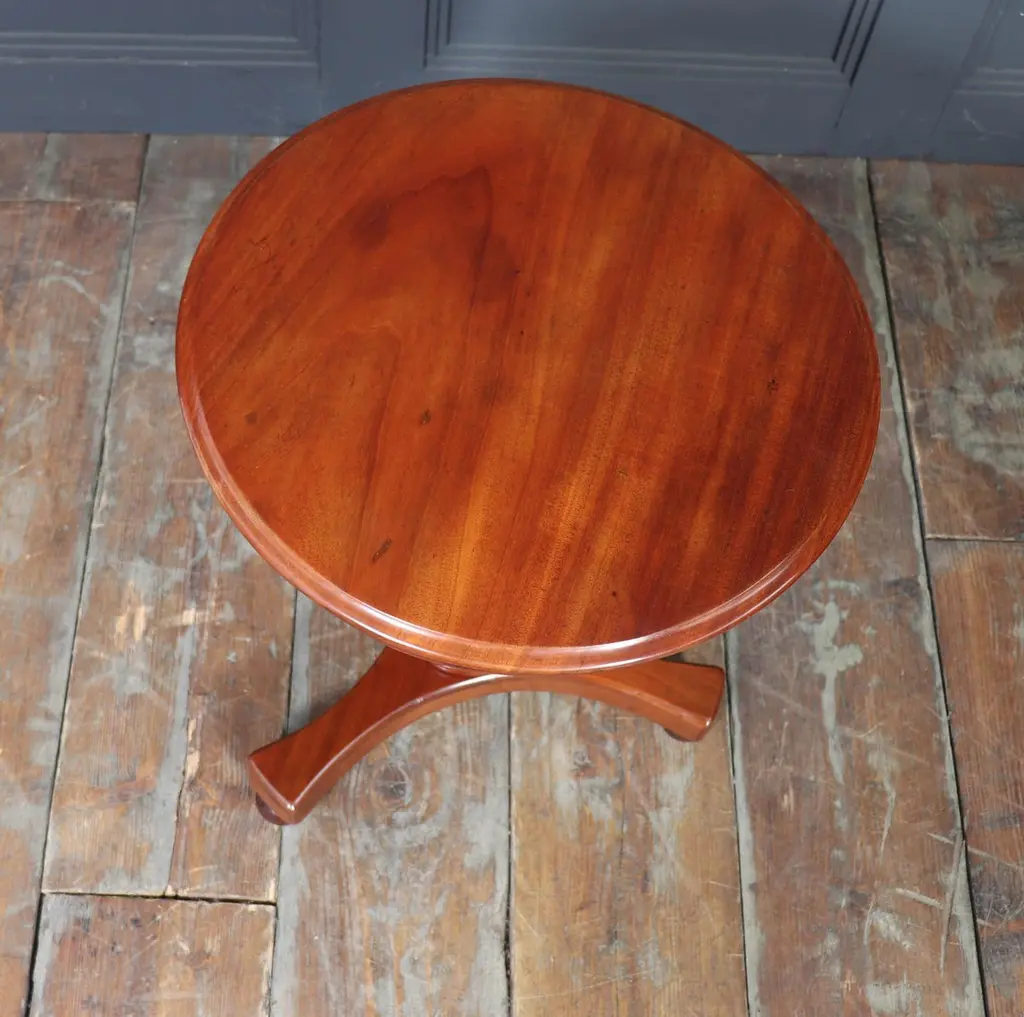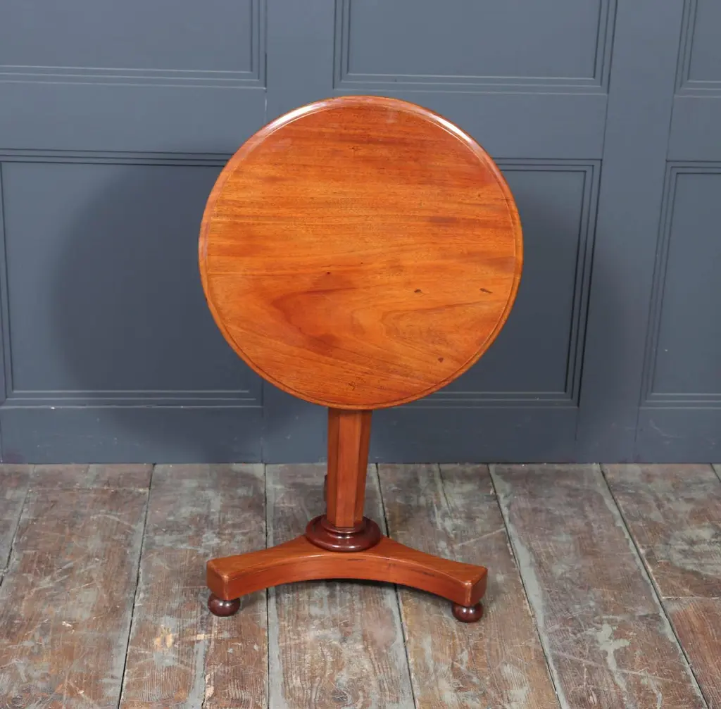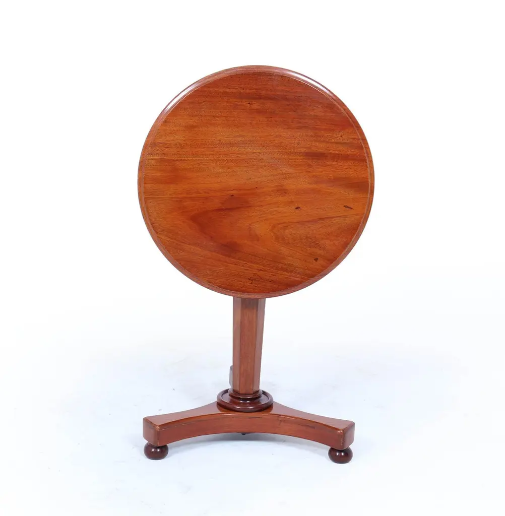 A charming late 19th-century Victorian tilt-top side table, crafted in rich, mellow mahogany. The circular top with gently moulded edge is supported on a finely turned column leading to a triple-legged base with ball feet. The original brass catch mechanism allows the top to tilt upright for space-saving convenience when not in use. Its compact form and timeless proportions make this table ideal as a lamp stand, occasional table, or refined accent piece.Provenance:English, circa 1880Acquired from a private collection in SussexRetains original brass tilt mechanismCondition:In excellent antique condition with only light surface wearRich original patina with deep colour and even toneStructurally sound and fully functional tilt mechanismDimensions:Height: 55 cmDiameter: 49 cm