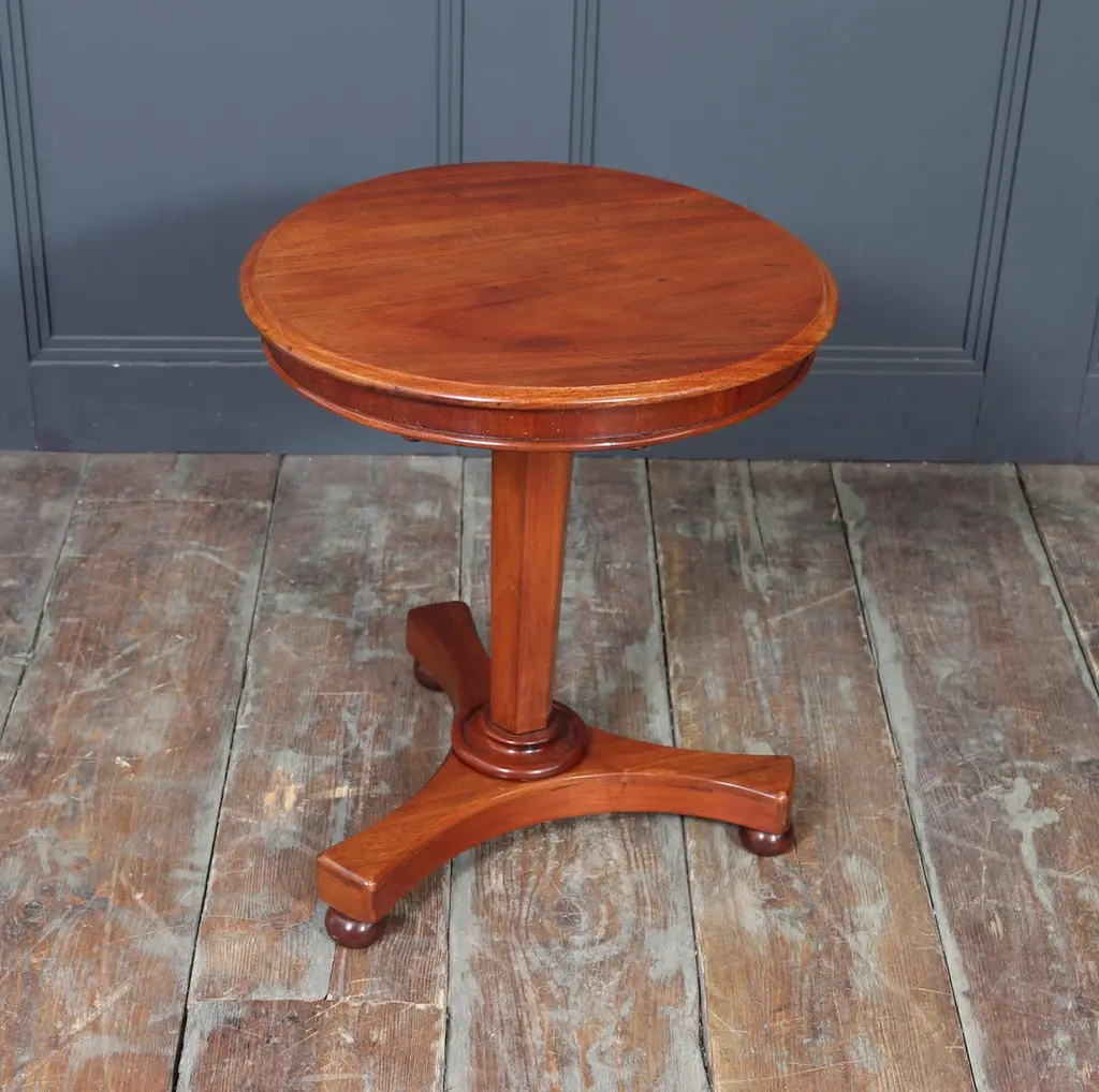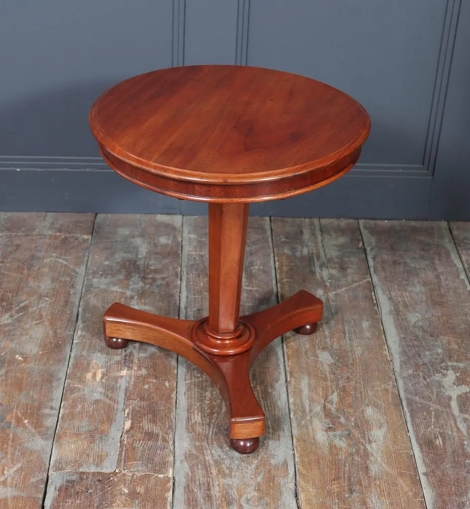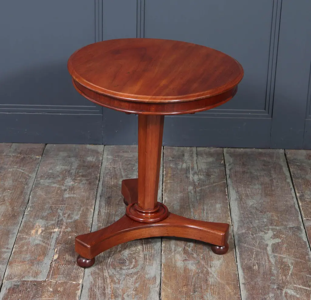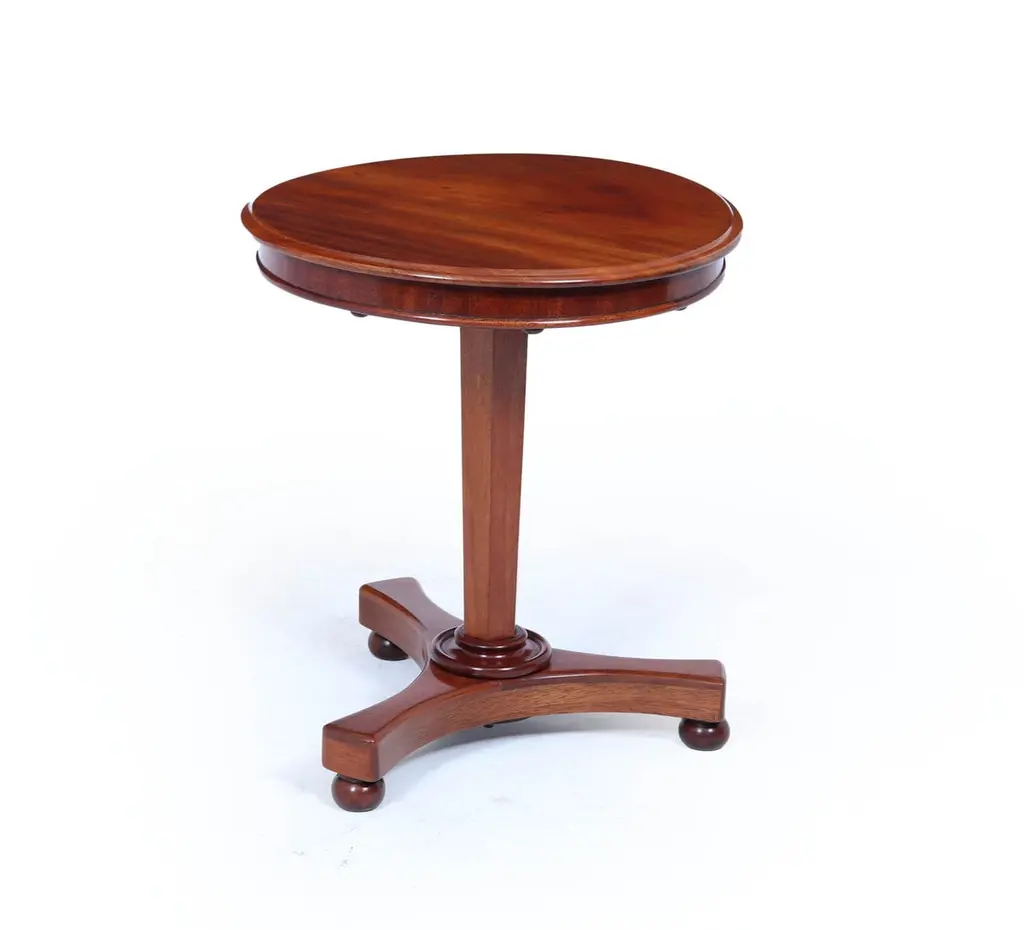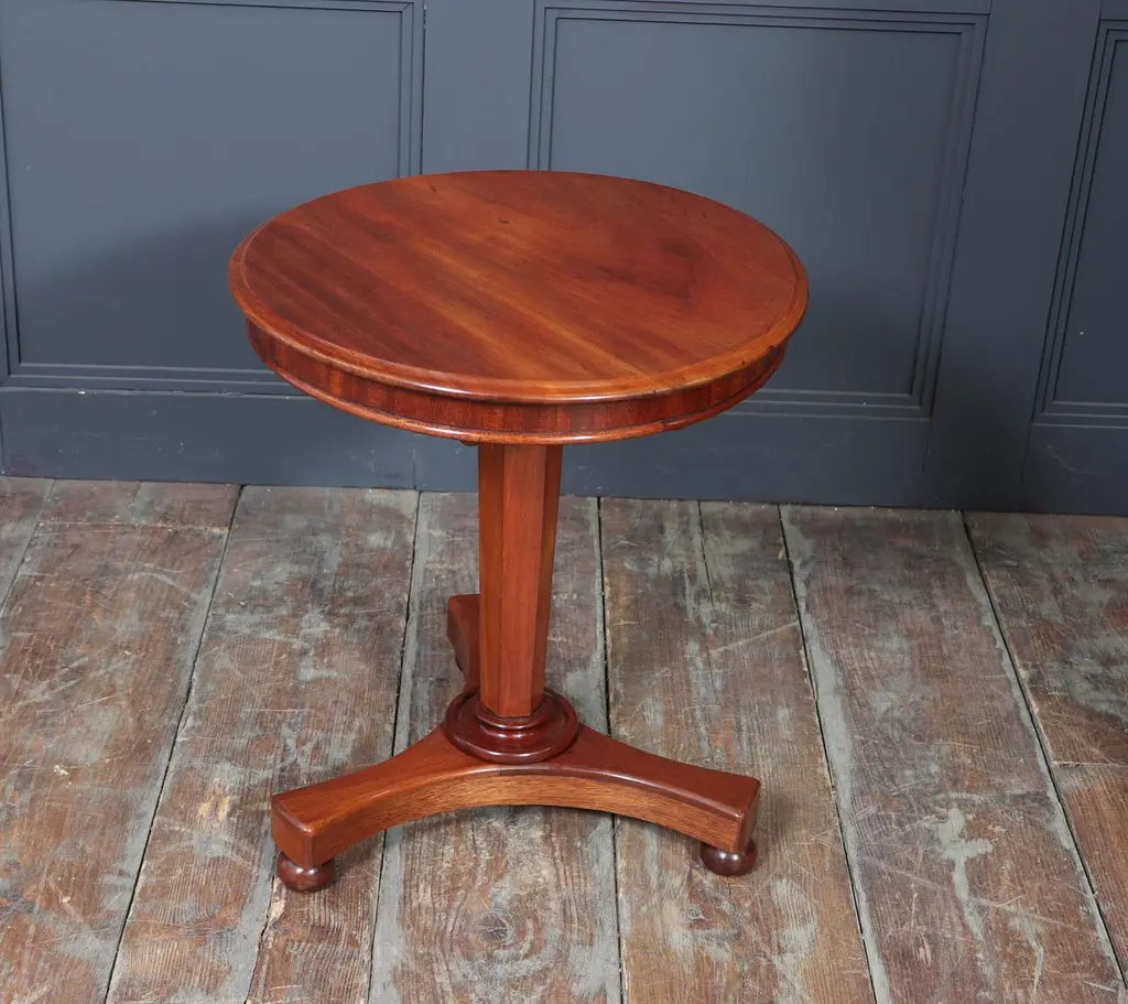 A charming late 19th-century Victorian tilt-top side table, crafted in rich, mellow mahogany. The circular top with gently moulded edge is supported on a finely turned column leading to a triple-legged base with ball feet. The original brass catch mechanism allows the top to tilt upright for space-saving convenience when not in use. Its compact form and timeless proportions make this table ideal as a lamp stand, occasional table, or refined accent piece.Provenance:English, circa 1880Acquired from a private collection in SussexRetains original brass tilt mechanismCondition:In excellent antique condition with only light surface wearRich original patina with deep colour and even toneStructurally sound and fully functional tilt mechanismDimensions:Height: 55 cmDiameter: 49 cm