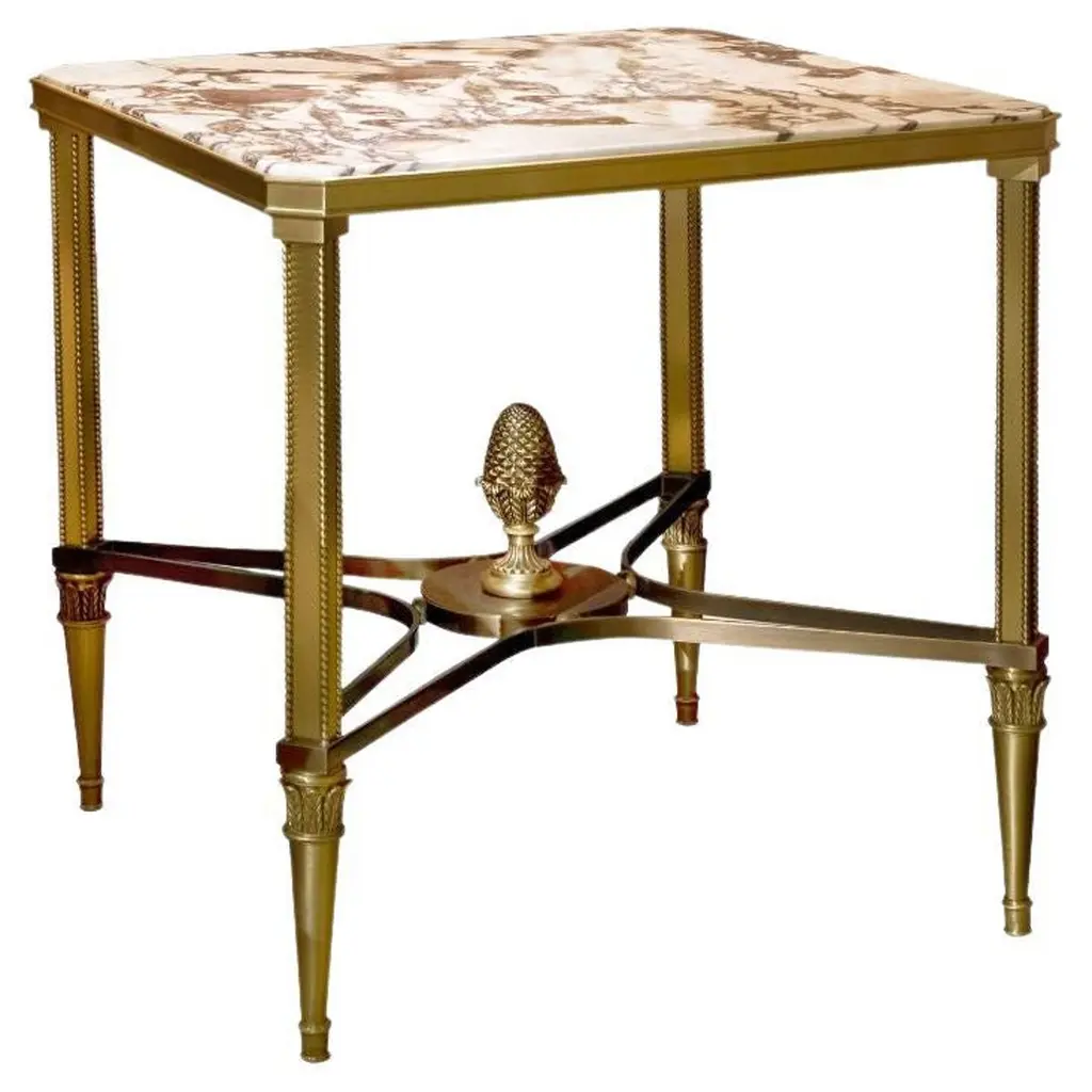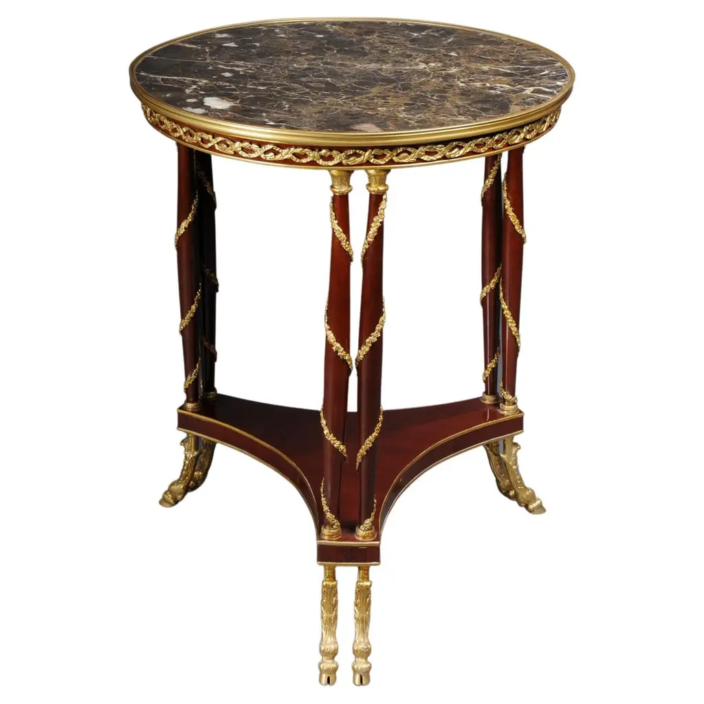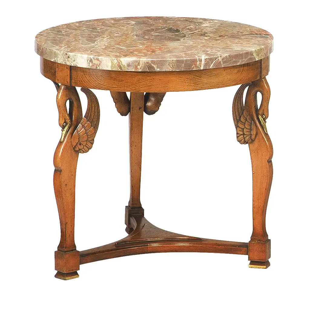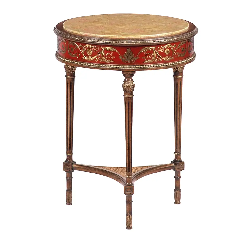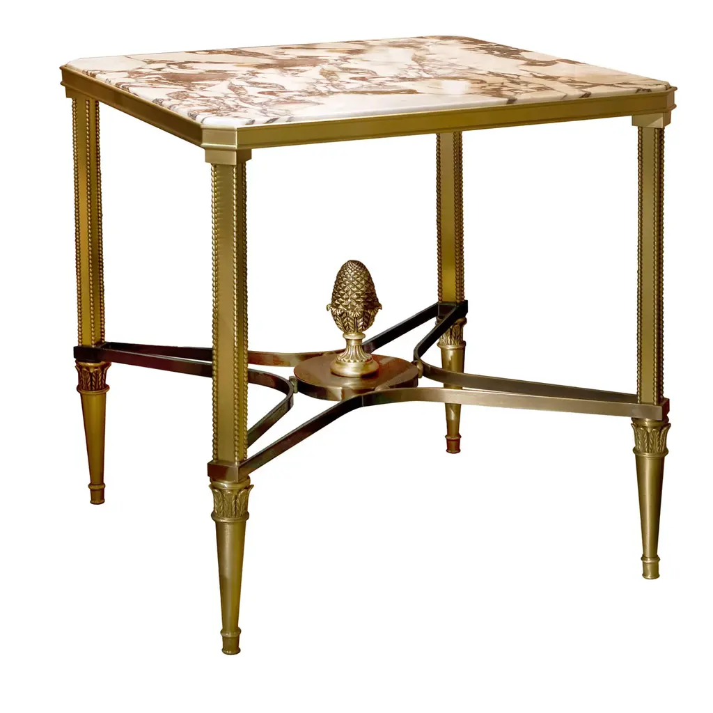 Indulging in rich hand-carved details, this side table is a minute reproduction of an original Victorian-age design (1837-1901). Superb carved detailing lend textural complexity to the legs' extremities, which contrast with the natural grain of the briar veneer accenting the frame's top sides. A top in superb Breccia Pernice marble and a four-form stretcher with finial complete the design.