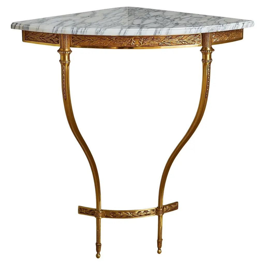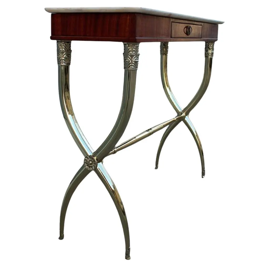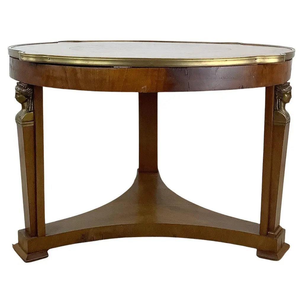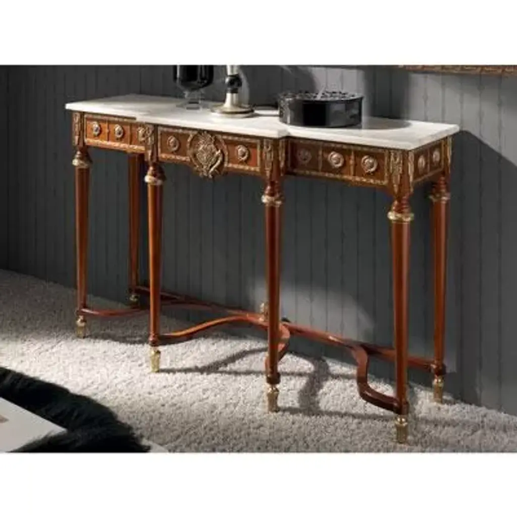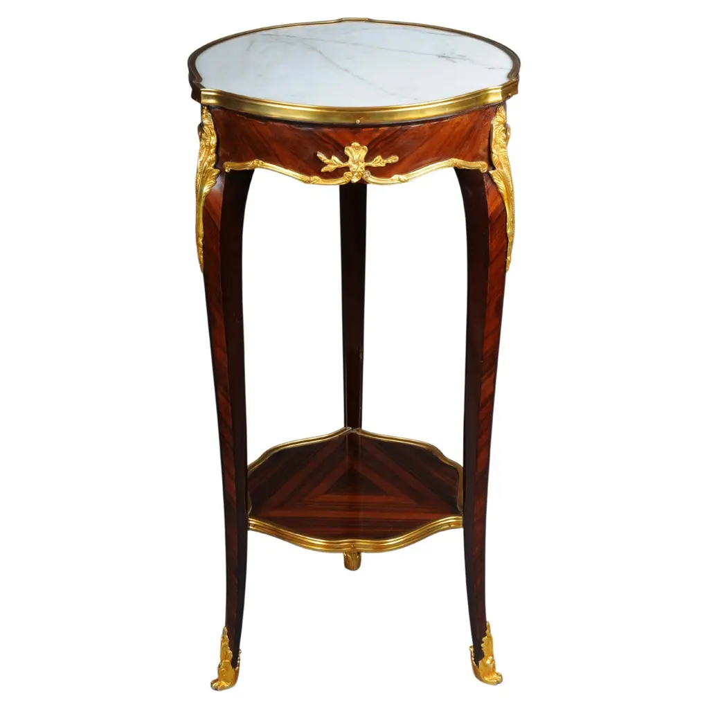Indulging in rich hand-carved details, this side table is a minute reproduction of an original Victorian-age design (1837-1901). Superb carved detailing lend textural complexity to the legs' extremities, which contrast with the natural grain of the briar veneer accenting the frame's top sides. A top in superb Breccia Pernice marble and a four-form stretcher with finial complete the design.
