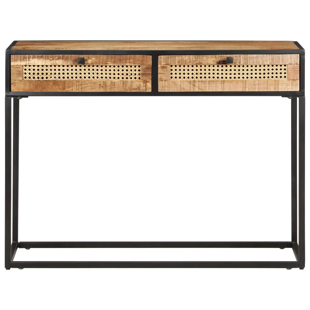 If you're looking for a simple touch of rustic charm to add to your interior decor, this solid mango wood console table is here!Solid mango wood is a tropical hardwood. It on the one hand has the strength to bear the weight, and on the other hand stands the wear and tear of time. Additionally, the exquisite craftsmanship and beautiful wood grains make every piece of side tables slightly different from the next. The hall table is equipped with ample storage room, so you can display or keep any items you'd like well organized. The iron frame contributes to its sturdiness and stability. What's more, the table for under mirror features hand-woven cane patterns on the drawers, adding to its rustic charming.Important note: The colors vary from piece to piece, making each wooden console table unique.