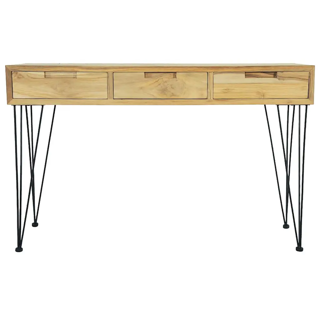 This 47.2 in long rustic console table is a gorgeous mix of style and usefulness, made to lift the vibe of any room while giving you a practical storage option. Crafted from solid teak wood and tough wrought iron, this handy piece is perfect for hallways, living rooms, or study spaces, fitting seamlessly into any home decor with its lovely colonial and rustic charms. Sturdy Build: This console table is made from solid teak wood, known for its durability and strength, ensuring it can handle everyday use and keep looking good over time.Loads of Storage: It features three roomy drawers, giving you a good storage option for keys, mail, or decorative items, helping keep your space neat.Stylish Design: The blend of wood and wrought iron adds an industrial touch, making this piece a standout addition to your entryway or hallway.Textured Look: The table’s textured top adds a tactile touch to its look, making it easy to clean and care for.Flexible Use: Use it as a side table, desk, or display area to create a functional but stylish corner in any room.