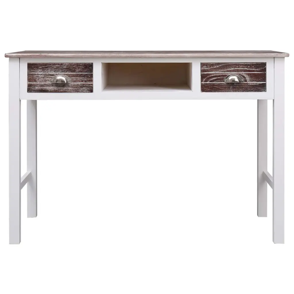 This vintage-style writing desk is a lovely mix of design and practicality. Perfect for a study, office, or living room, it works as a stylish workspace or a decorative console table to brighten up any room. Ergonomic Design: This writing desk is cleverly designed to keep you comfy during long sessions of writing or working on a laptop. The height and proportions make sure you're at the right ergonomic spot, helping you get things done without any strain. Ample Storage: With two roomy drawers and a built-in shelf, it has plenty of space for everything from office supplies to personal items. Say goodbye to mess with this smart storage solution. High-Quality Materials: Made from solid Paulownia and Poplar wood, this desk is built to last and looks timeless. The varnished finish adds a touch of elegance while making sure it can handle everyday use. Stylish Appearance: The desk’s vintage vibe with its brown and white tones makes it an attractive piece that fits right in with modern or classic decor. Adaptable Use: This desk isn’t just for writing; it’s also a great computer workstation or side table that boosts functionality in any room like the office, study, or living space.