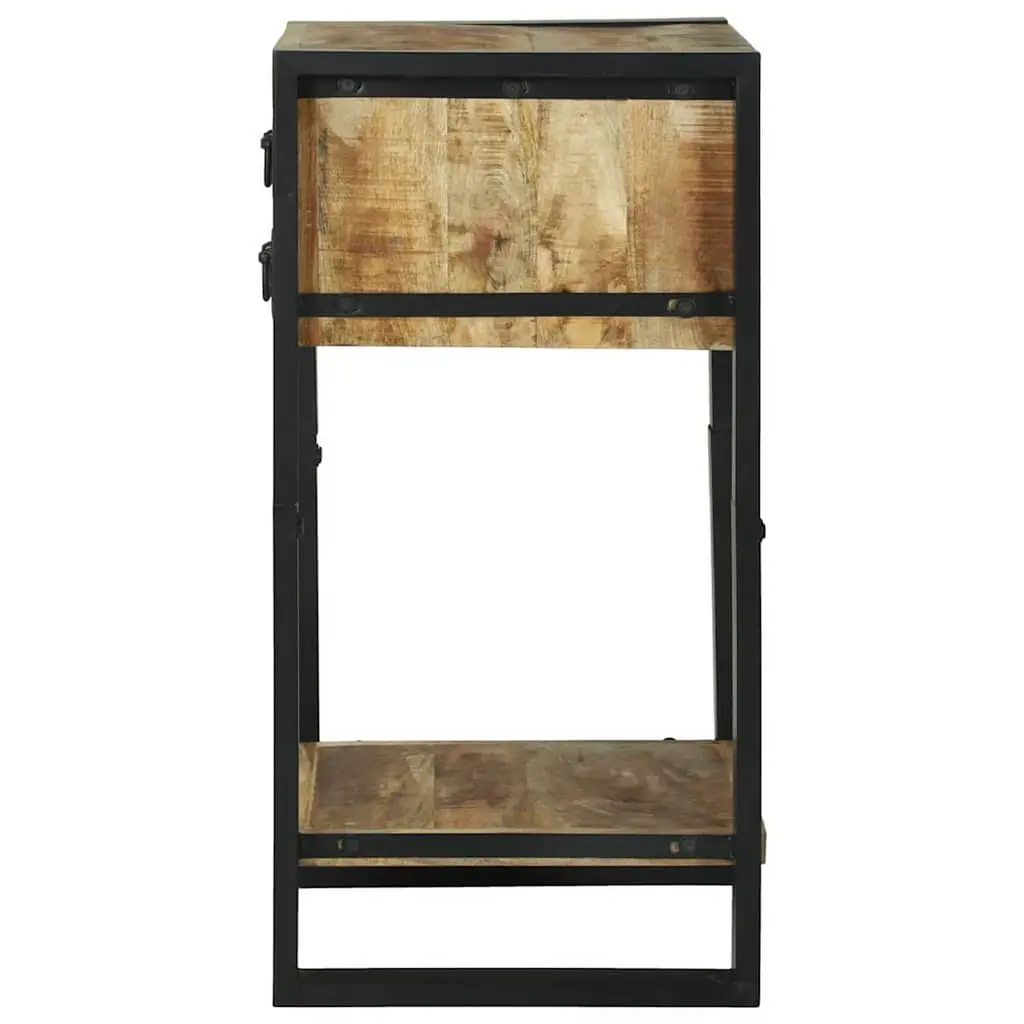 This Rustic Wooden End Table adds a lovely natural touch to your living room. Its Opaque, Rectangular shape features a naturally Textured surface that blends rustic charm with modern practicality thanks to its steel accents. Placed beside your couch or chair, its sturdy design works with various interior styles and offers loads of functionality for anyone looking for a mix of character and usefulness. Versatile End Table: With a size of 15.7 x 15.7 x 31.5 in, this end table fits perfectly beside sofas and chairs, giving you a practical yet stylish spot for lamps, books, or decorations. Its compact shape makes it spot-on for apartments or snug spaces.Robust Materials: Built from tough materials including a steel frame and legs, with a matte finish, this table is made to last. The strong steel gives it stability, and the wood adds a nice textured touch that goes with different styles.Integrated Storage: With a shelf and drawer, this end table maximizes storage without skimping on looks. Keep your living area tidy by hiding away remotes, magazines, or other bits and bobs in the hidden spaces.Rustic Style: The rustic vibe of the table brings a warm, welcoming feel to any room. Its unique finish works well with modern and traditional interiors alike, making it feel comfy and homey.Maintenance & Care: To keep it looking sharp, steer clear of harsh chemicals and scrubbing. Just wipe it down with a dry cloth. A little care goes a long way in keeping this table a classic part of your decor.