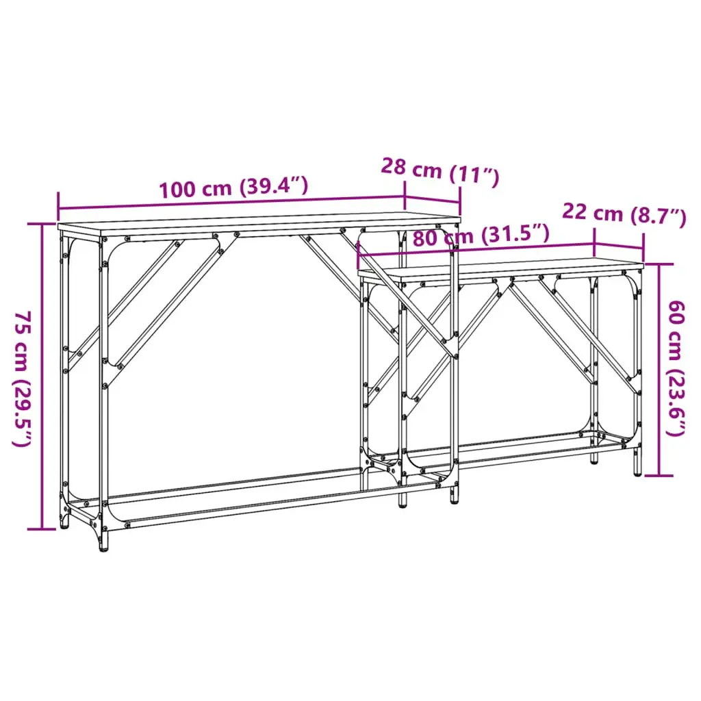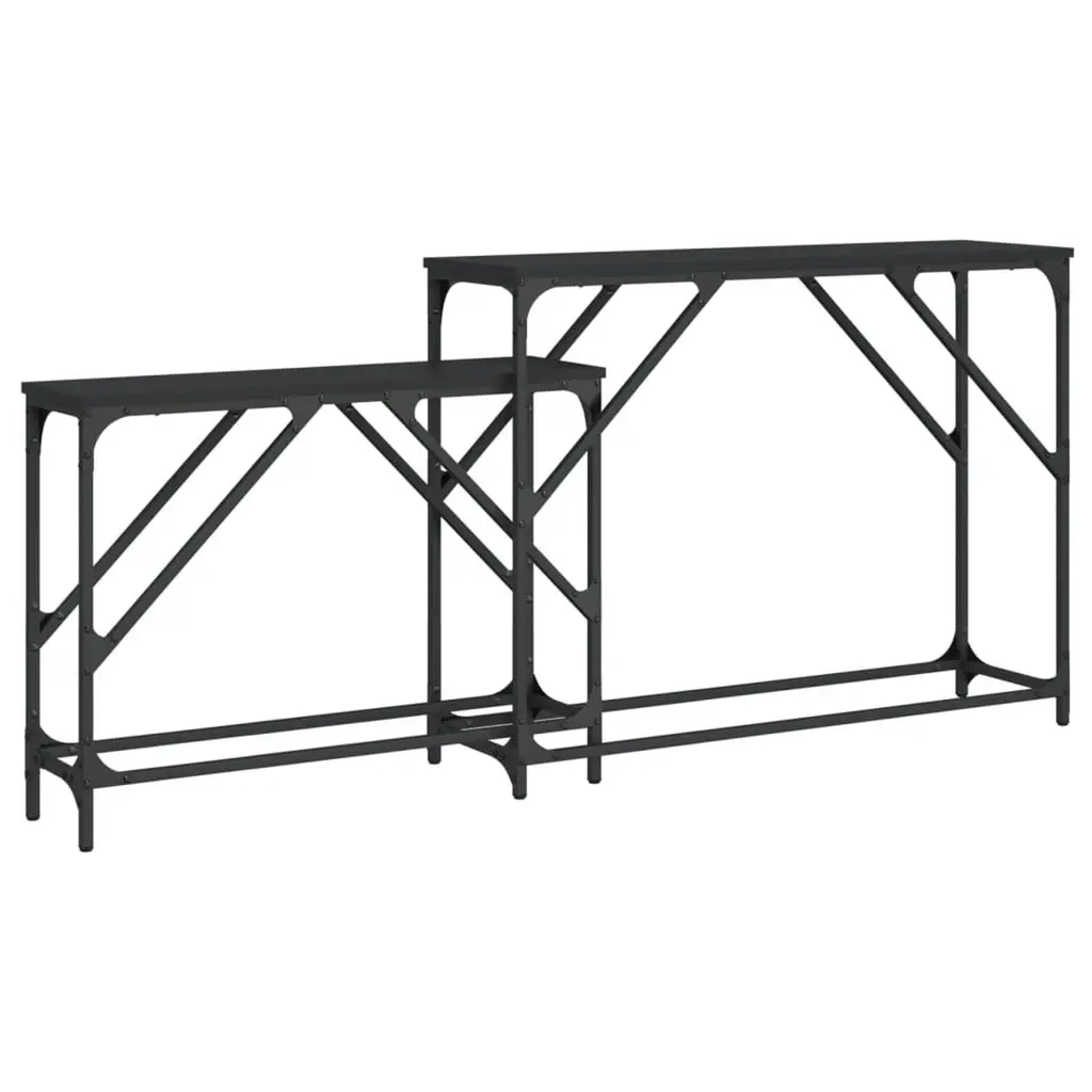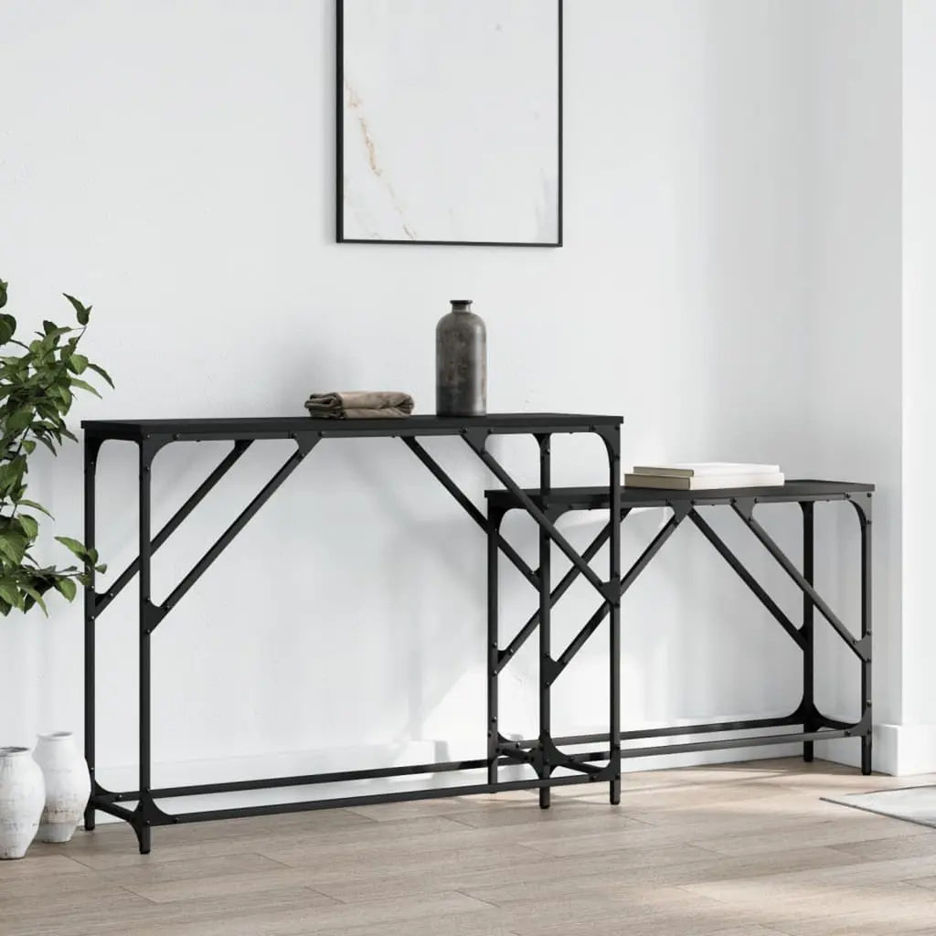 This set of 2 nesting console tables combines style and practicality, making it perfect for anyone wanting to upgrade their living space. Whether in the hallway, living room, or office, the sleek black look and compact size add a modern touch, all while keeping utility in check in smaller spots. These tables fit snugly together or can be used apart, giving you flexibility based on what you need. Optimal Space Management: The nesting feature lets you use minimal space without sacrificing style.Robust Build: Made from engineered wood with a matte finish, these tables are created to handle everyday use while looking sleek.Effortless Cleaning: The smooth surface is easy to look after; a gentle cleaning solution keeps them looking fresh.Universal Appeal: The industrial style blends seamlessly with various interiors, enhancing both modern and traditional decor.Functionality at Its Best: These tables work great as hallway furniture, sofa tables, or side tables in any room.