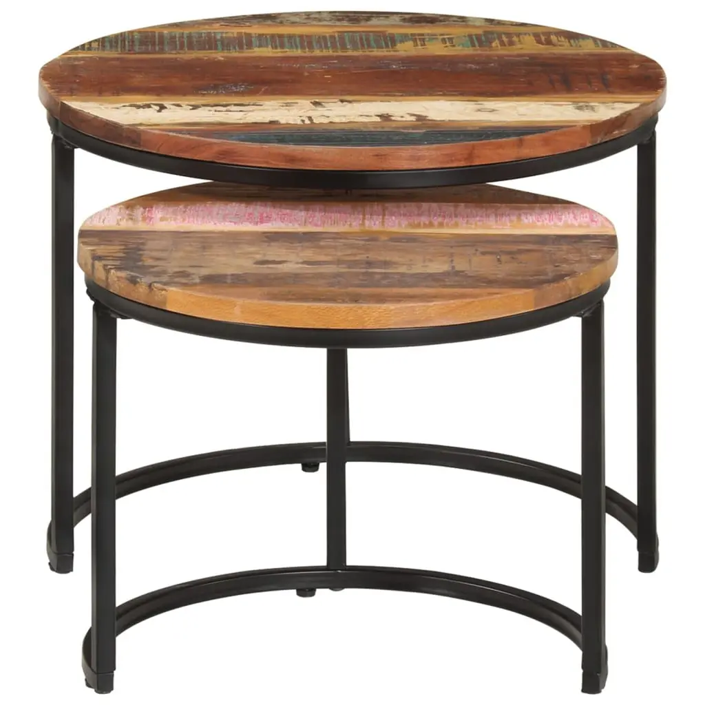 This rustic nesting table set brings together style and practicality, making it perfect for any living space. With two round tables made from solid reclaimed wood, they add a warm and inviting feel, whether used as accent tables or side tables. The rustic charm of solid reclaimed wood gives each table a unique character, showing off natural imperfections and different grain patterns.These nesting tables are super versatile and can be easily stacked together, saving space without sacrificing style.The elegant round shape and smooth finish make them perfect for both practical use and aesthetics, enhancing any room decor.The solid powder-coated iron frame ensures stability and durability for daily use while keeping them looking good.Whether you're hosting a party or just chilling out, these tables are great for coffee or as charming side pieces suitable for different settings.