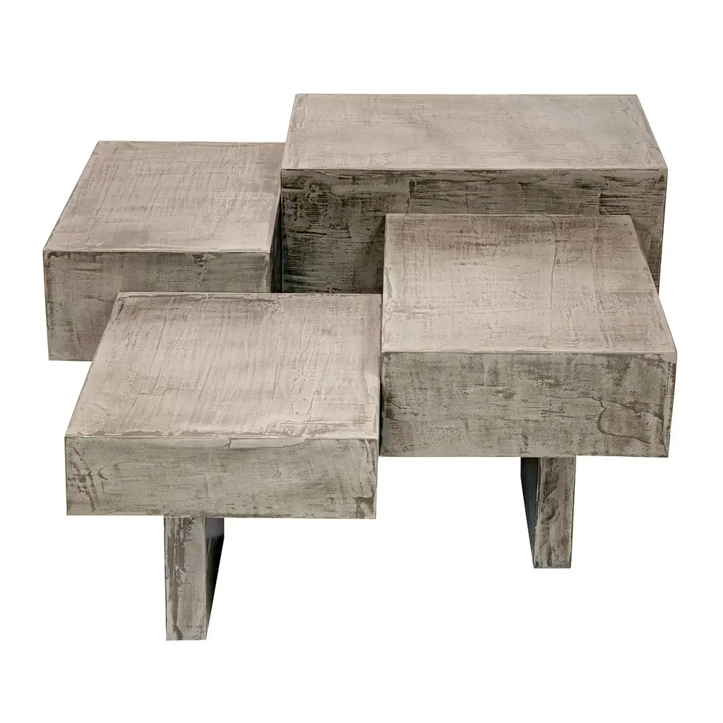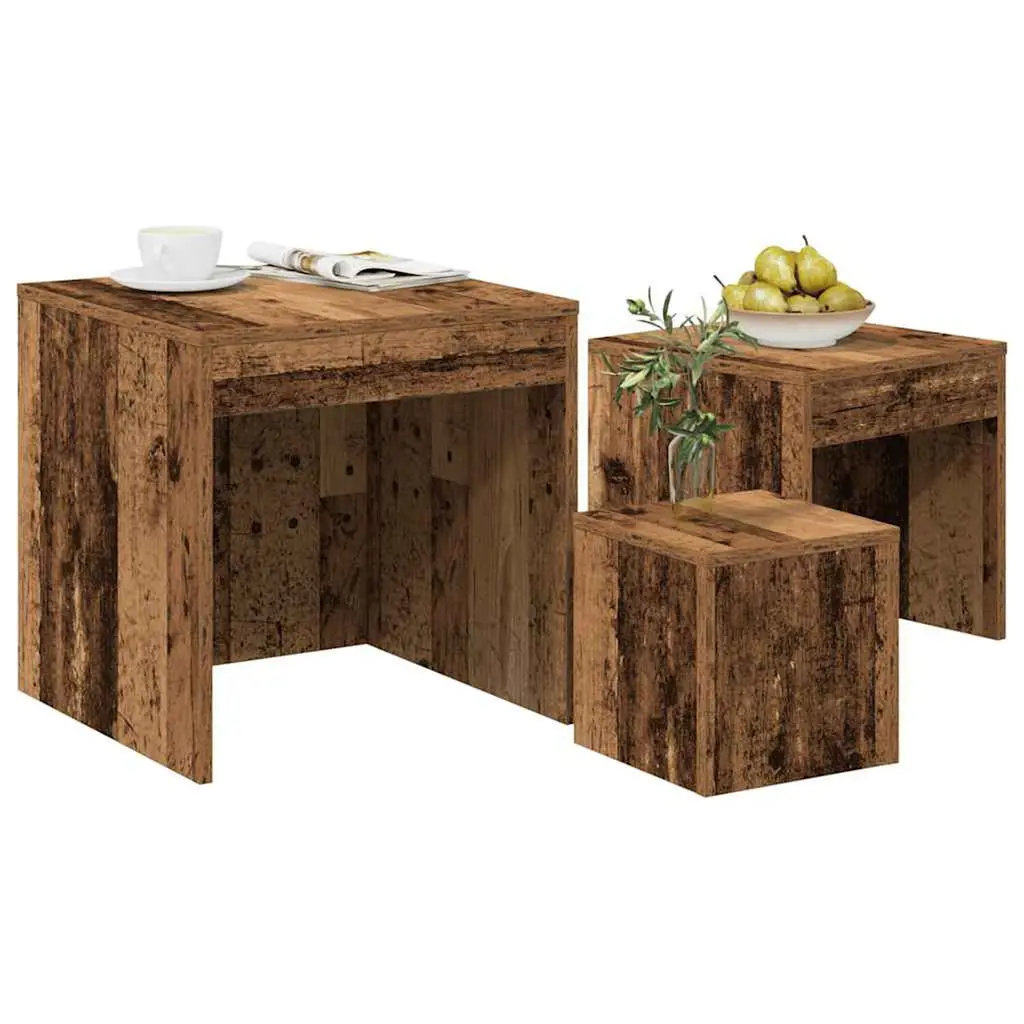 This nesting table set includes three elegantly designed tables that add to the functionality and style of your living areas. Made from top-notch engineered wood with an old wood finish, these tables are great for serving coffee or showing off decorative bits while fitting in with any modern decor. Exceptional Craftsmanship: Each nesting table is built with care to ensure it's durable and functional for ages. The smooth surface is super inviting for gatherings or fancy events.Versatile Use: Great for different settings like serving coffee in the living room or as handy bedside tables, providing convenience without taking up too much space.Stylish and Functional: The sleek lines and matte finish give a modern vibe, making these tables perfect for minimalist or eclectic home styles without giving up on function.Compact Storage: The stackable design lets you store them flexibly, helping keep your home tidy and making the most of your space when not in use.Easy Care: The engineered wood is easy to clean, requiring just a quick wipe with a dry cloth to keep them looking great.