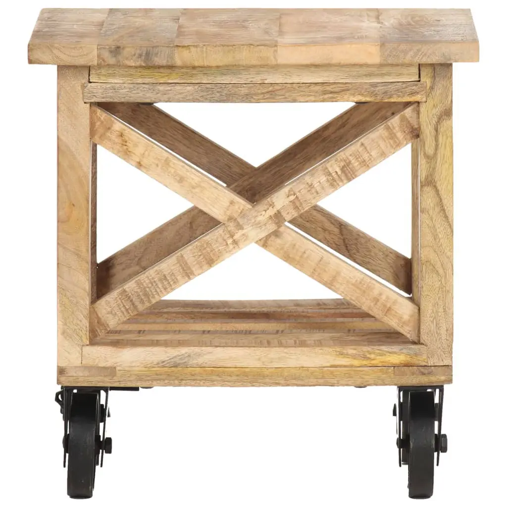 This classy side table is a blend of design and function, made from solid rough mango wood that looks stunning. It has a vintage vibe that can make your living space look fab, perfect for holding drinks, snacks, or your laptop while you chill. Versatile Usage: This end table is perfect for coffee serving, as a laptop holder, or as a side cabinet. Enjoy the flexibility for your everyday needs.Handcrafted Design: Every table is unique, showing the natural textures and colors of mango wood, adding a rustic yet chic touch to interiors.Easy Mobility: With four sturdy wheels, this side table can be moved around easily, perfect for when you're rearranging your space.Dimensions: Measures 15.7 in x 15.7 in x 16.5 in, ideal for smaller living areas and fits perfectly beside sofas or chairs.Indoor Use: Made just for indoor settings, it makes a great functional accent piece in living rooms, kitchens, and studies.