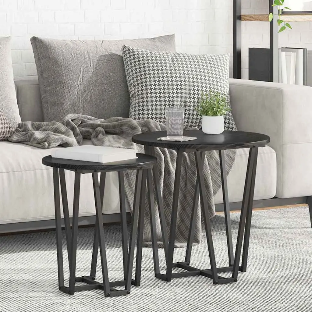This Engineered Wood Side Table Set is the epitome of industrial style, effortlessly fusing raw materials with functional design. It's just right for urban loft-inspired living rooms and comes with two versatile tables. Their round shape fits in nicely with different furniture setups, while the engineered wood surface and metal frame give you both durability and contemporary flair. Premium Materials The engineered wood tops feature intricate grain patterns that create an authentic industrial feel. Paired with sturdy black metal frames, these tables are built to last and look great in both modern and traditional decors. Functional Design The round tables nest together nicely, giving you flexibility in how to arrange your room. Use them separately for lamps or together as a statement piece; they adapt easily to whatever you need. Assembly Required You'll need two people armed with a screwdriver for assembly. Clear design instructions make for a straightforward and stable setup. Room Placement Specifically made for indoor living spaces, these tables fit perfectly beside sofas or chairs, making them great surfaces for drinks, books, or decorative items. Maintenance Details Super easy to maintain, all they need is a damp cloth for cleaning. This simple routine keeps them looking fresh and contributes to their lasting charm and functionality.