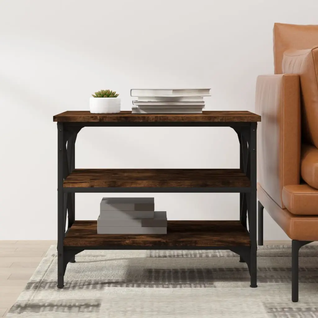 This Industrial Style Side Table brings together practicality and style, made with high-quality engineered wood and iron. Its striking smokey oak finish creates a fantastic centerpiece for your living room, seamlessly blending form and function, whether you're displaying decor or serving drinks in style. Ample Storage: This side table has two big shelves for stashing books, remotes, or decor items, keeping your space tidy.Robust Design: Its industrial-inspired look with solid black metal legs and a wooden surface blends perfectly with contemporary decor.Durable Materials: Made with tough engineered wood and iron, this side table is built to last, maintaining its stylish appearance even with daily use.Elegant Finish: The matte finish looks sophisticated and is easy to clean, making it a practical addition to any indoor space.Versatile Use: Great in different rooms like the living room, bedroom, or hallway, it fits various decor styles and can be used as both a decorative surface and extra storage.