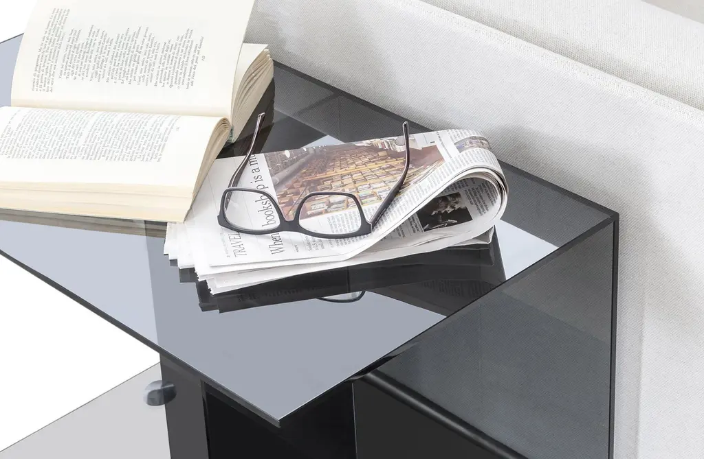 Vine has a utility that is often lost in glass design. Impeccable Italian glass cut with precision. Combined with a table top that slides over your sofa and has space to store magazines, liquor or other items. This is a limited edition collection. Suitable for residential and commercial use. Made in Italy.