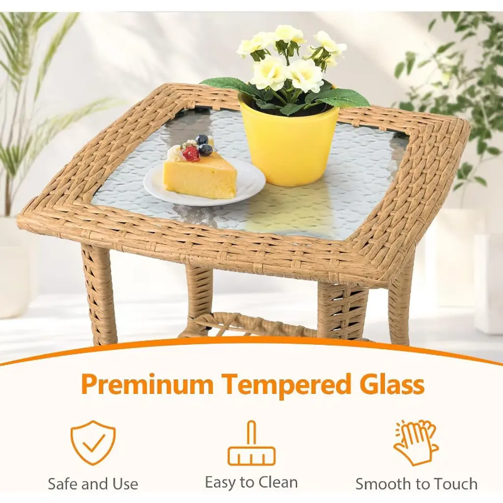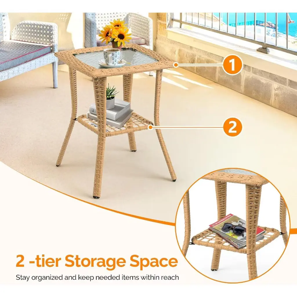 Vingli Outdoor Side Table With Storage Wicker Patio Side Table, Tempered Glass Top End Table For Balcony Porch Deck