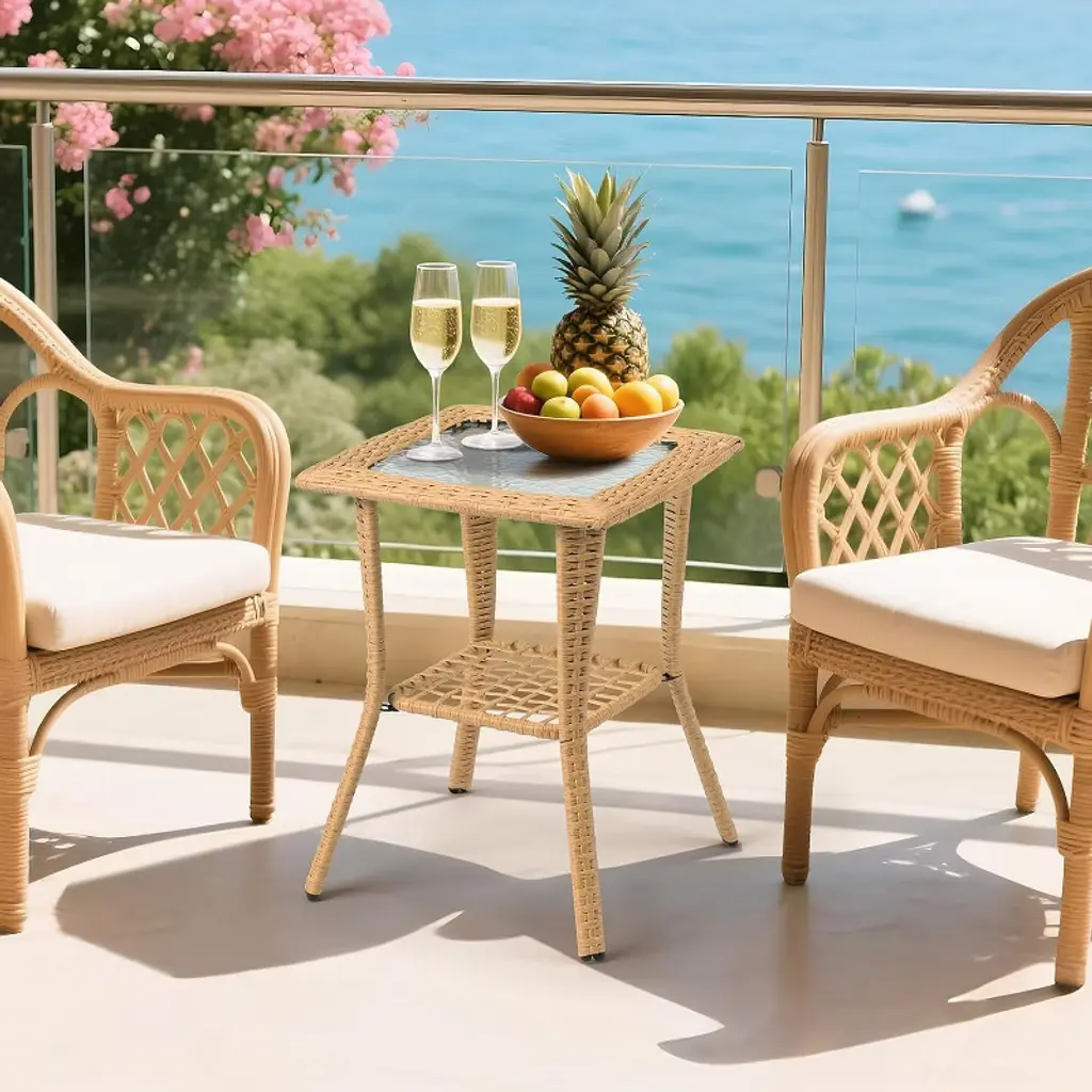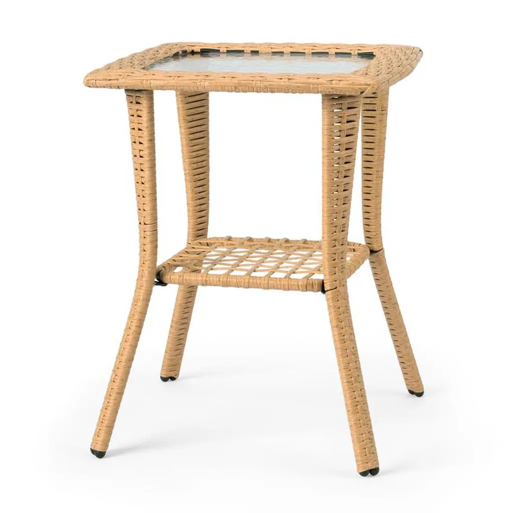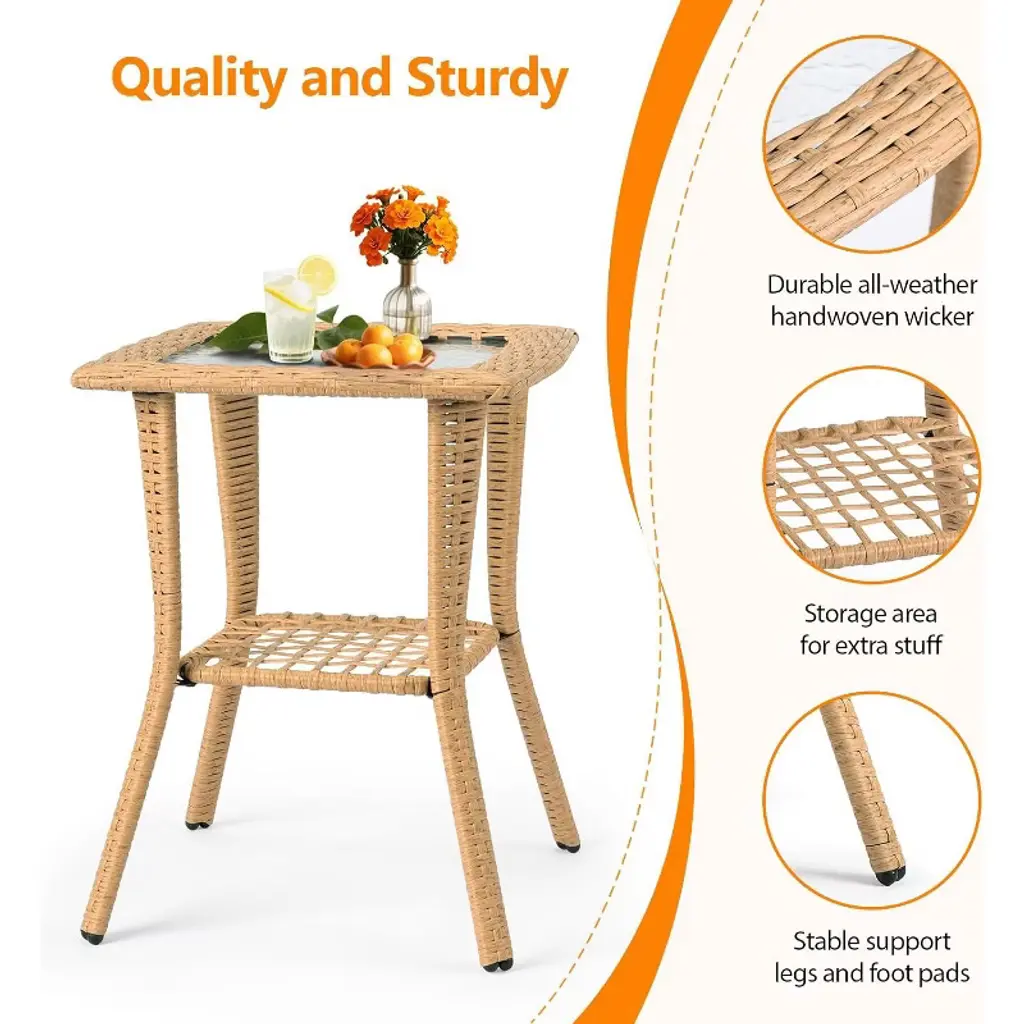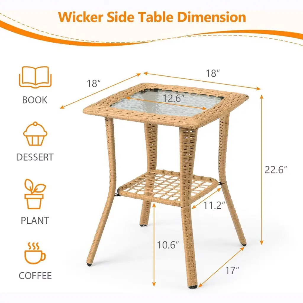 Product Description This wicker outdoor side table combines sleek modern design with practicality. The table features a sturdy wicker construction, ensuring durability and longevity. The tempered glass tabletop adds a touch of sophistication and is easy to clean, while the lower storage shelf provides ample space for your books, magazines, or other essentials. This side table is not just a piece of furniture, but a style statement that will enhance any room. Specifications: 1. Material: PE Rattan, Iron, Tempered Glass 2. Overall Size: 18” x 18” x 22.6"(L x W x H) 3. Storage Space Height: 10.6in 4. Load Bearing: 110 lbs