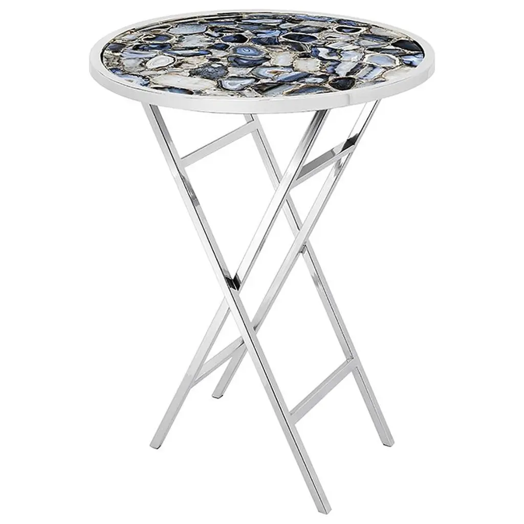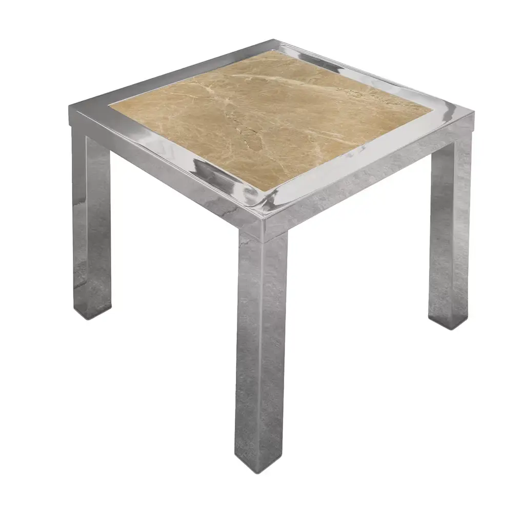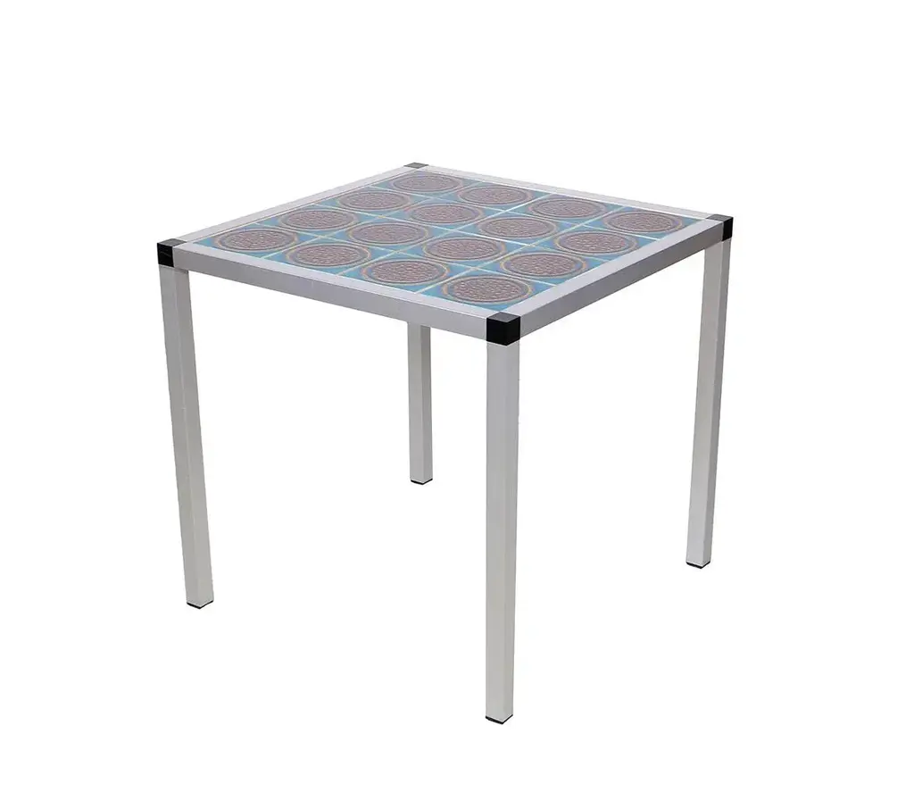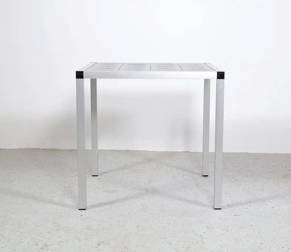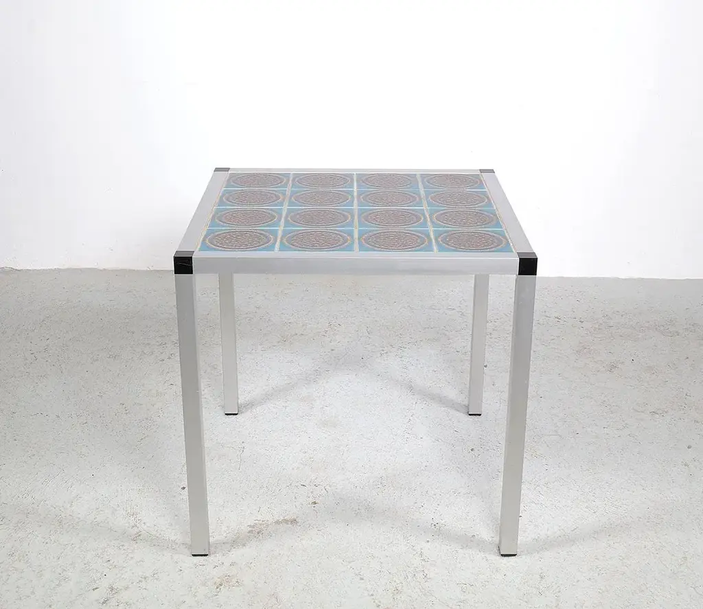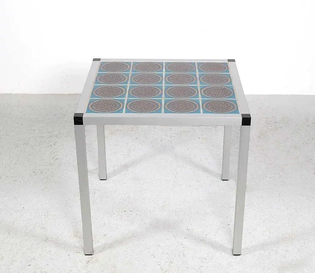 Vintage Danish design metal side table with tiles in a beautiful aqua color made in the 1970s. The frame is made of matte metal with black corners. The top is inlaid with decorative squares of glazed tiles in aqua blue with orange and purple accents.
